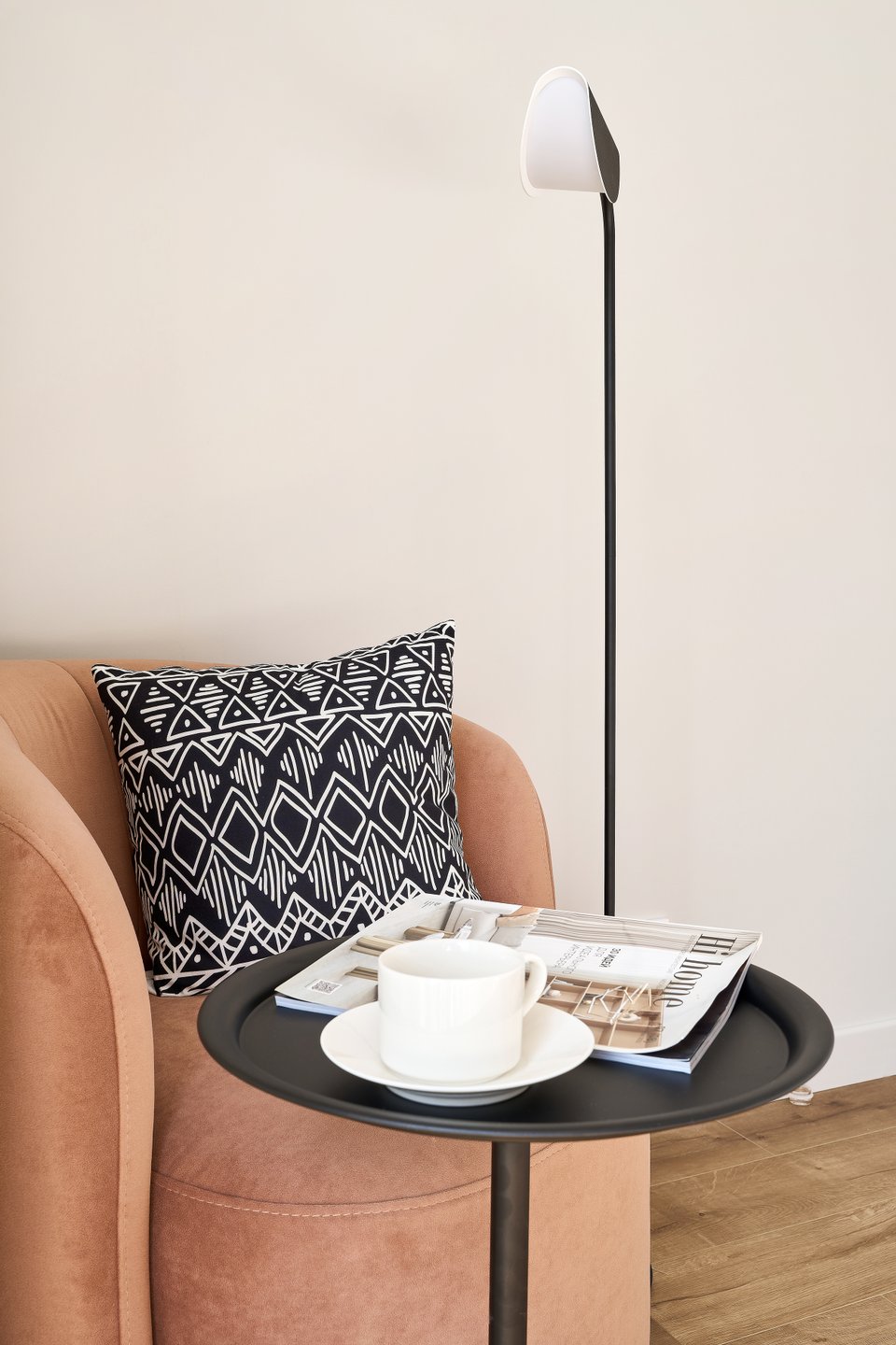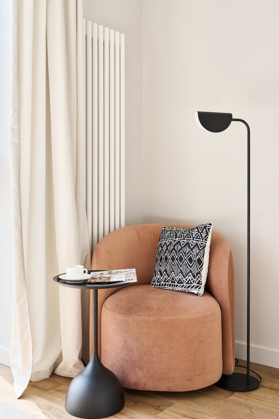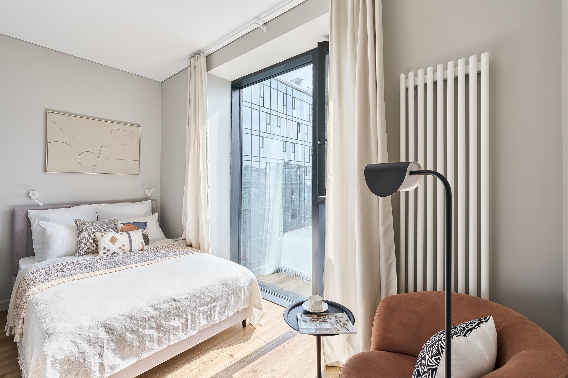 «Для спальни мы сознательно выбрали кровать вместо дивана. Это повышает комфорт для будущих жильцов и выгодно выделяет интерьер среди конкурентов. При этом хотелось создать отдельную зону для просмотра телевизора и отдыха с книгой. Поскольку диван не помещался, организовали уютную зону с креслом, столиком и торшером», — рассказывает дизайнер.