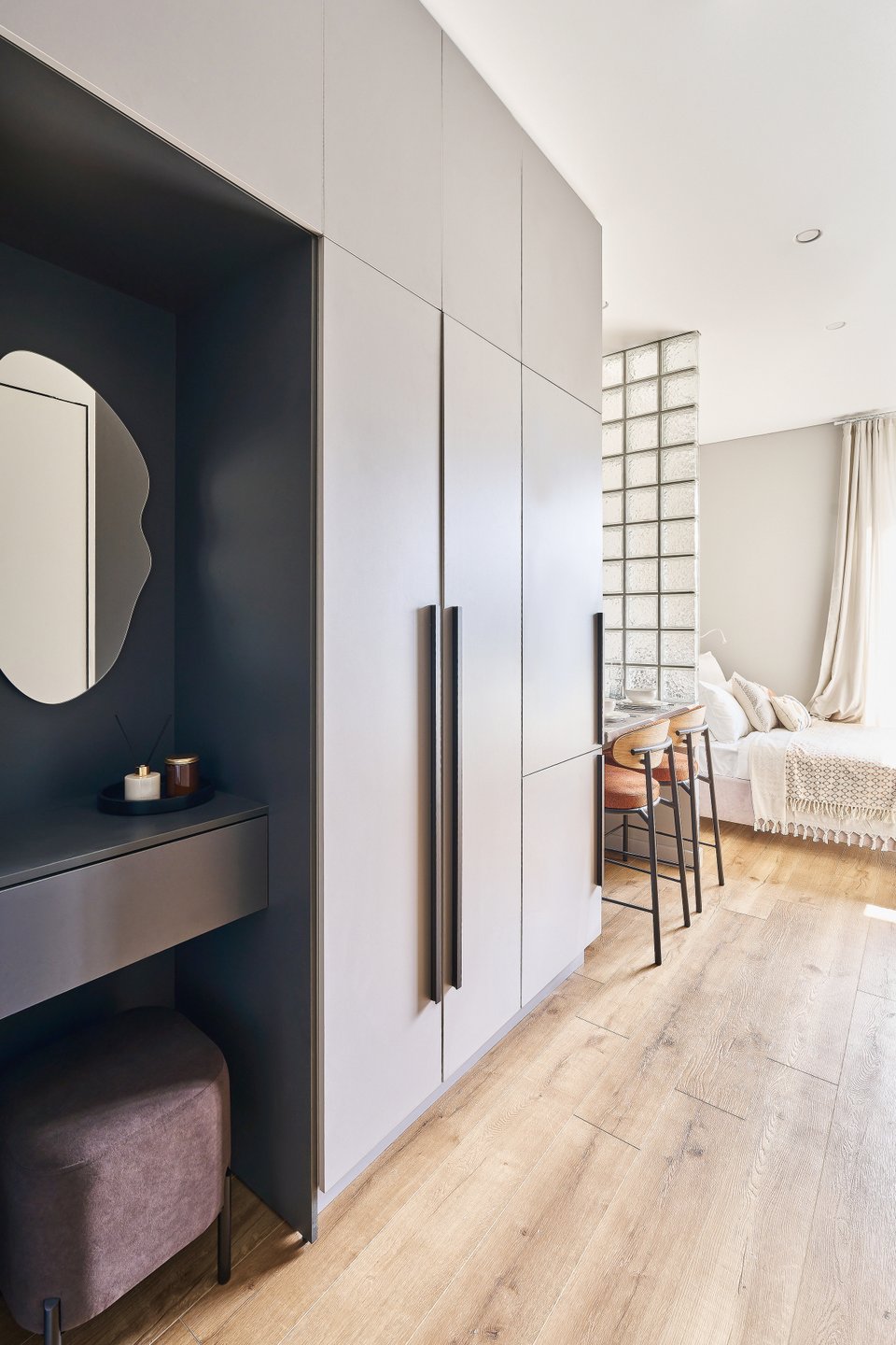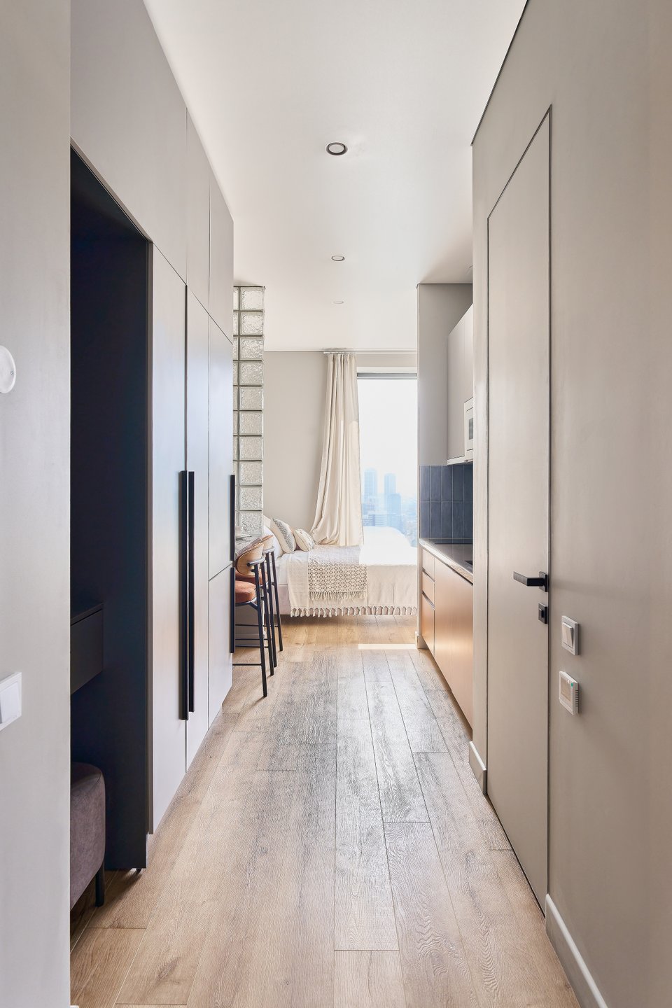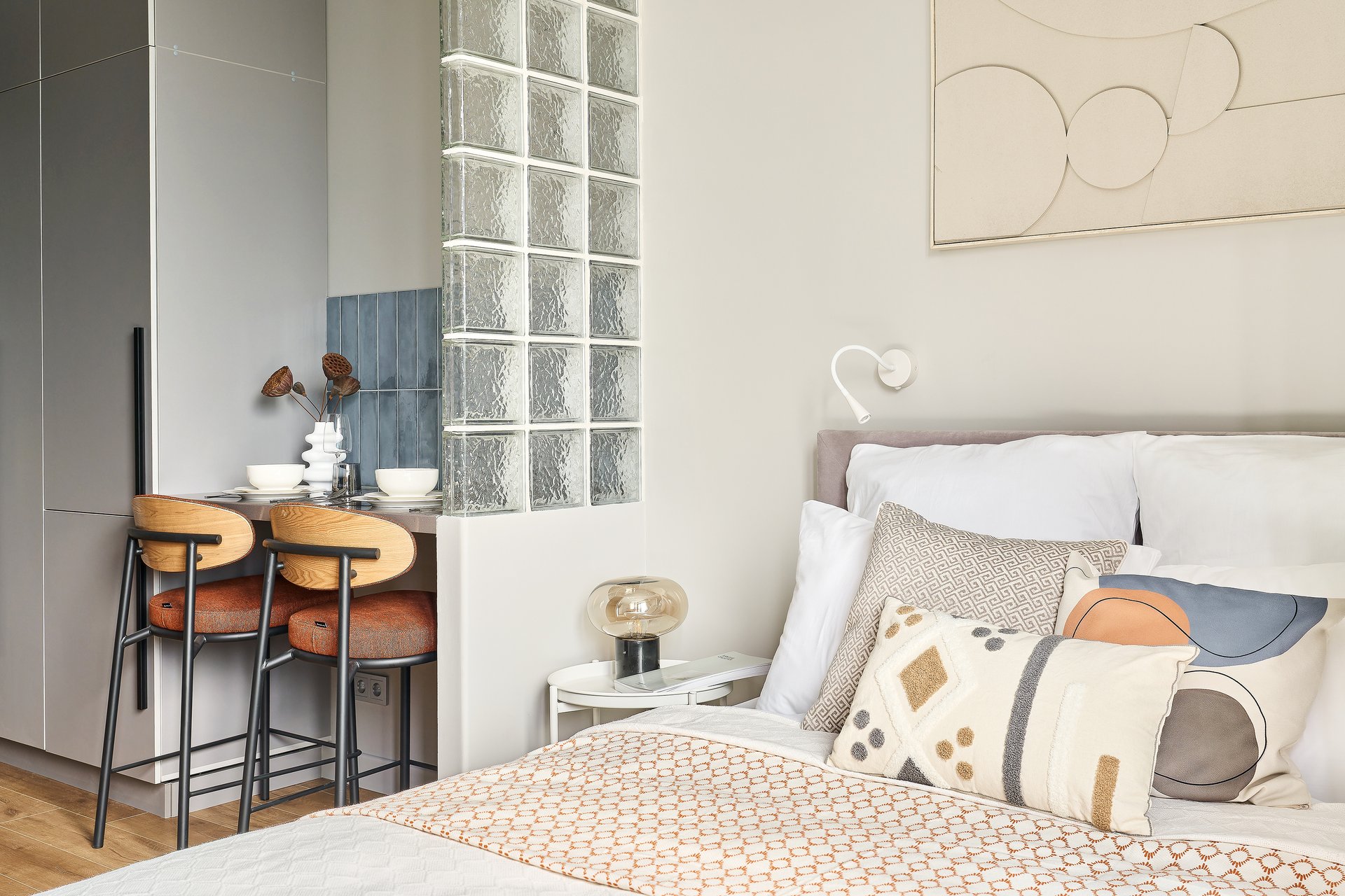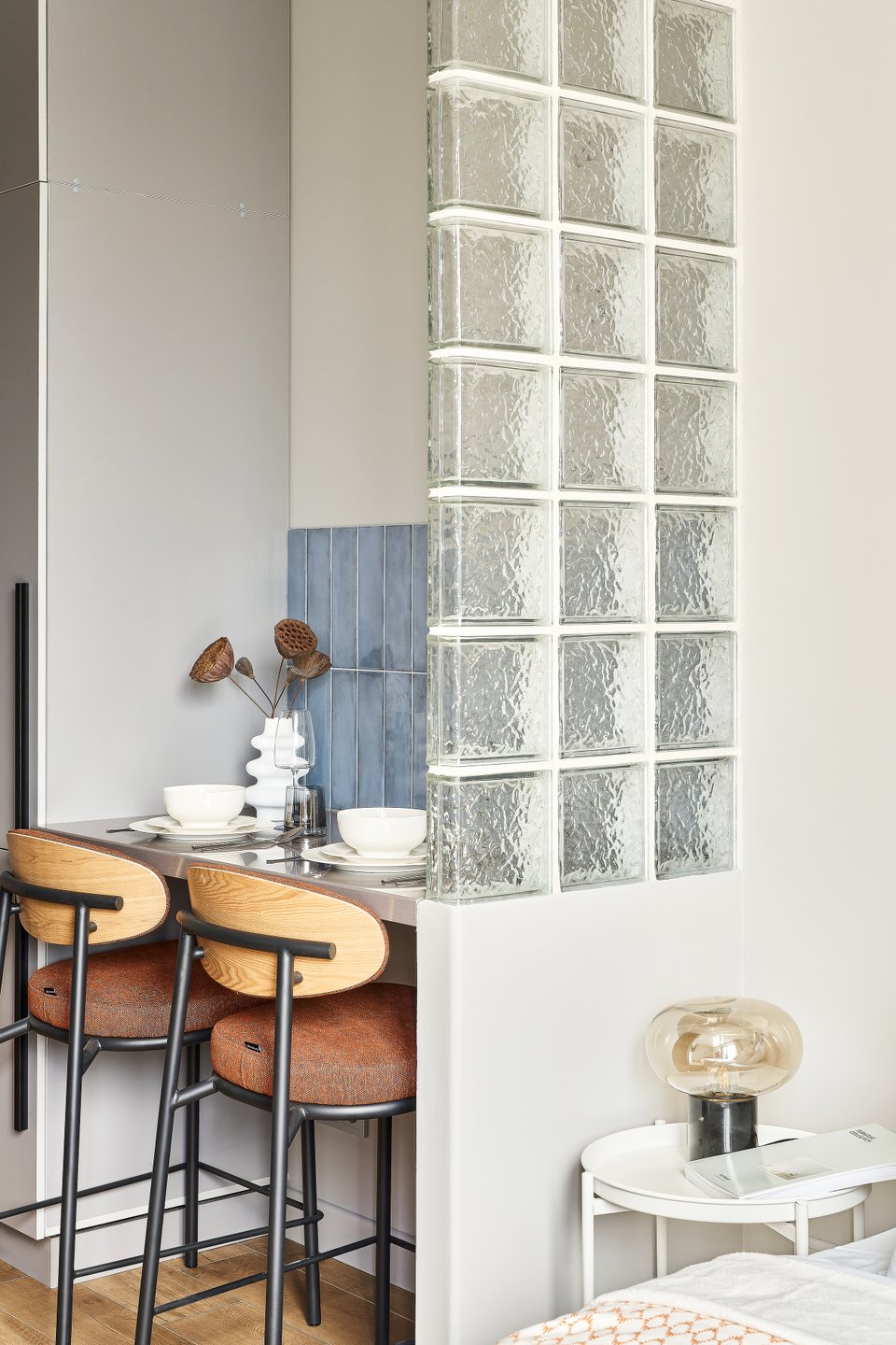 Прием: чтобы отделить кухонную зону от зоны отдыха, выстроили перегородку из стеклоблоков. В дневное время в обеденную зону и в прихожую попадает естественный свет, но при этом изголовье кровати скрыто от посторонних глаз.