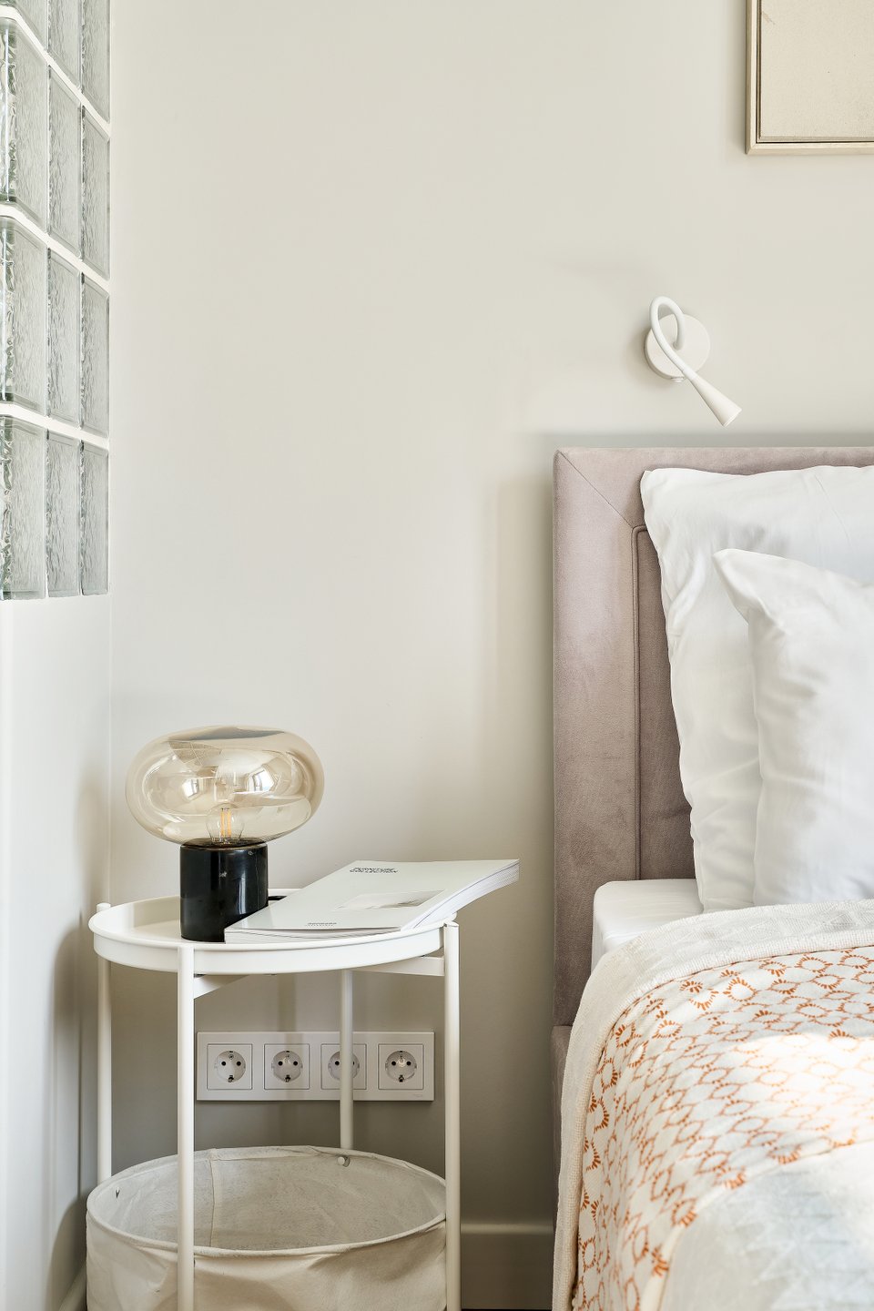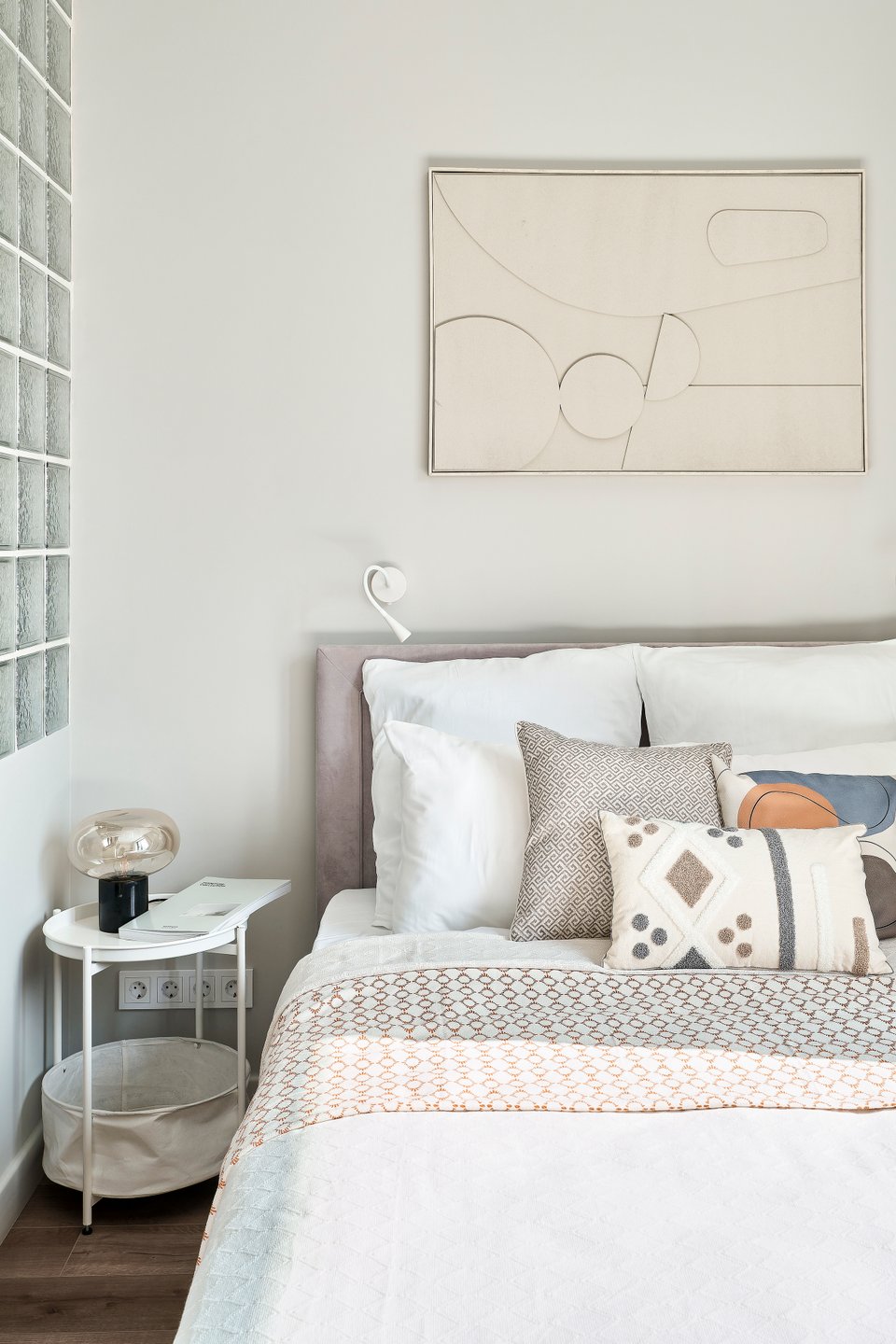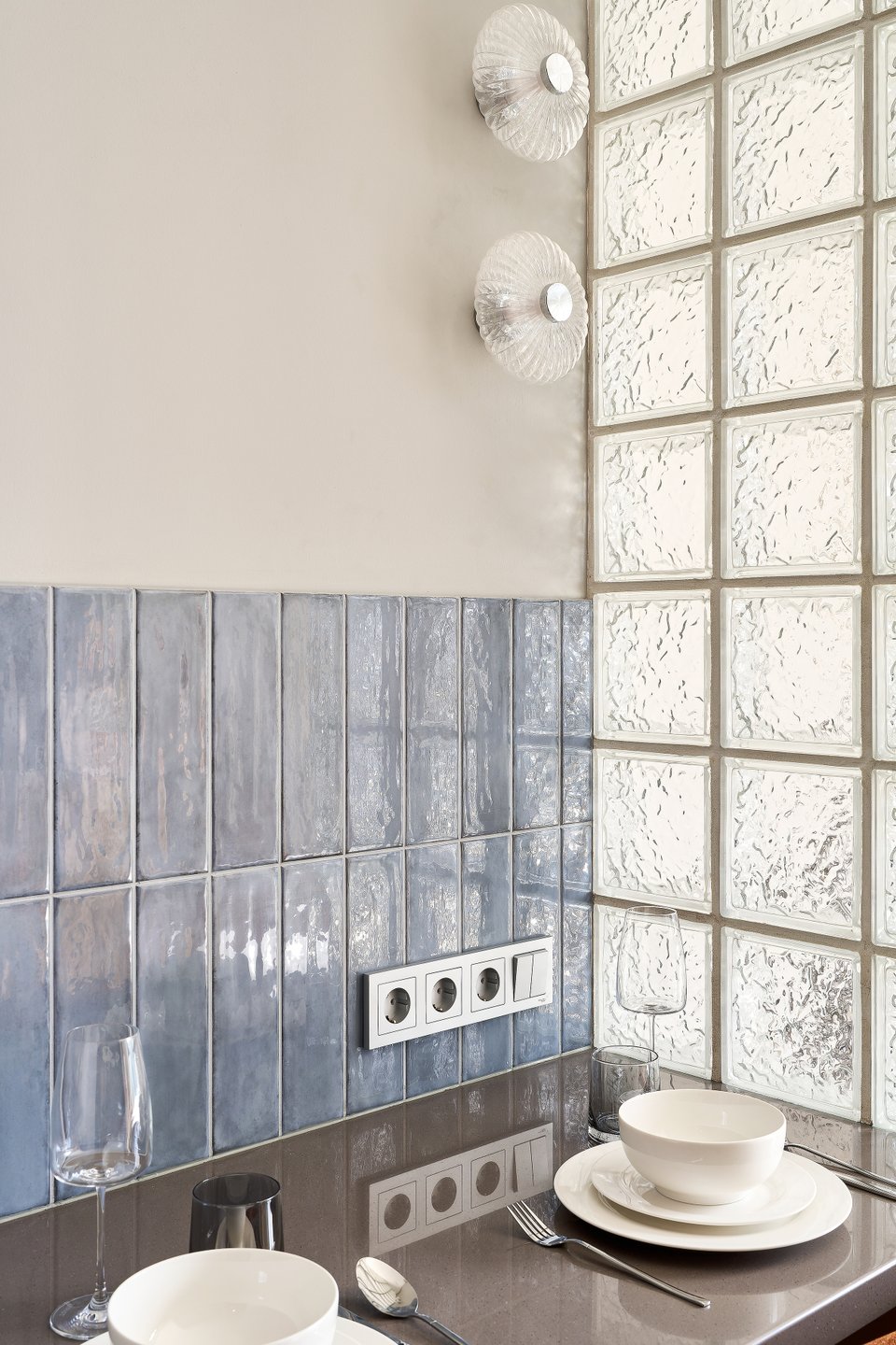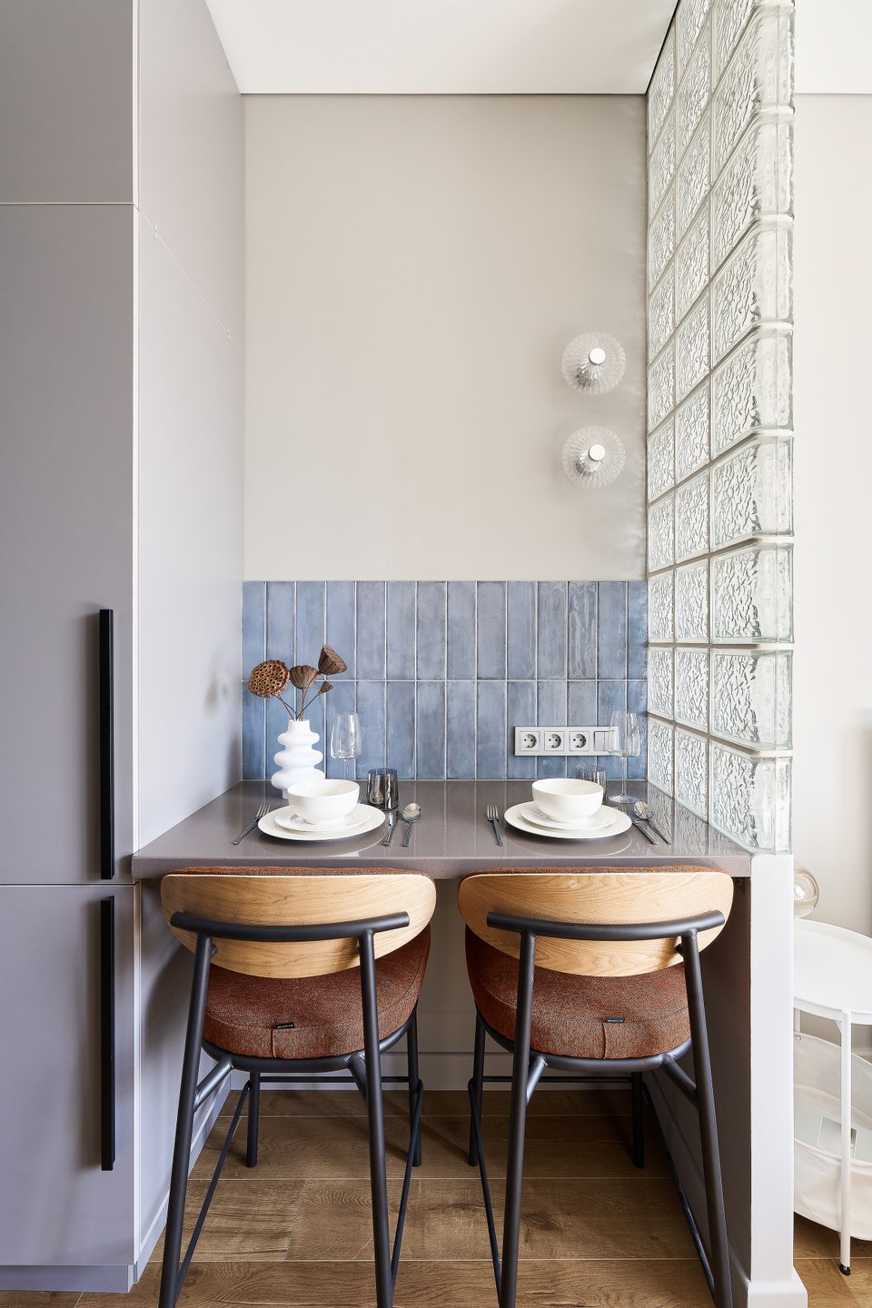 Прием: чтобы отделить кухонную зону от зоны отдыха, выстроили перегородку из стеклоблоков. В дневное время в обеденную зону и в прихожую попадает естественный свет, но при этом изголовье кровати скрыто от посторонних глаз.