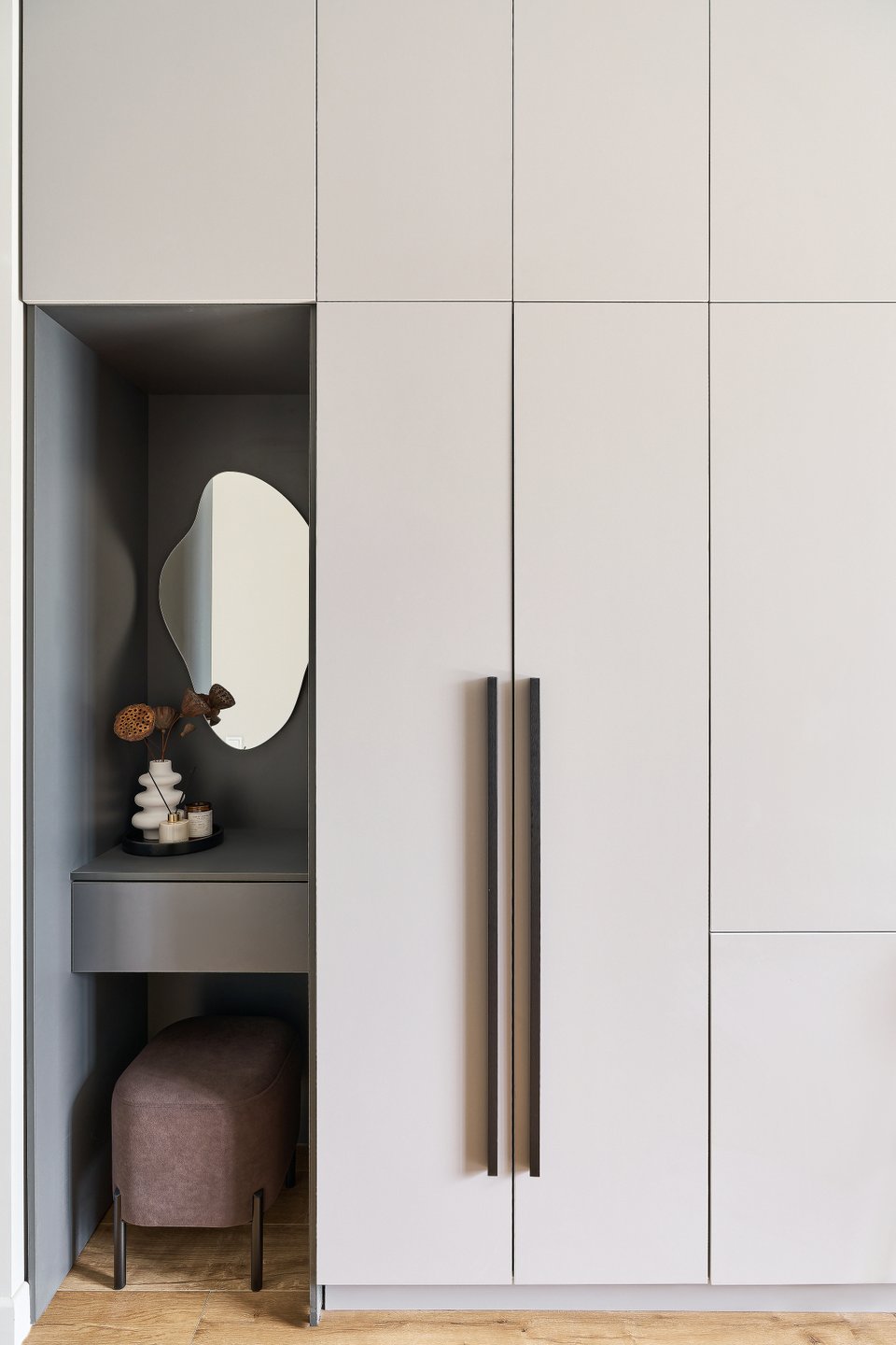 Шкафы в прихожей выполнены на заказ. В них предусмотрено размещение верхней сезонной одежды и обуви, скрыт электрический щит и роутер, а также есть секции для хозинвентаря. В правой части шкафа — в зоне кухни — разместили встроенный холодильник. Также в прихожей есть небольшой пуф и зеркало необычной формы.