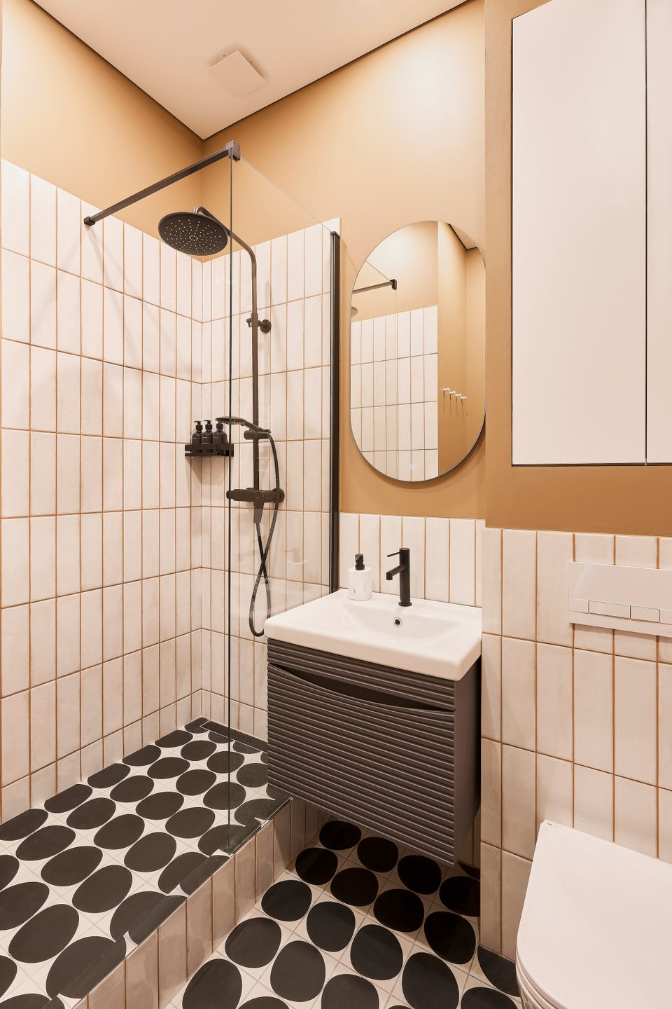 Санузел — самая яркая зона в квартире. Цвет не находится в зоне постоянного видения, поэтому не успеет надоесть. Тут можно быстро «взбодриться» и уйти обратно отдыхать в спокойную спальню.