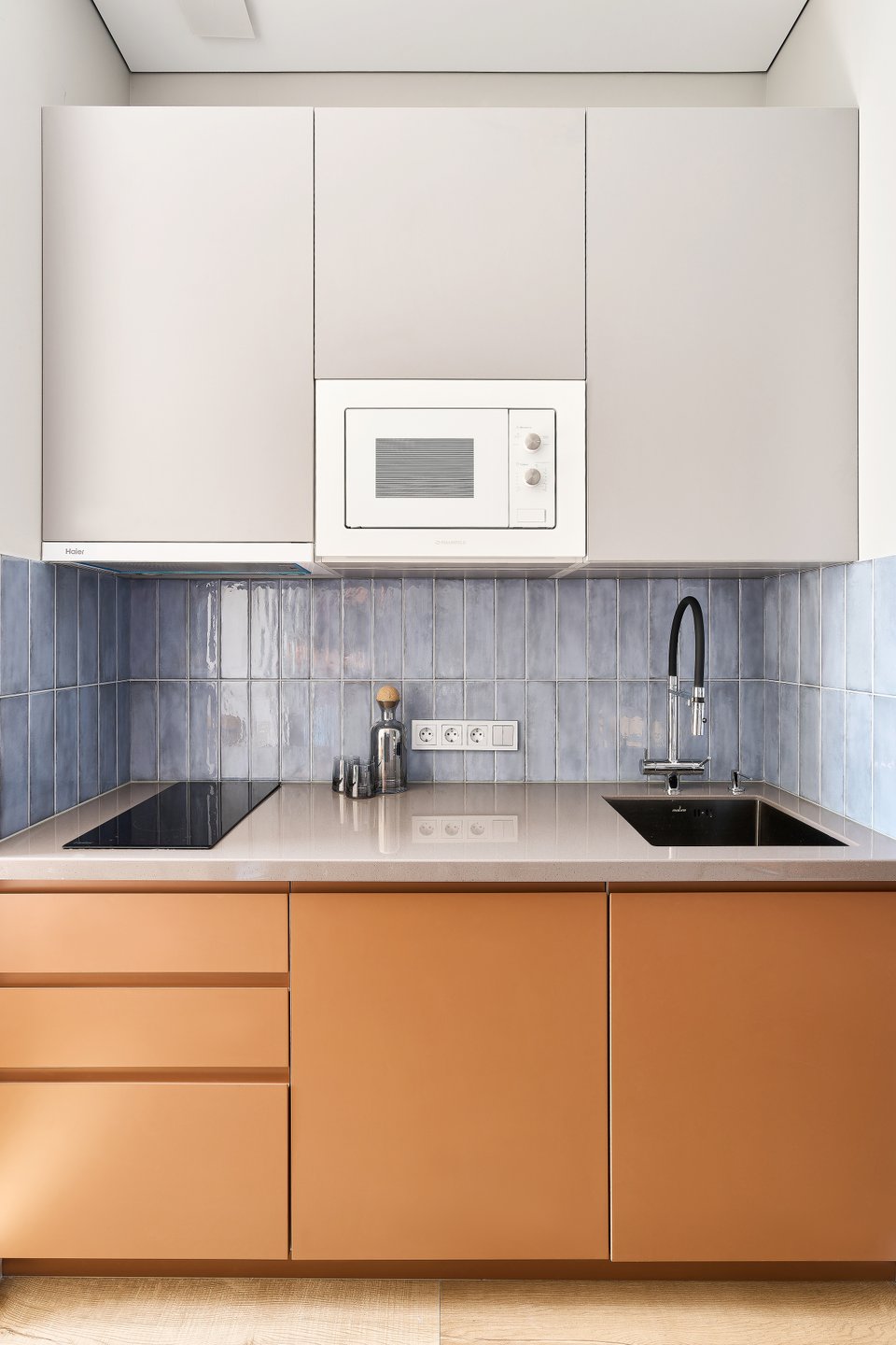 Обратите внимание: на кухне цветовая схема основана на горизонтальном распределении оттенков. Внизу — теплые темные тона, в середине — холодный глянцевый цвет, а сверху — легкие прозрачные оттенки. Этот подход применяется с обеих сторон, что объясняет выбор терракотовых полубарных стульев и плитки для фартука.