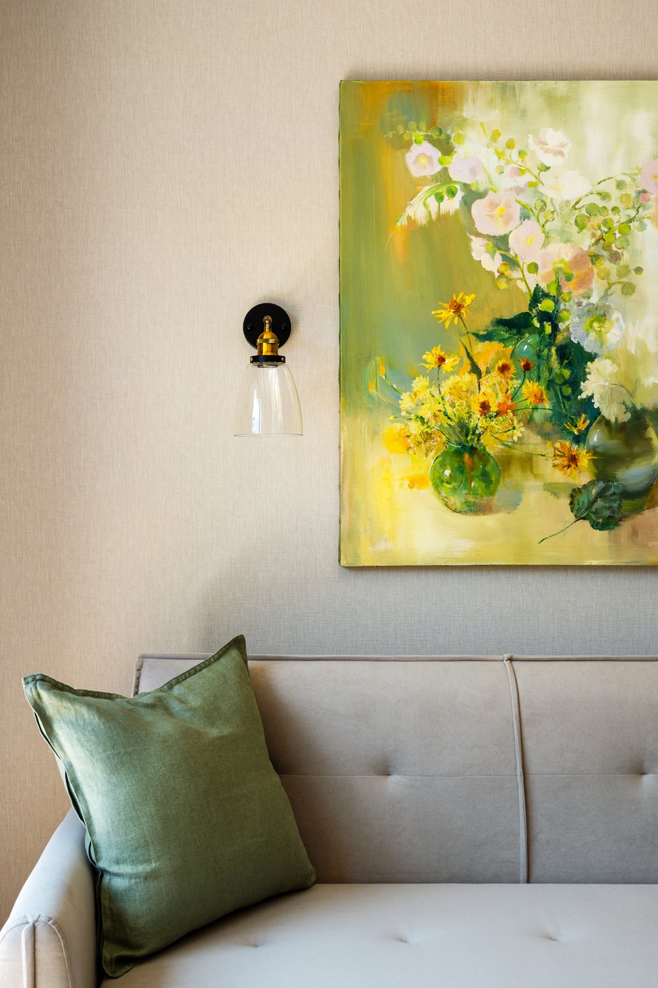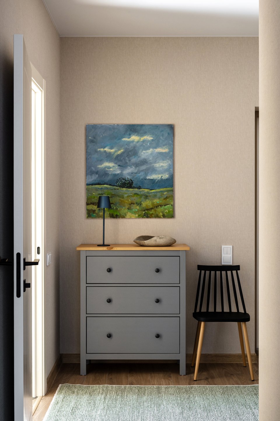«Внедрять цвет, акценты через искусство — удачный прием интерьера. Картина в прихожей яркая, сочная, привносит настроение лета, отдыха, поездки за город. Она дружелюбно встречает хозяев и гостей», — комментирует дизайнер.