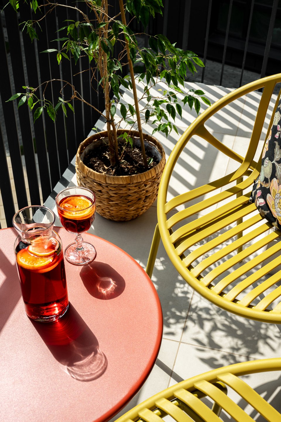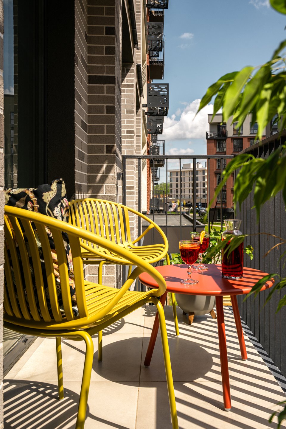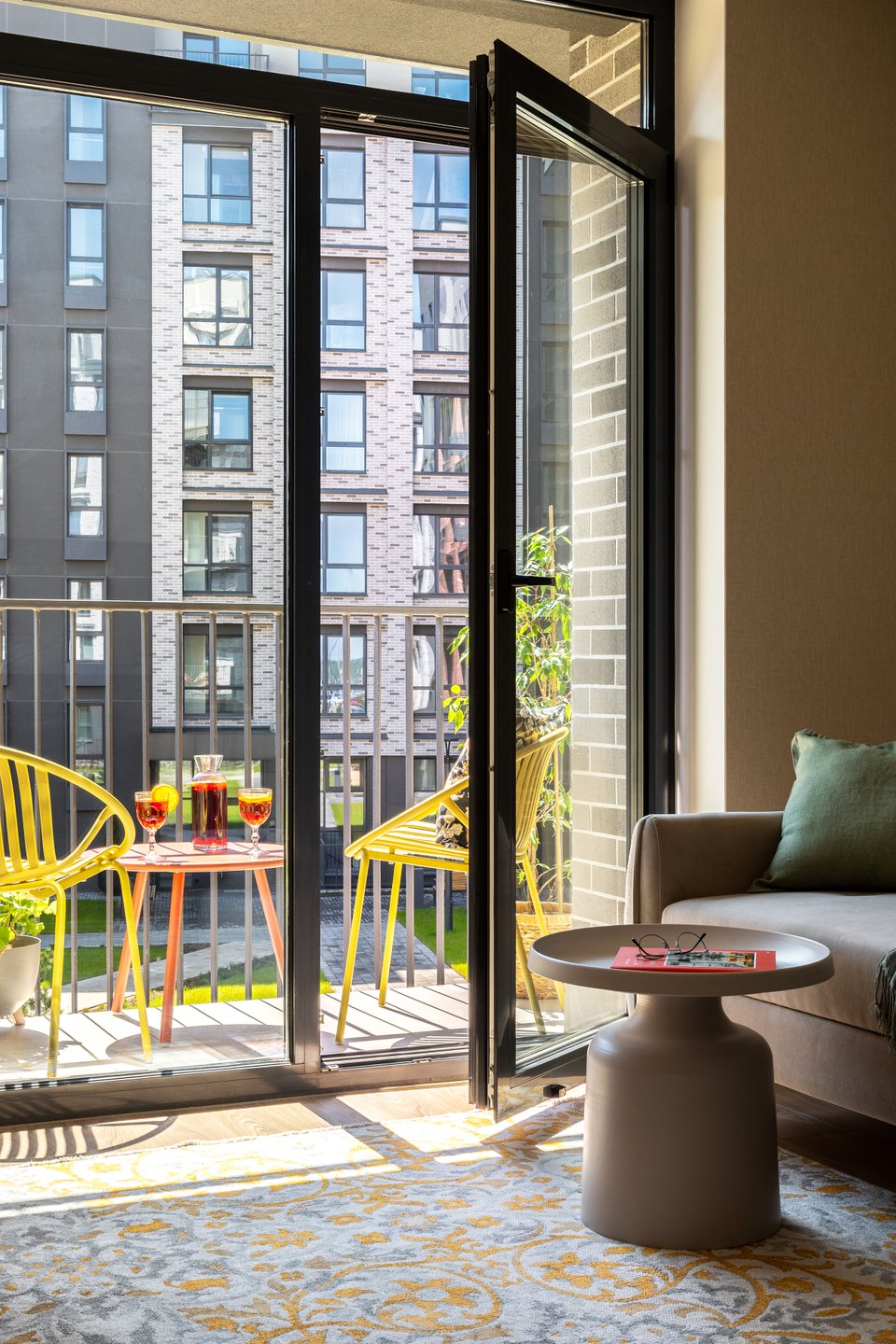 Из гостиной есть выход на балкон. Яркие акценты здесь — стулья Филлис и журнальный стол Франс от divan.by из коллекции indoor-outdoor — универсальные решения для открытого воздуха и сада, которые можно использовать и дома.