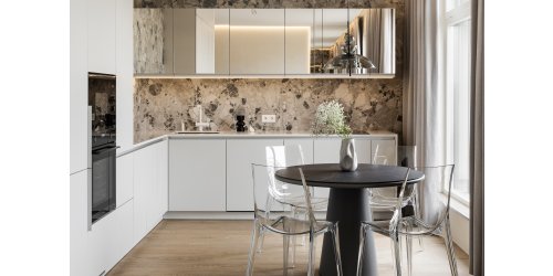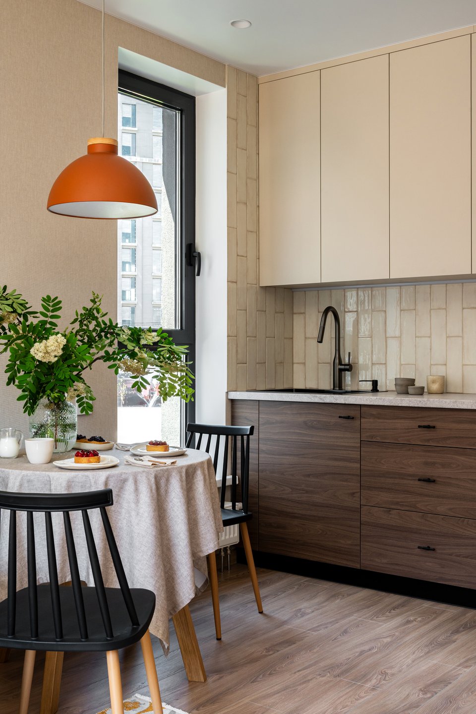 Гарнитур изготовили на заказ — таким образом учли нюансы планировки и задействовали пространство по максимуму. Кухонный фартук и фасады верхнего яруса выполнены в схожих оттенках, но в разных текстурах. Единый цвет делает фасады и фартук одним цветовым «пятном» и помогает избежать визуального расслоения.