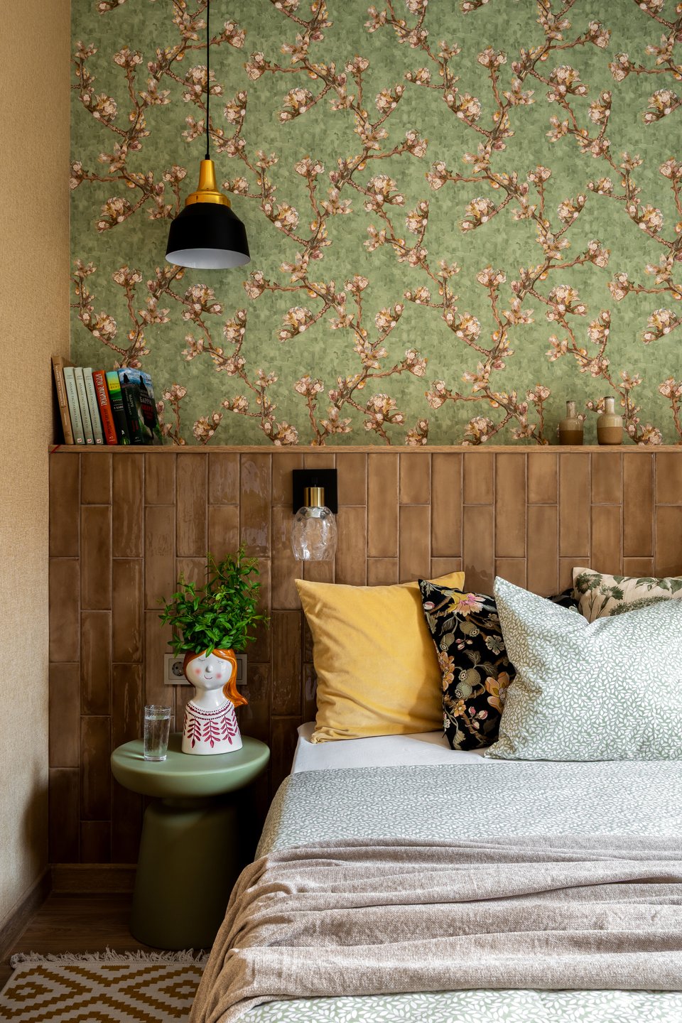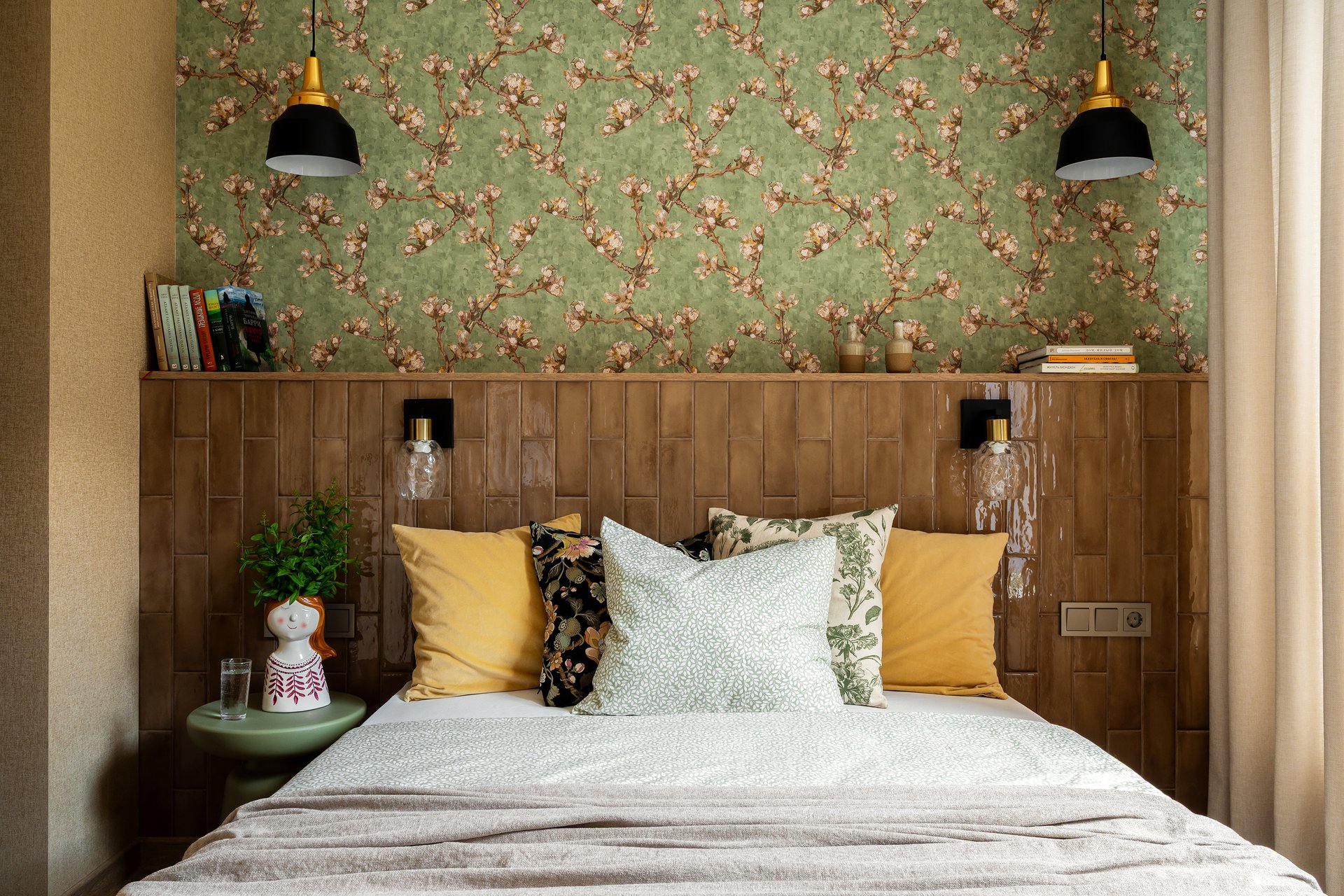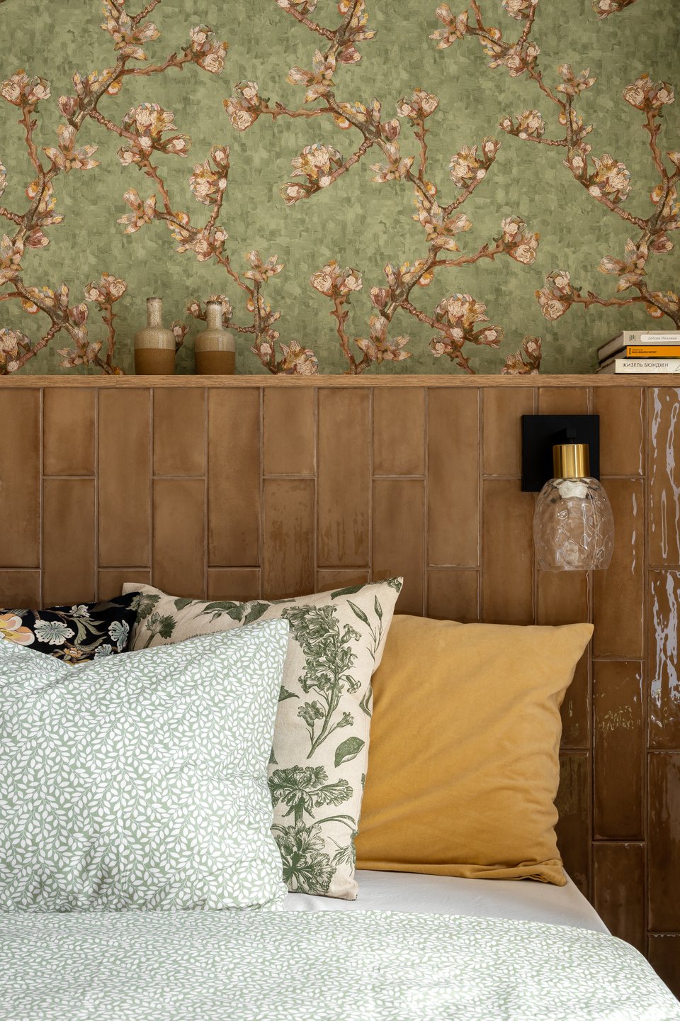 Обратите внимание на изголовье кровати, выложенное глянцевой керамической плиткой. «У этого решения множество преимуществ, — комментирует дизайнер. — Такое изголовье никогда не потеряет вид, там не будет пятен, не испортится ткань. За счет самой конструкции появляется полочка, где можно расставить декор, цветы, книги. Поверхность глянцевая, на ней красиво отражается свет из окна и светильников». Над изголовьем — обои с мотивами «Цветущий миндаль» Ван Гога.