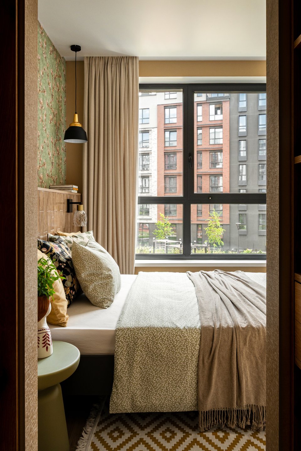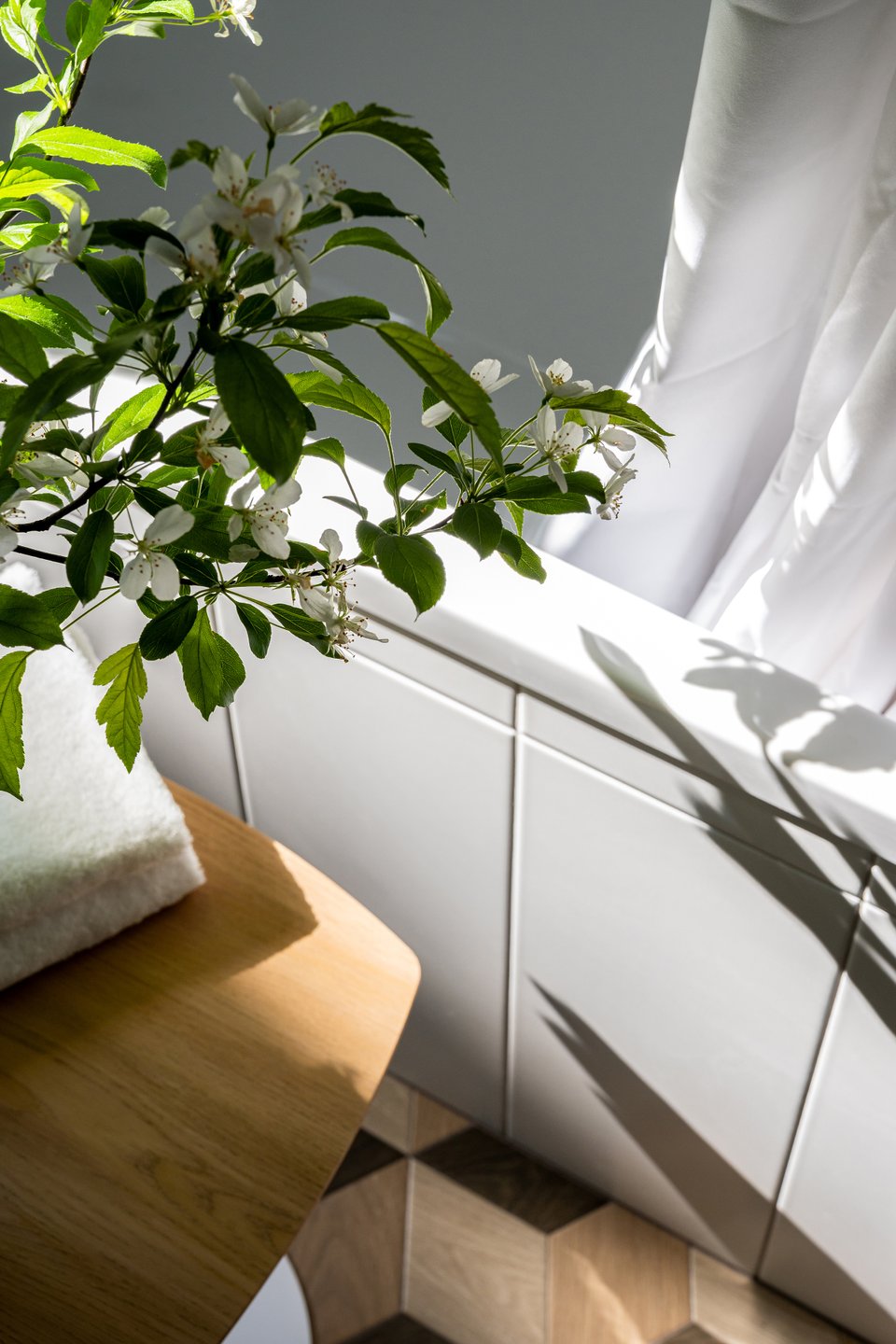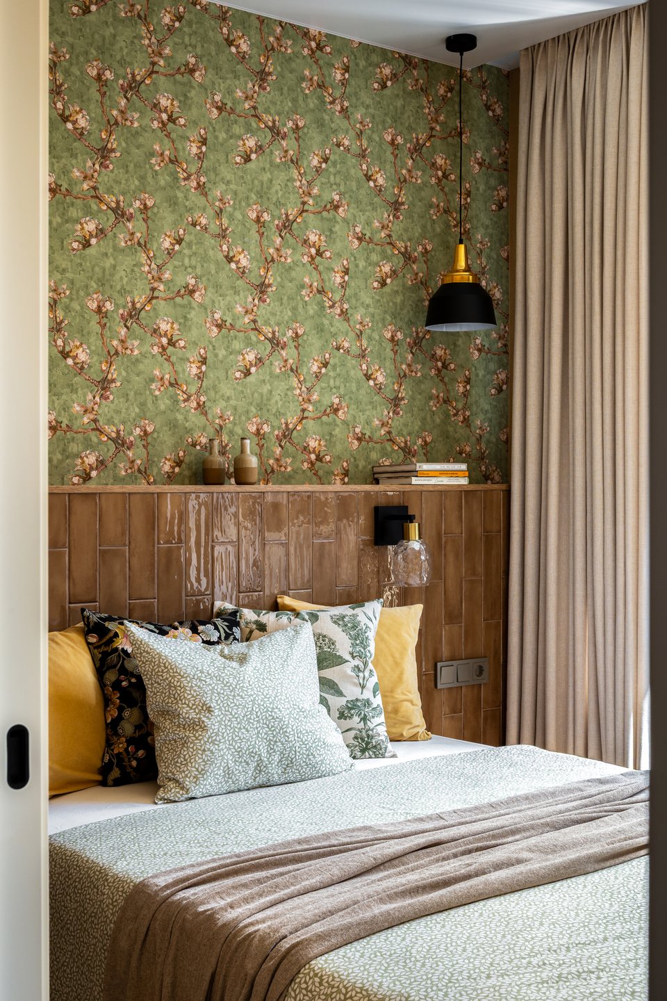 Обратите внимание на изголовье кровати, выложенное глянцевой керамической плиткой. «У этого решения множество преимуществ, — комментирует дизайнер. — Такое изголовье никогда не потеряет вид, там не будет пятен, не испортится ткань. За счет самой конструкции появляется полочка, где можно расставить декор, цветы, книги. Поверхность глянцевая, на ней красиво отражается свет из окна и светильников». Над изголовьем — обои с мотивами «Цветущий миндаль» Ван Гога.