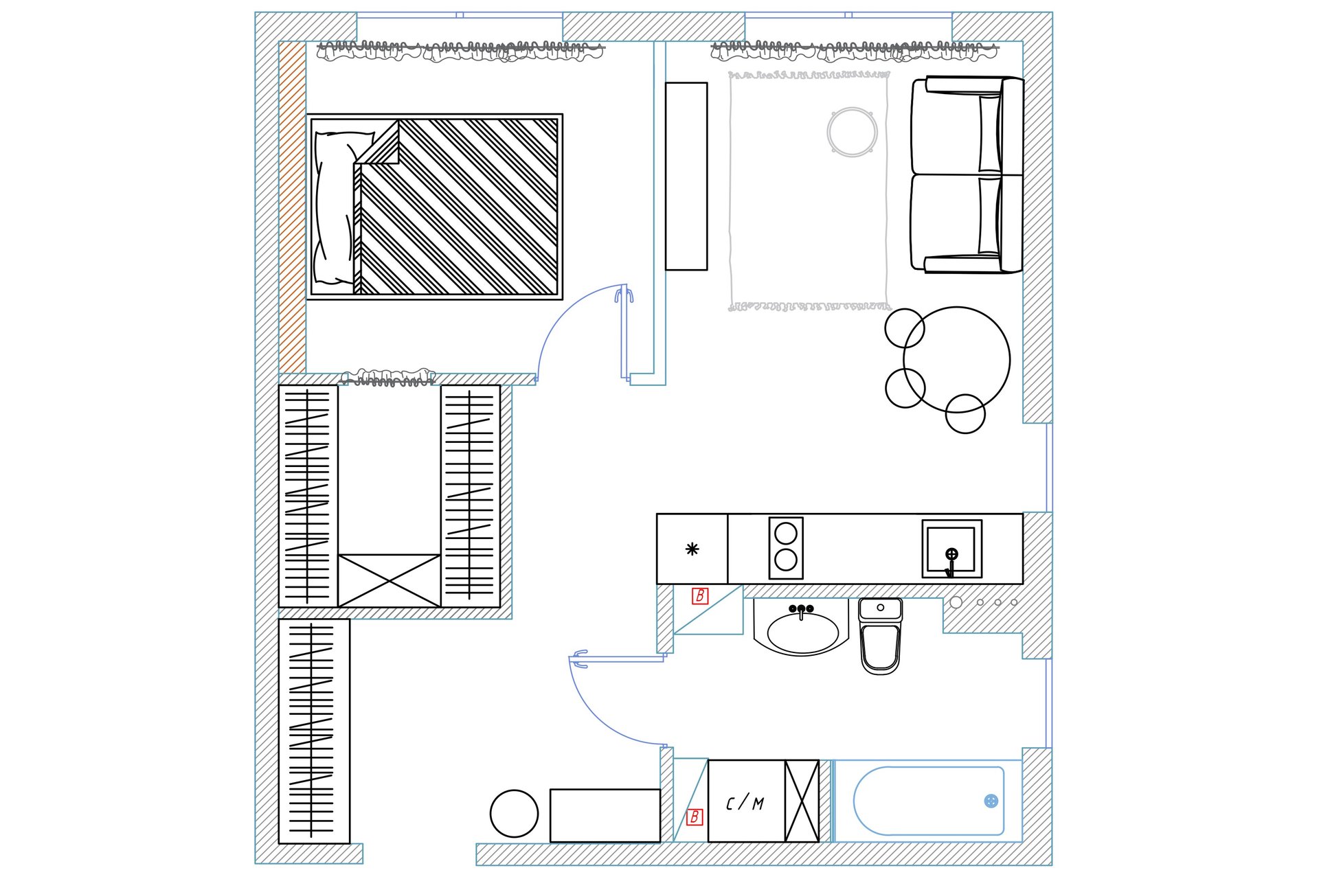 Объект сдавался со свободной планировкой. Основным пожеланием заказчика была изолированная спальня. Комната отдыха получилась небольшой, но рядом разместилась полноценная гардеробная. В квартире также есть кухня-гостиная, прихожая и совмещенный санузел.