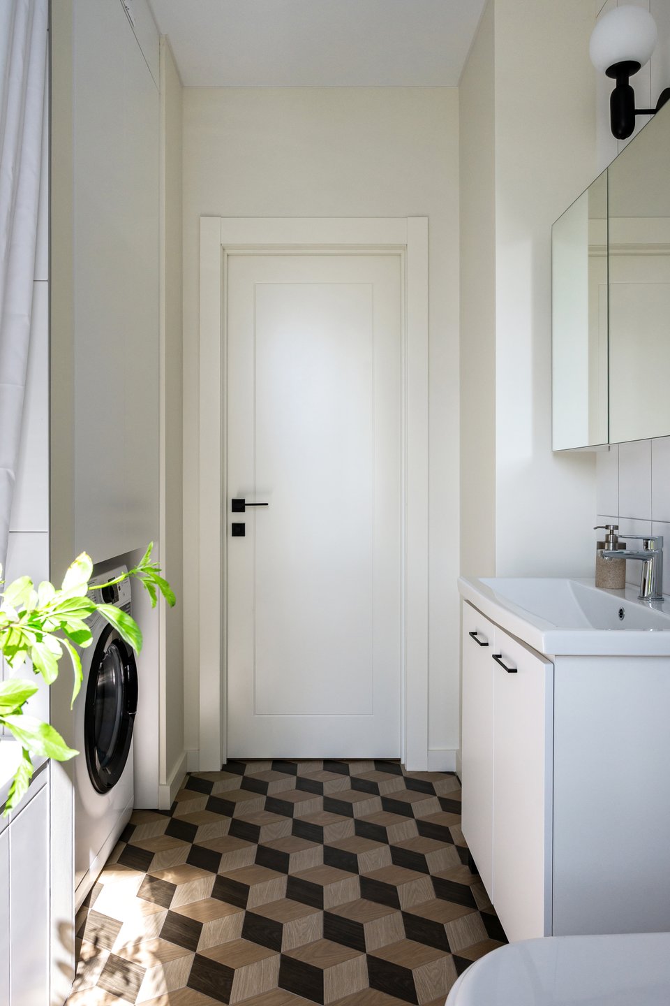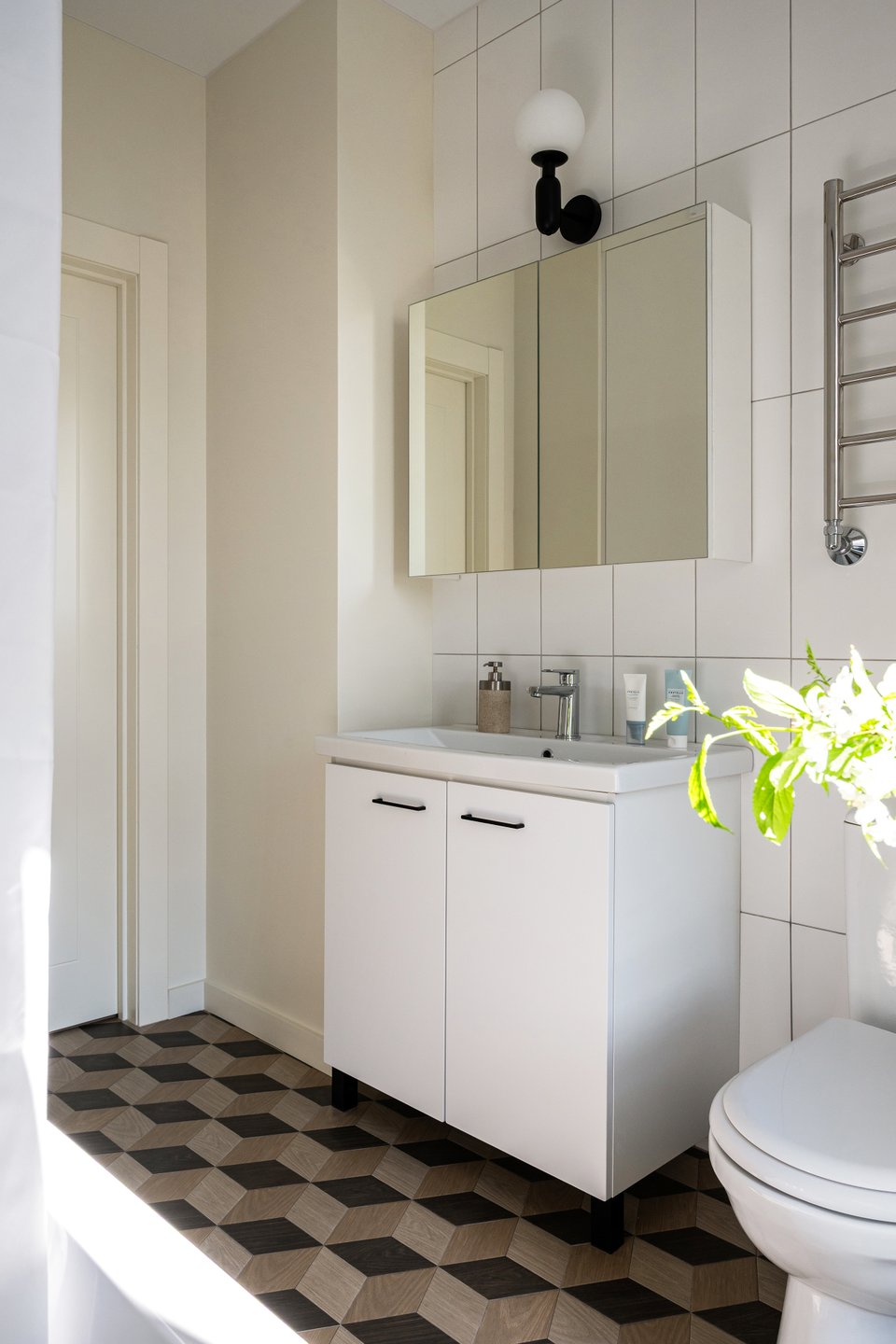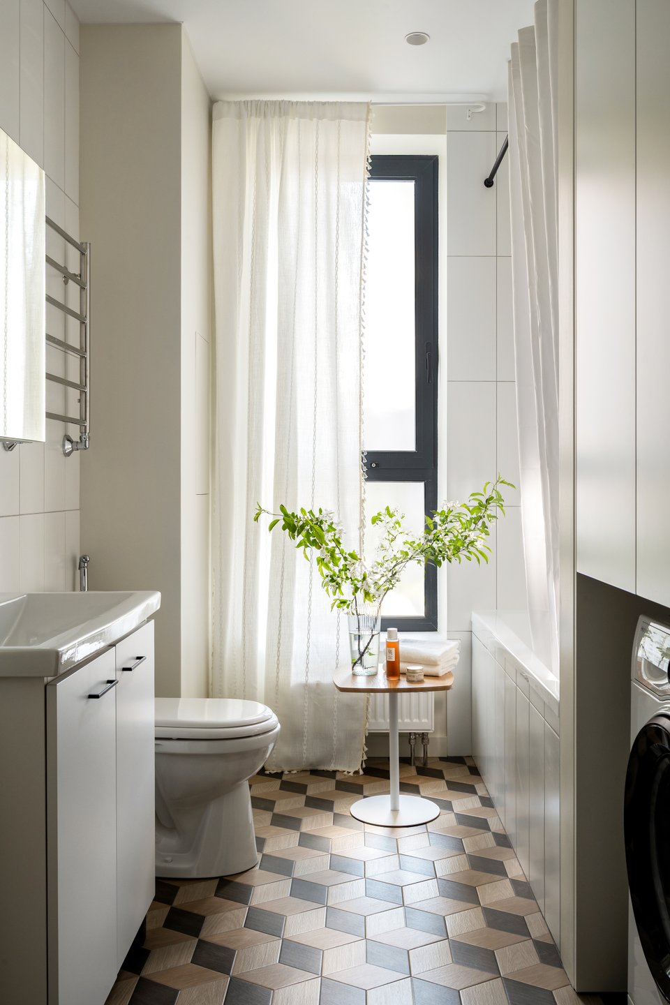 Большое окно, «ажурный» пол, растения — яркие акценты этого пространства. Хранение предусмотрено в зеркальном шкафчике над раковиной, а также во встроенном шкафу для стиральной машины и хозяйственных мелочей.