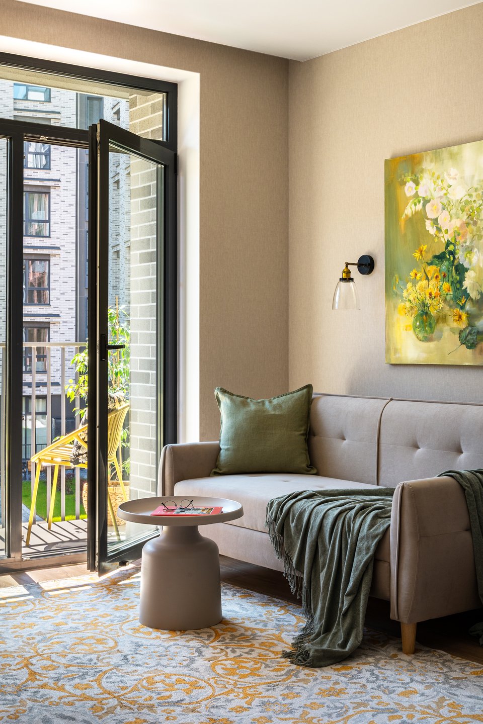 Зона гостиной выполнена в нейтральных оттенках — акценты смещены на ковер с цветочным принтом и яркую картину. Мебель, наоборот, в нейтральных бежевых тонах: диван и столик Ньюман от divan.by.