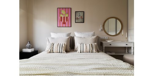 Оттенки текстиля сочетаются с золотистой отделкой фасада здания, который видно из панорамных окон. На подоконниках расположили мягкие подушки. Акцентом выступает яркая живопись Маши Янковской.
