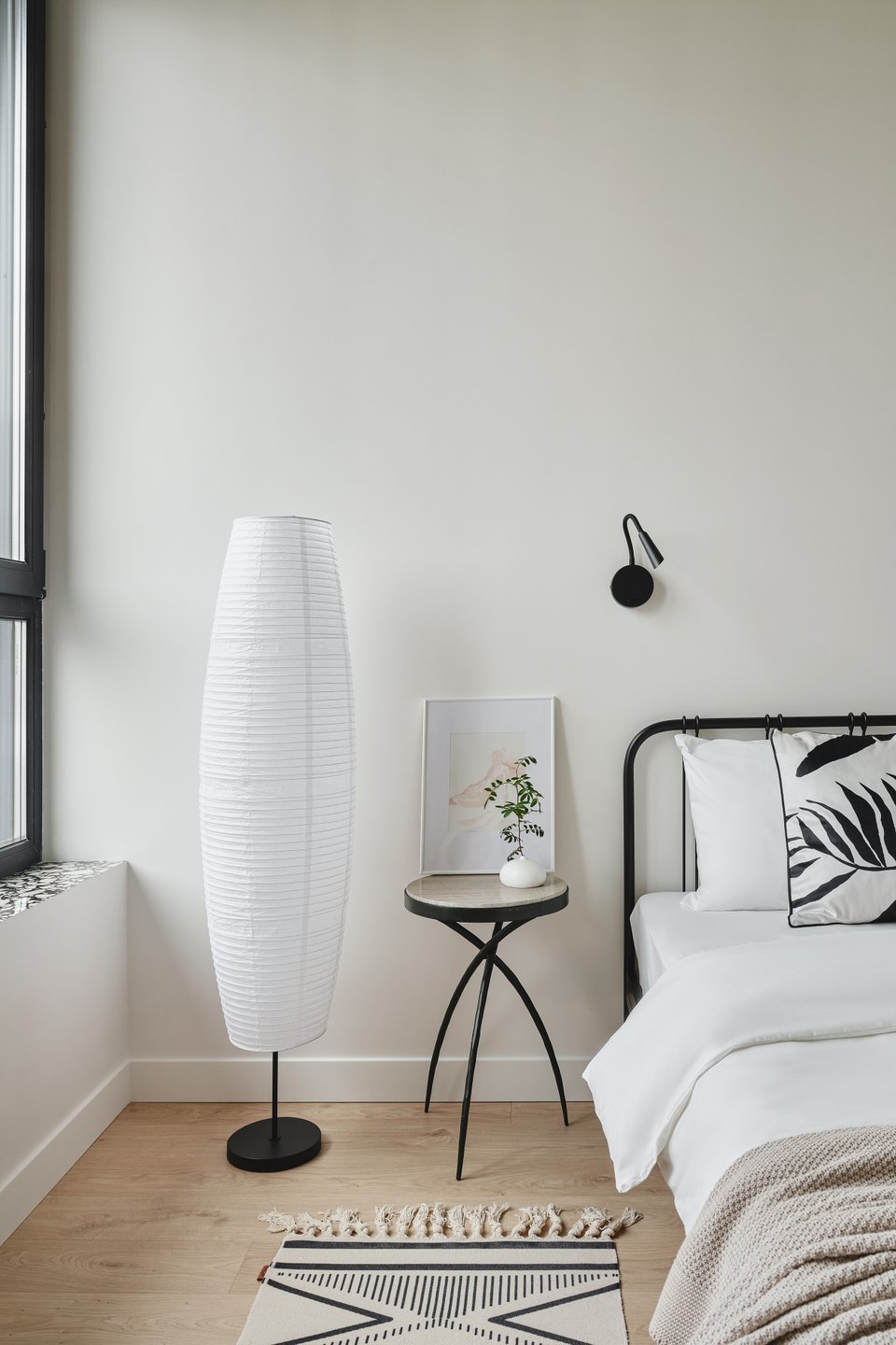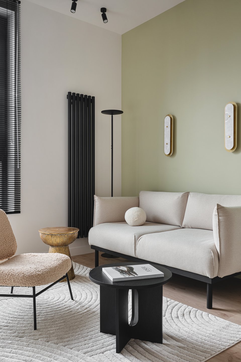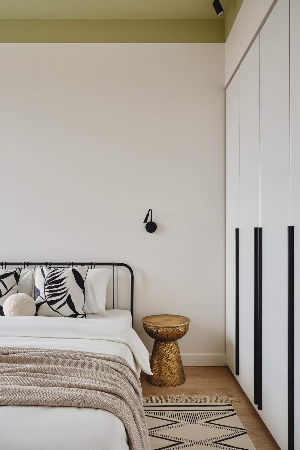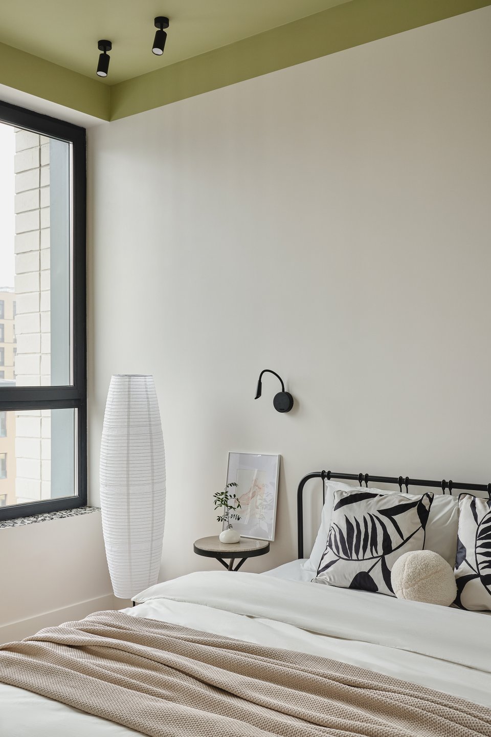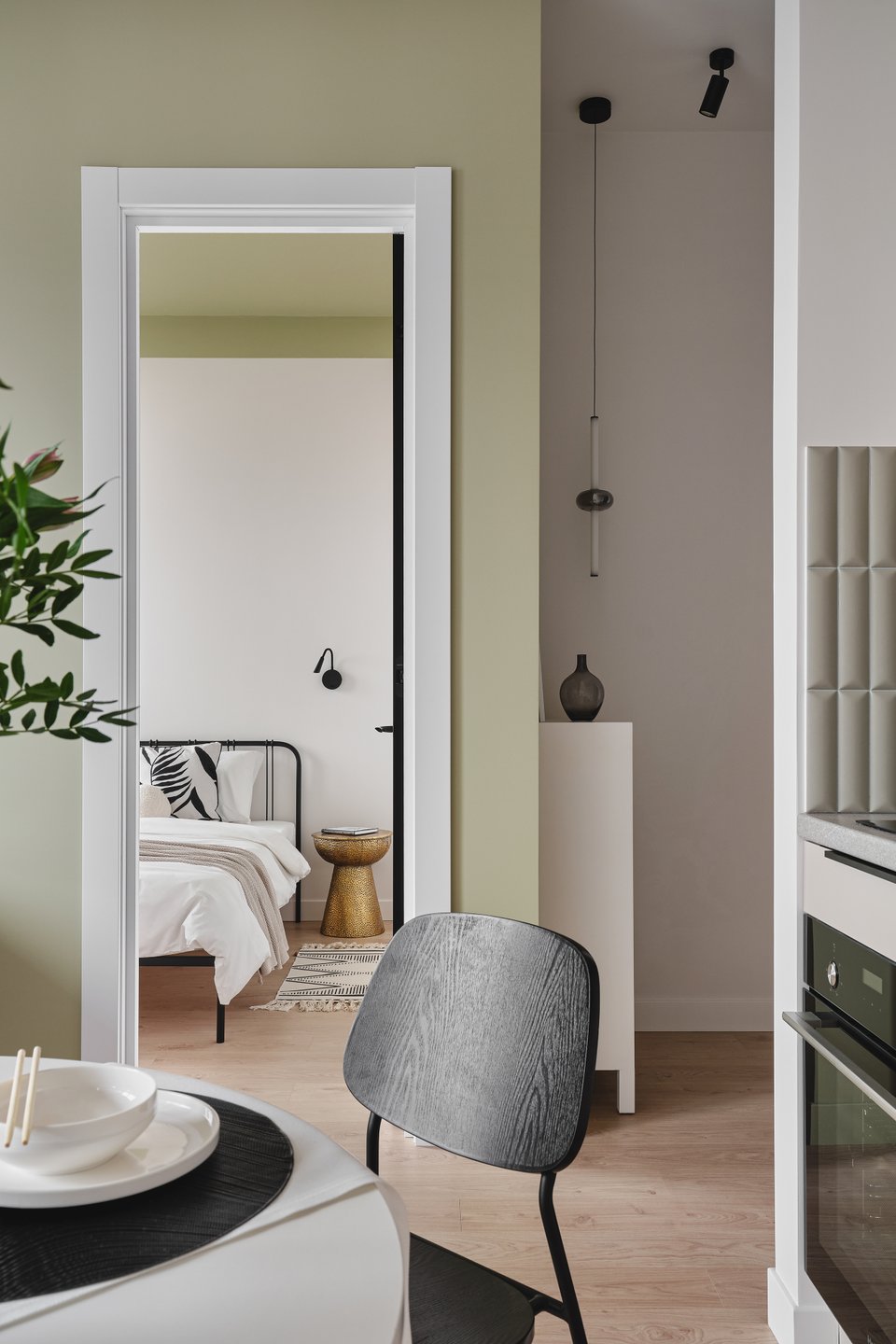Прием: цвет стены в гостиной плавно переходит в цвет потолка в спальне, создавая ощущение единства и воздушности.