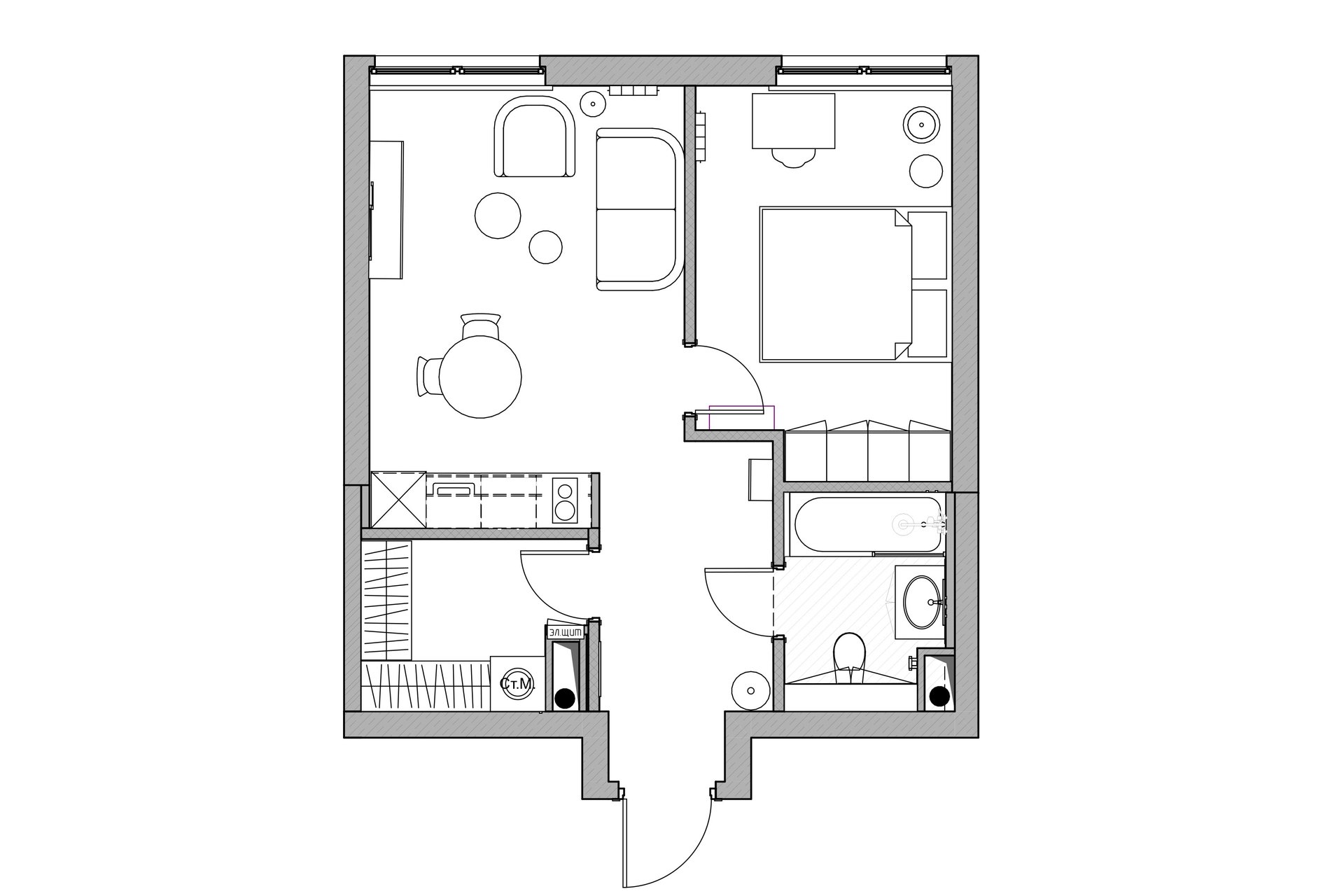 Планировку от застройщика переработали, создав несколько функциональных зон. В квартире есть отдельная спальня, оборудованная рабочим местом у окна, и просторная гостиная с выделенной кухней-нишей. При входе спроектирована гардеробная.