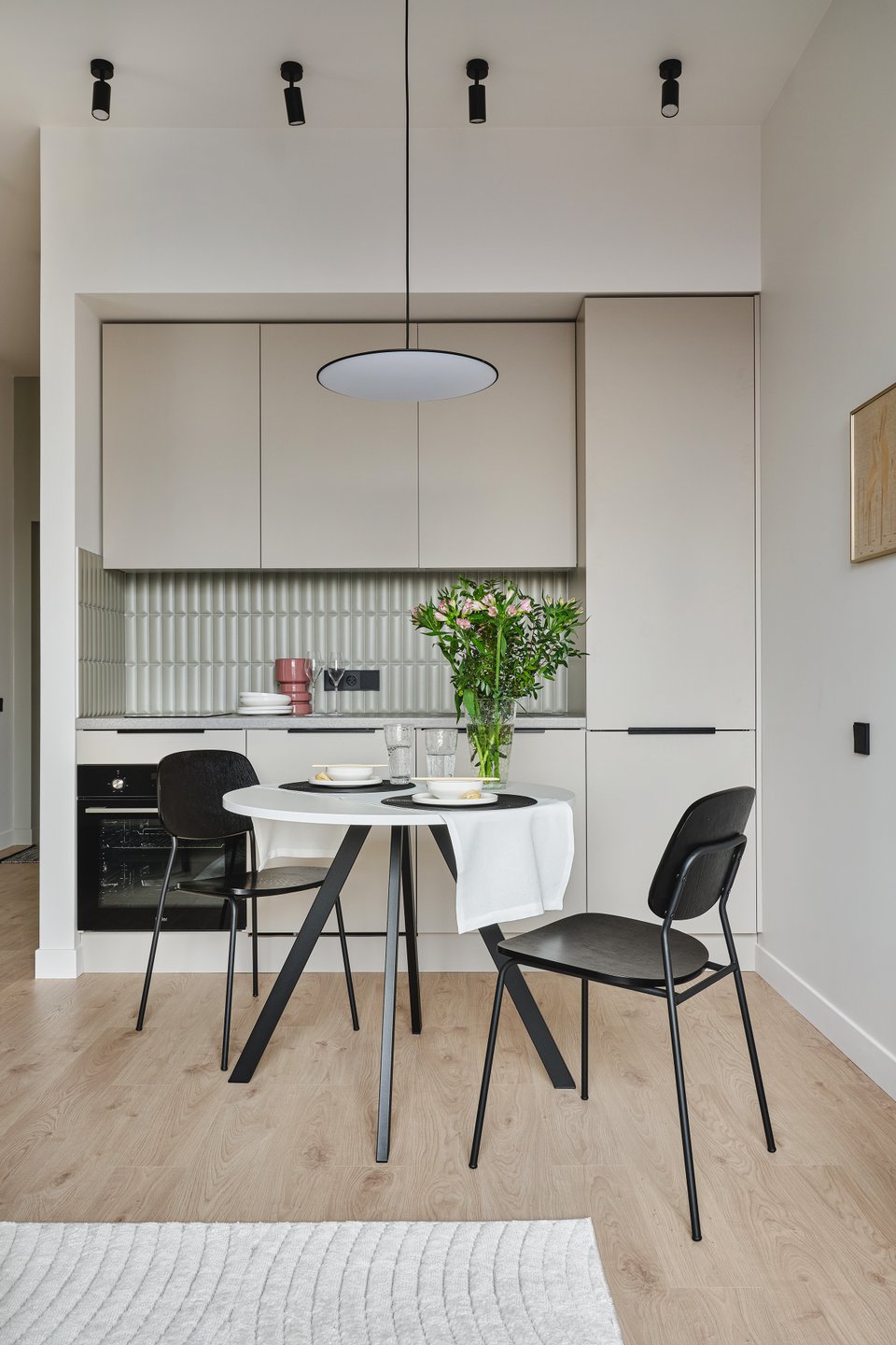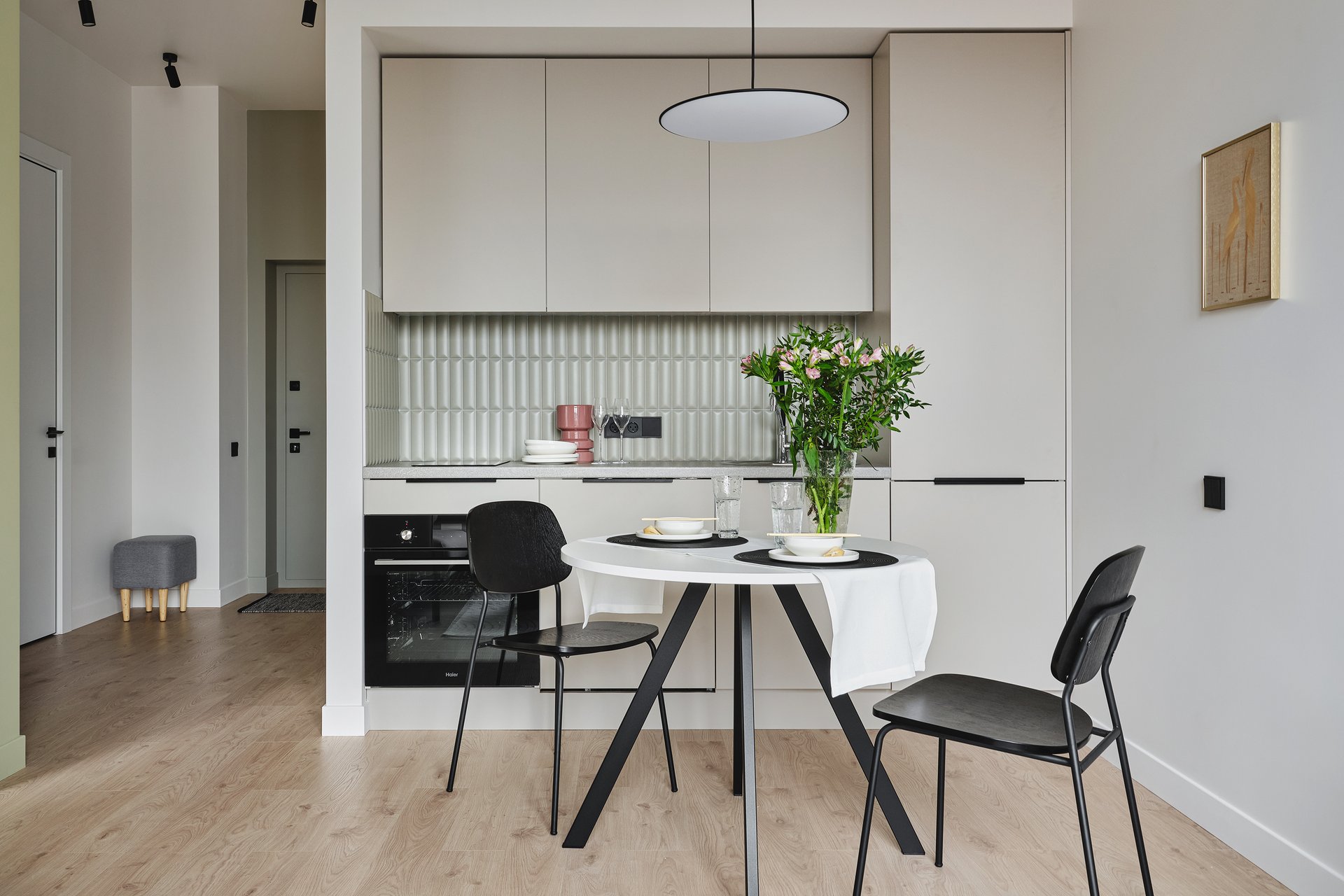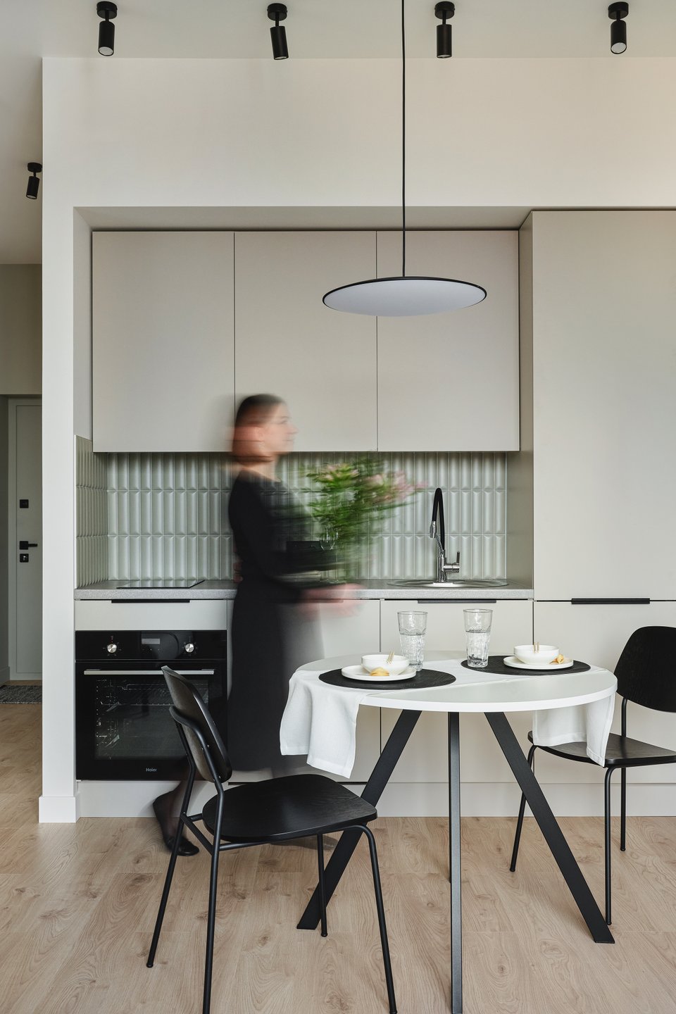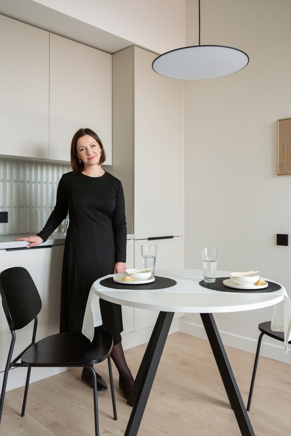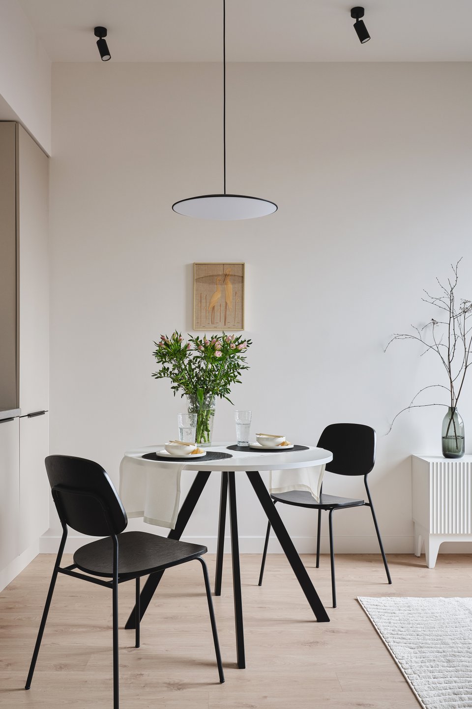 «Круглая форма стола смягчает геометрию кухни, — комментирует дизайнер. — Черный цвет подстолья и стульев создает в интерьере контраст. Украшением этой зоны стала винтажная картина из соломки с изображением аистов. Этот предмет привнес в интерьер теплоту и ностальгию, напоминая о традициях ручной работы».