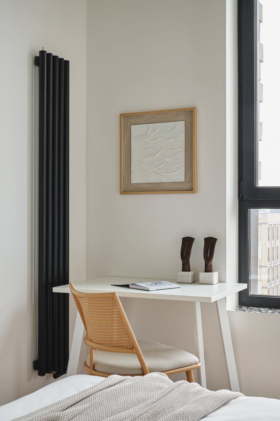 Центральное место в спальне занимает кровать с «легкой», визуально невесомой конструкцией. Около окна организовали рабочую зону, которую дополнила светлая картина.