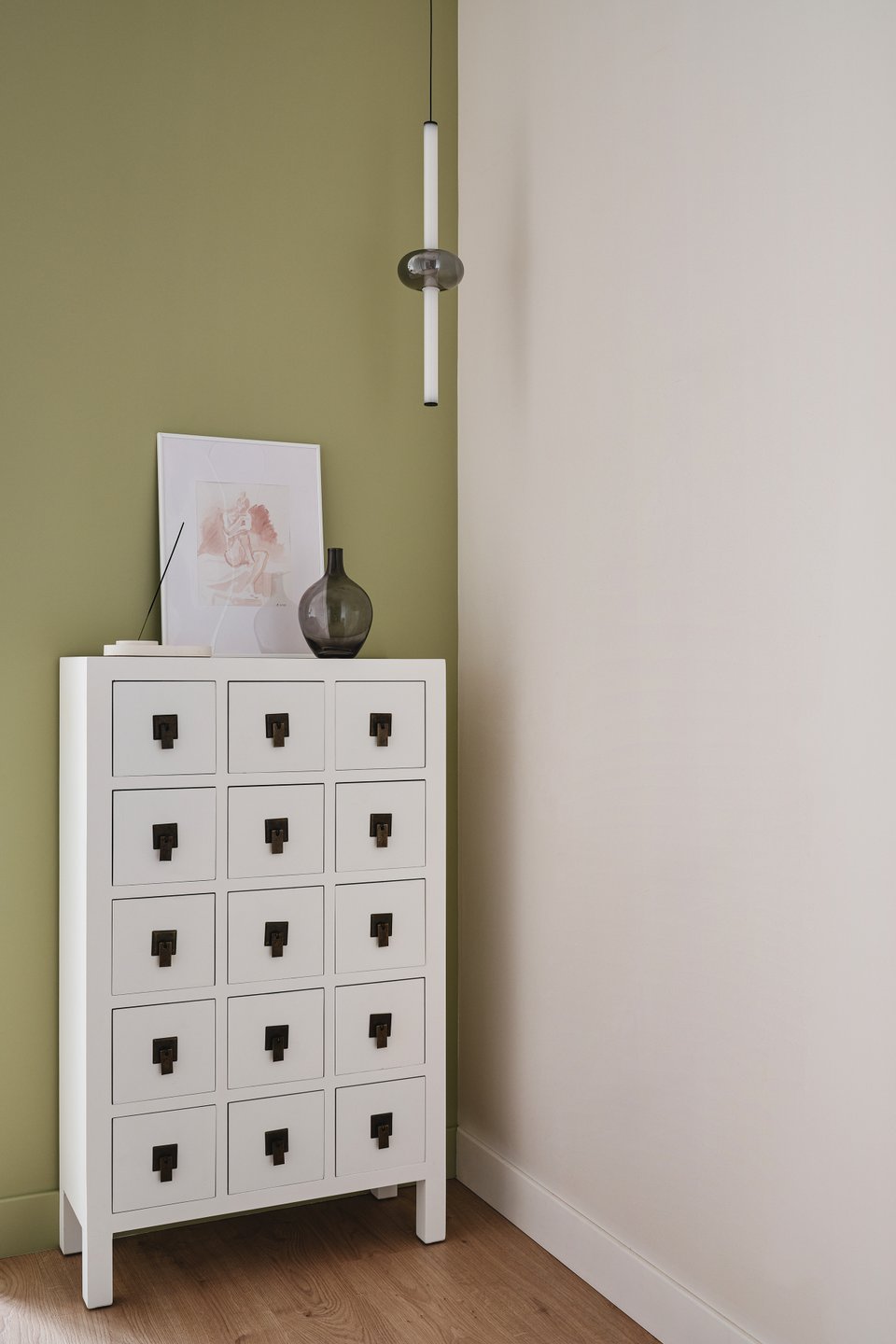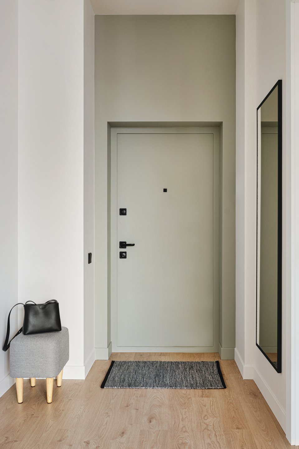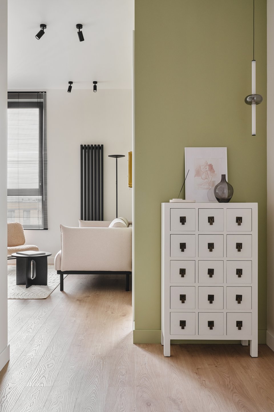 Обратите внимание: входная зона и стена за комодом оформлены с использованием приема колор-блок в зеленом оттенке, объединяющего прихожую с остальными пространствами квартиры.