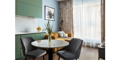 На площади 12,6 кв.м совмещены две функциональные зоны — кухня и столовая. Для гибкости пространства выбрали раскладной диван Слипсон Мини от divan.ru: при необходимости стол и стулья отодвигаются, а диван трансформируется в спальное место. Обивку изумрудного цвета выбрали в «Конструкторе» из палитры бренда.