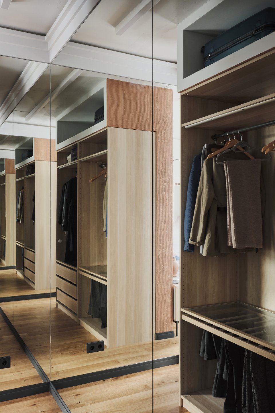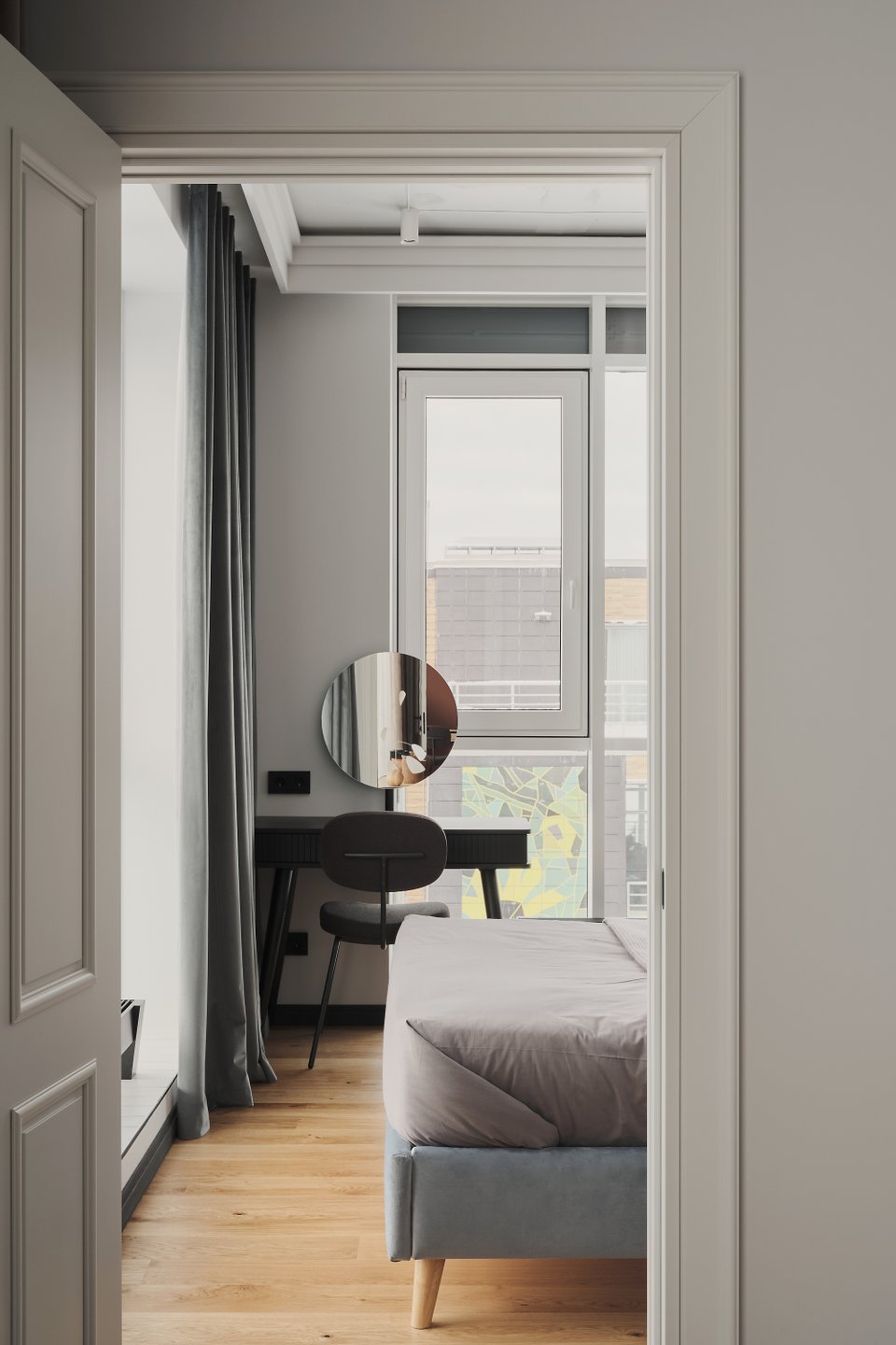 Обратите внимание на зеркальную стену при входе в комнату — такой прием визуально расширяет пространство и добавляет отраженный свет.