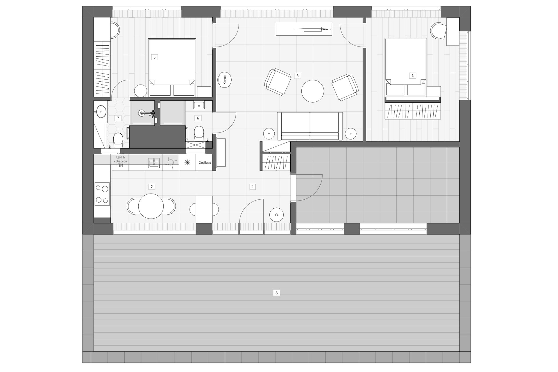Объект: трехкомнатная квартира 77 кв.м + терраса 30 кв.м