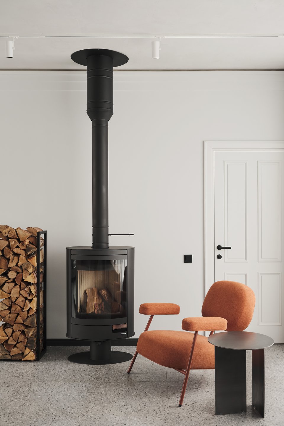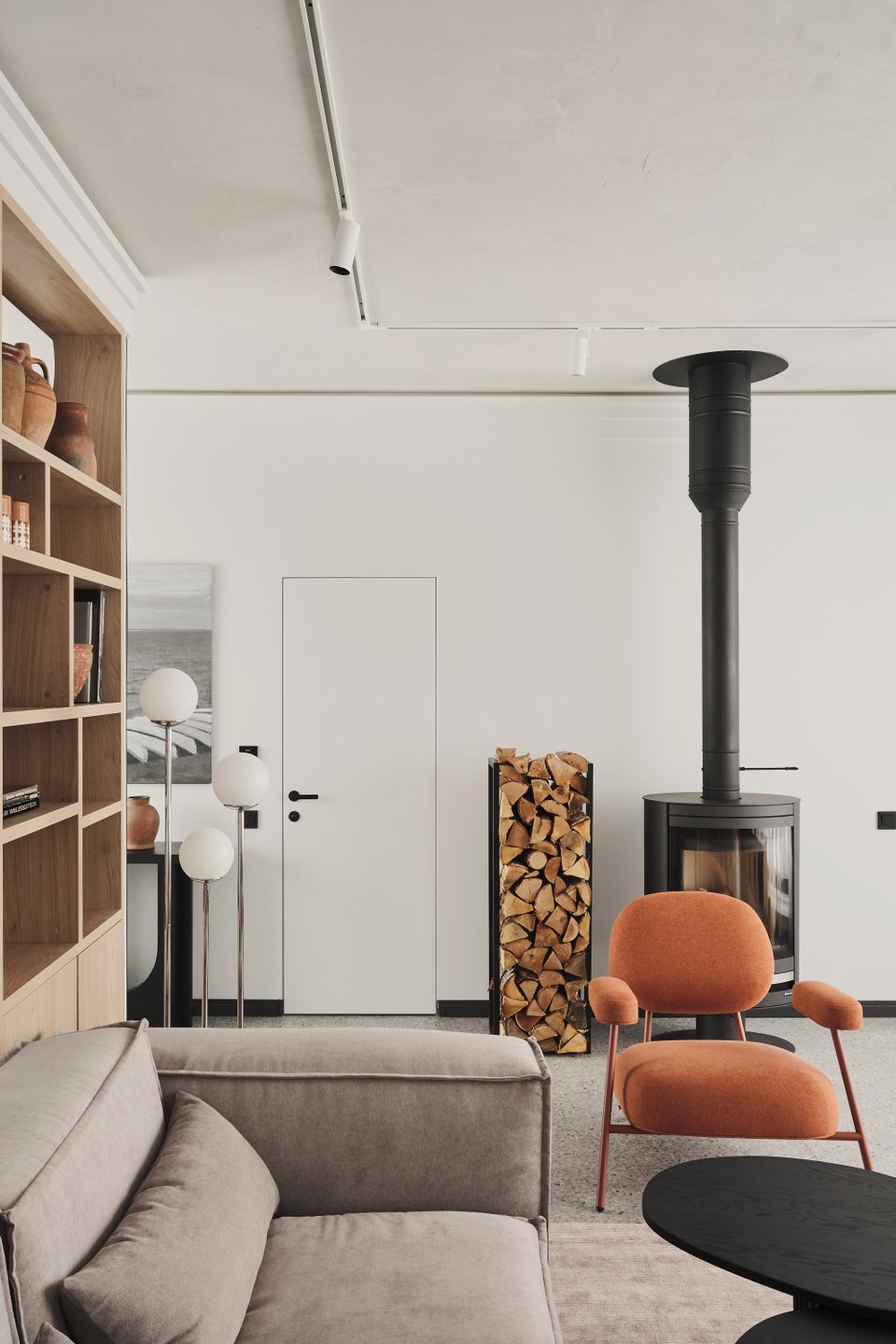 Атмосфера гостиной располагает к уютному домашнему отдыху, а также визуально напоминает загородный дом. Главная фишка здесь — печь-камин с настоящей топкой.
