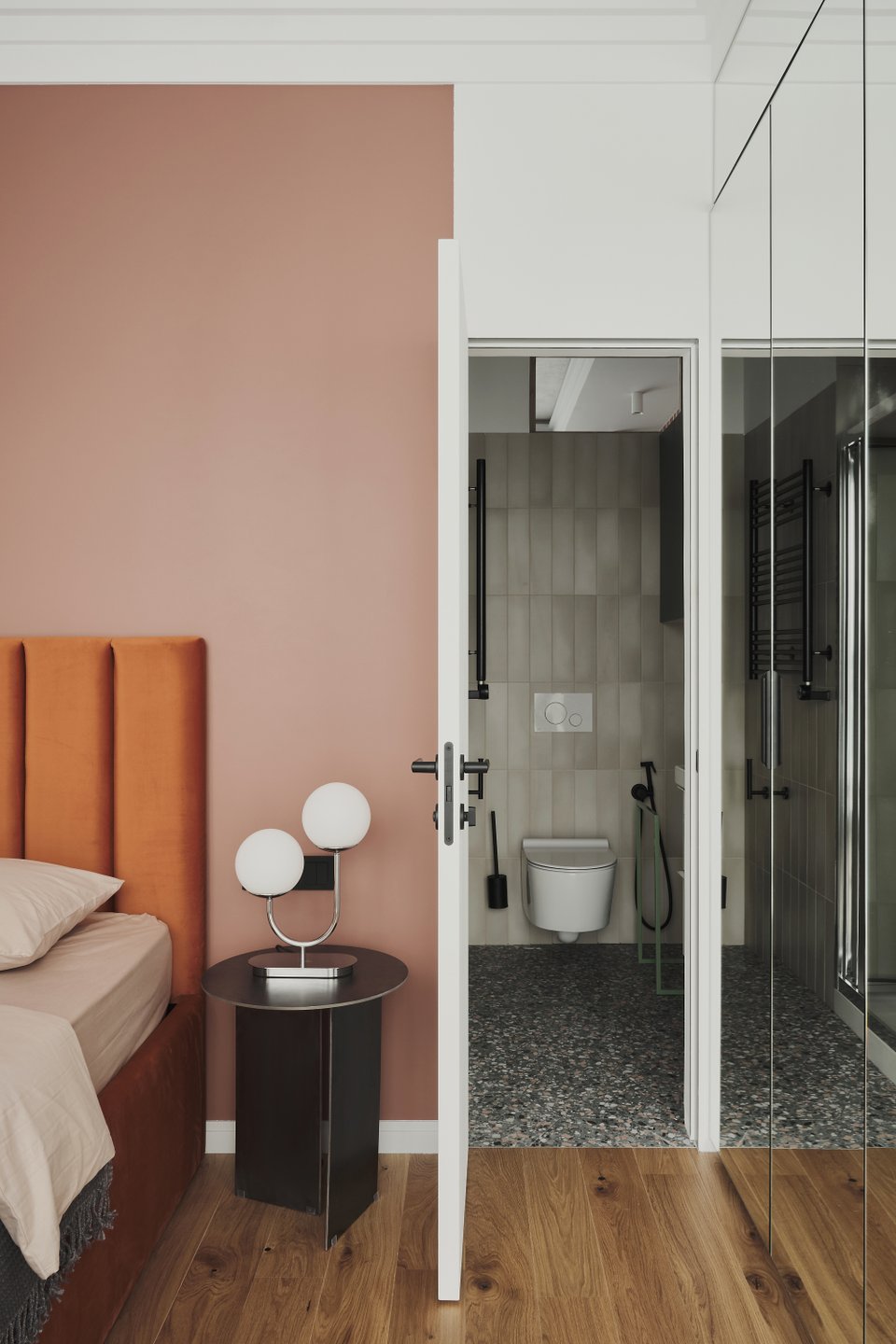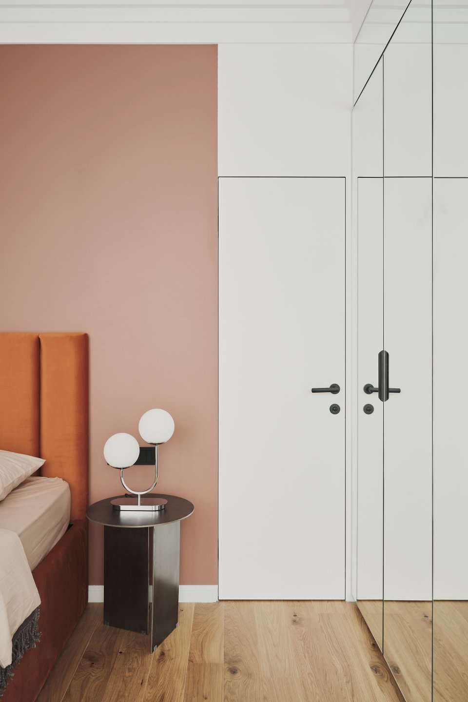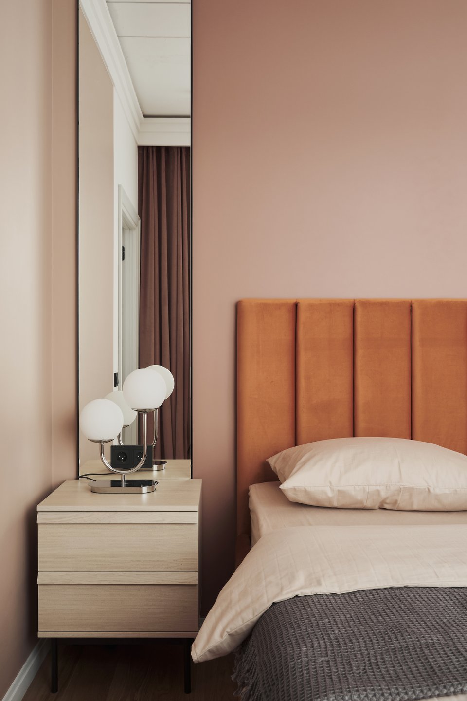 Первая спальня выполнена в теплых кирпичных тонах. Правильную форму комнаты скорректировали цветовыми акцентами на стенах — таким образом визуально увеличили высоту дверных проемов.