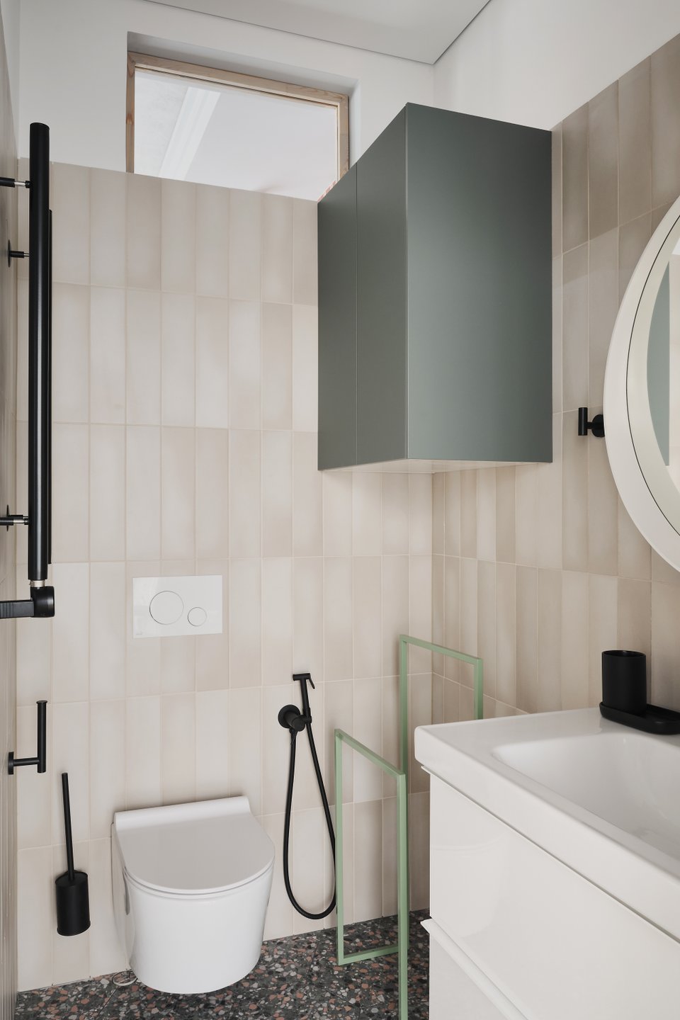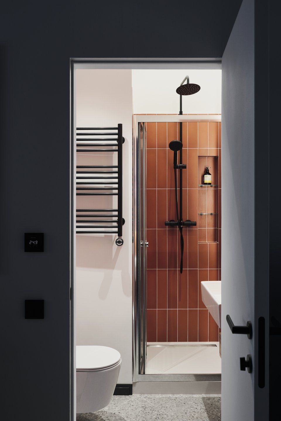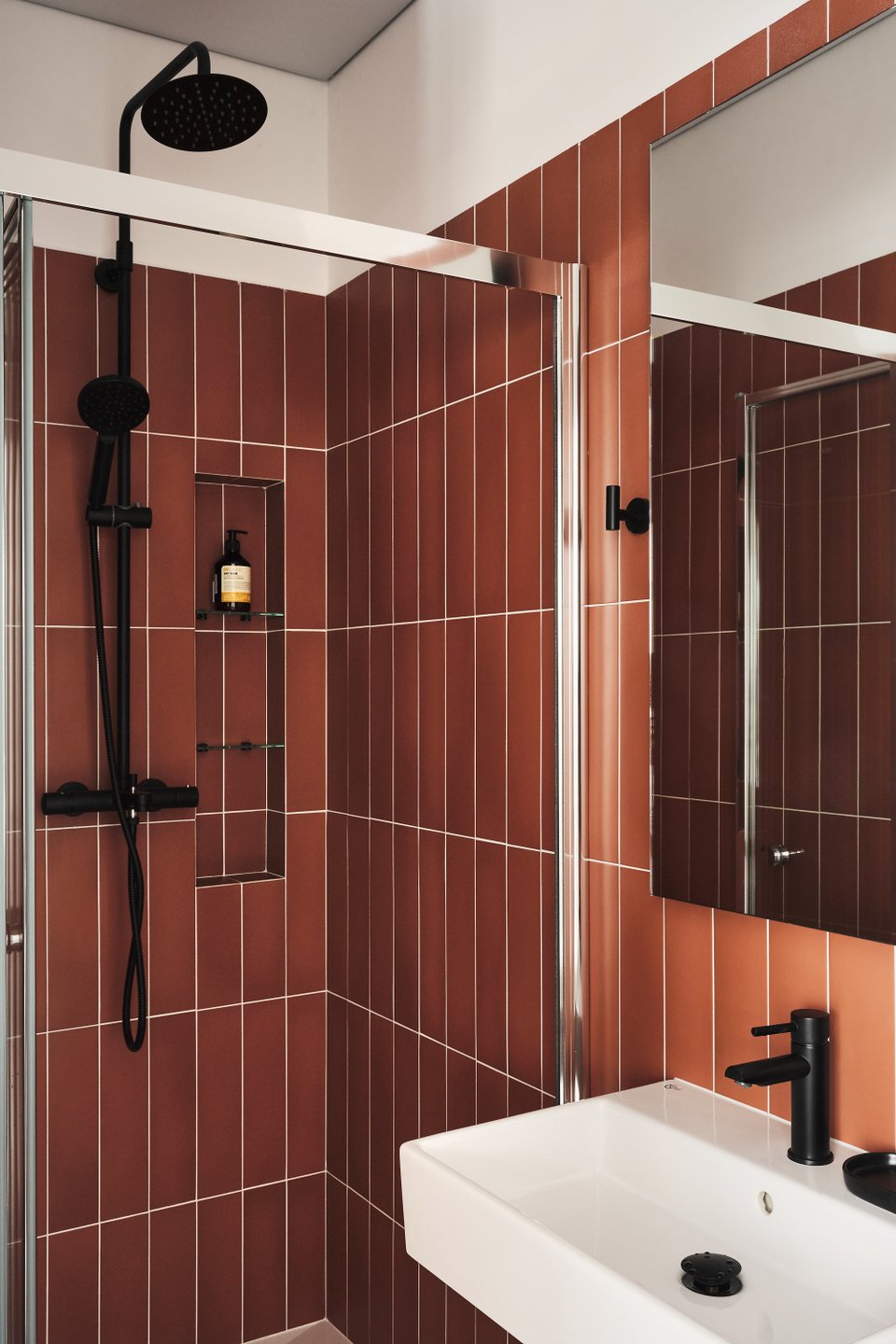 Во втором санузле душевая выделена терракотовой плиткой. Из-за меньшей площади здесь нет шкафов и тумб для хранения — только самое необходимое.