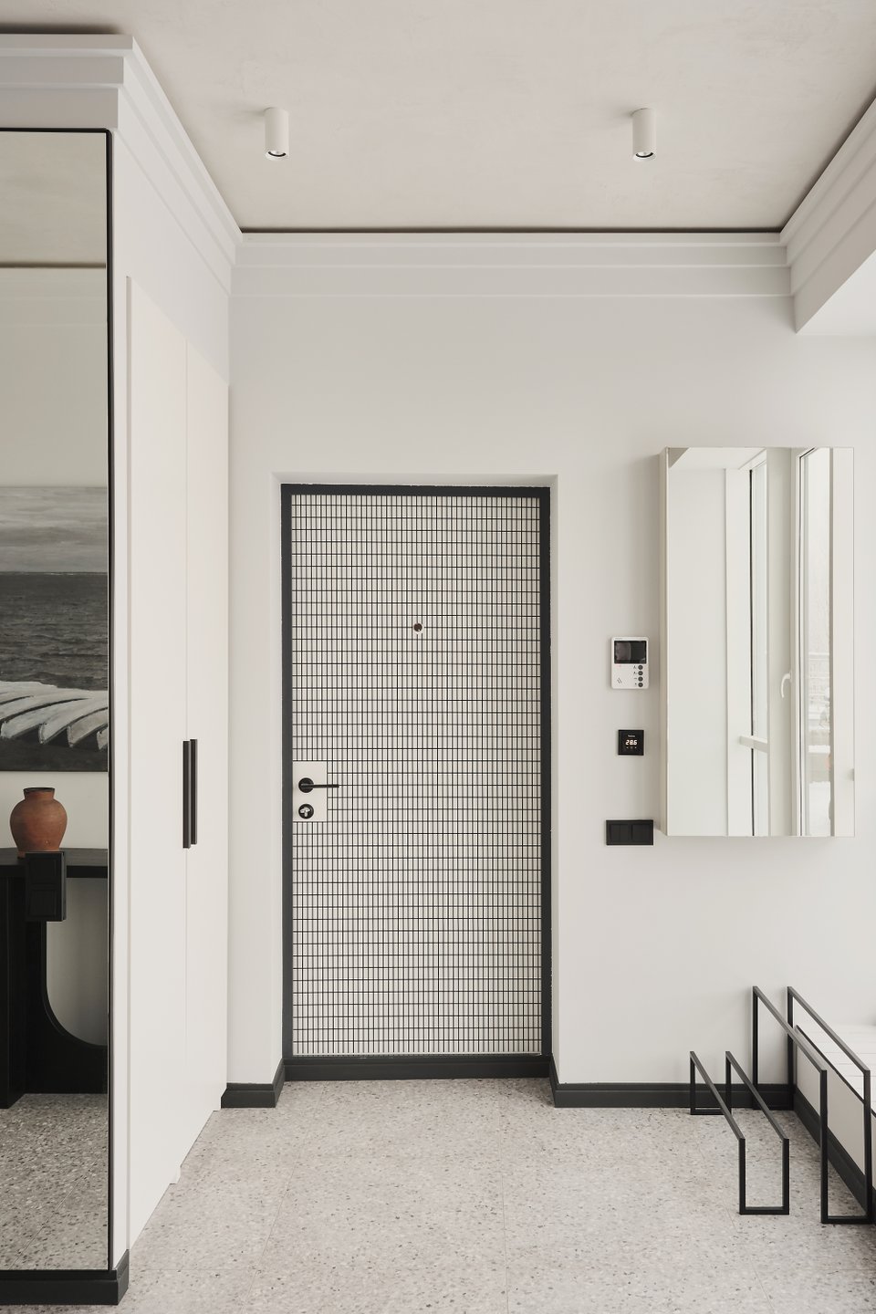 Входную зону сделали минималистичной. На входе в квартиру спроектировали встроенный шкаф – за глухими фасадами спрятаны одежда, обувь и весь визуальный шум. Мелочи и щиток — в подвесном шкафу с зеркалом на дверце.