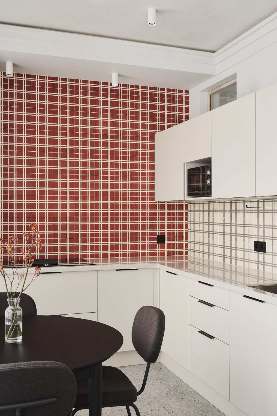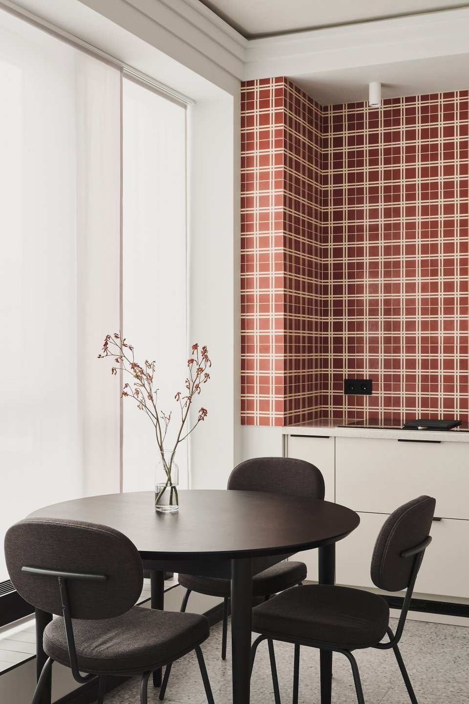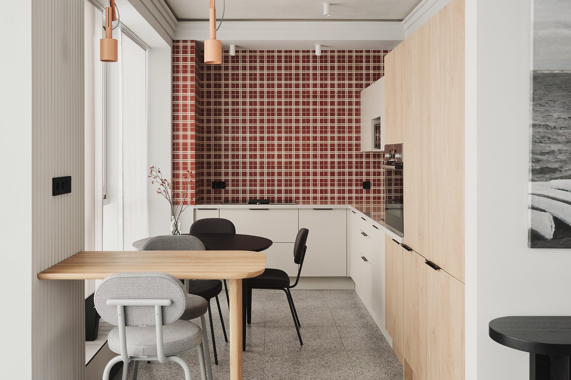 На кухне одновременно есть и барная стойка, и обеденный стол. Угловой гарнитур изготовлен на заказ. В высоких колоннах спрятаны хозяйственный блок с коллекторной группой, стиральная машина и холодильник. За счет использования встроенной вытяжки сохранили целостность фартука и создали своеобразный орнаментальный холст.