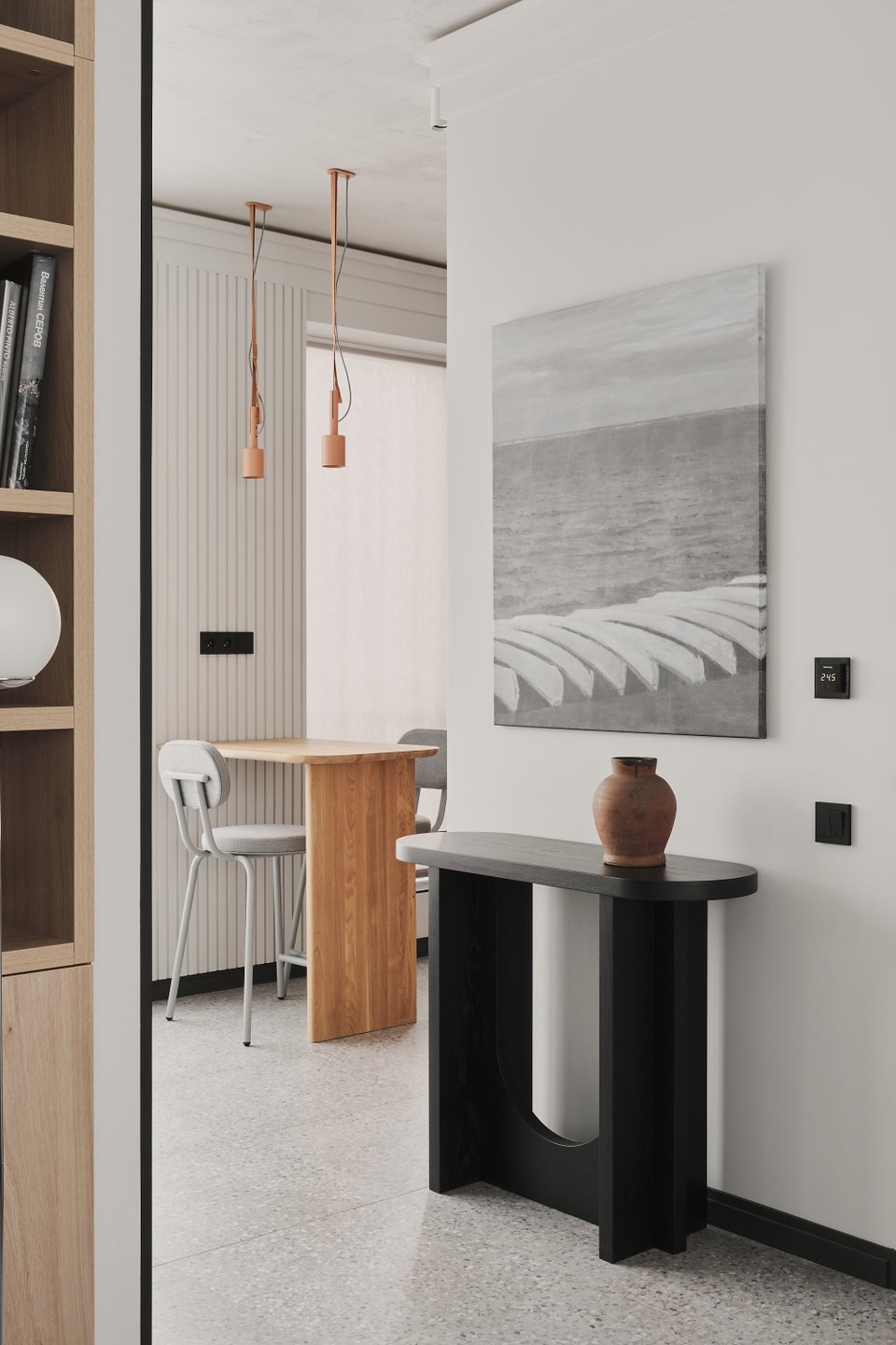 «Изначально потолок хотели оставить бетонным, но когда подошли к реализации, хозяйка сказала, что в таком виде бетон выглядит слишком брутально. Было предложение зашить его гипсовыми плитами, но мы отказались от этого варианта. В итоге решили просто покрасить по бетону и оставить открытую проводку, а в кухне-гостиной сделать декоративную штукатурку. Такое решение позволило устранить проблему кривых потолков, а также визуально смягчило эффект бетонной штукатурки», — рассказывает дизайнер.