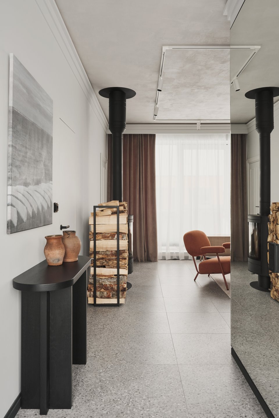 Квартира сдавалась со свободной планировкой: на 77 кв.м были выделены две спальни, два санузла с душевыми, гостиная, кухня со столом и барной стойкой, а также просторная прихожая. Благодаря тому, что объект находится на последнем этаже, в гостиной смогли установить печь-камин.
