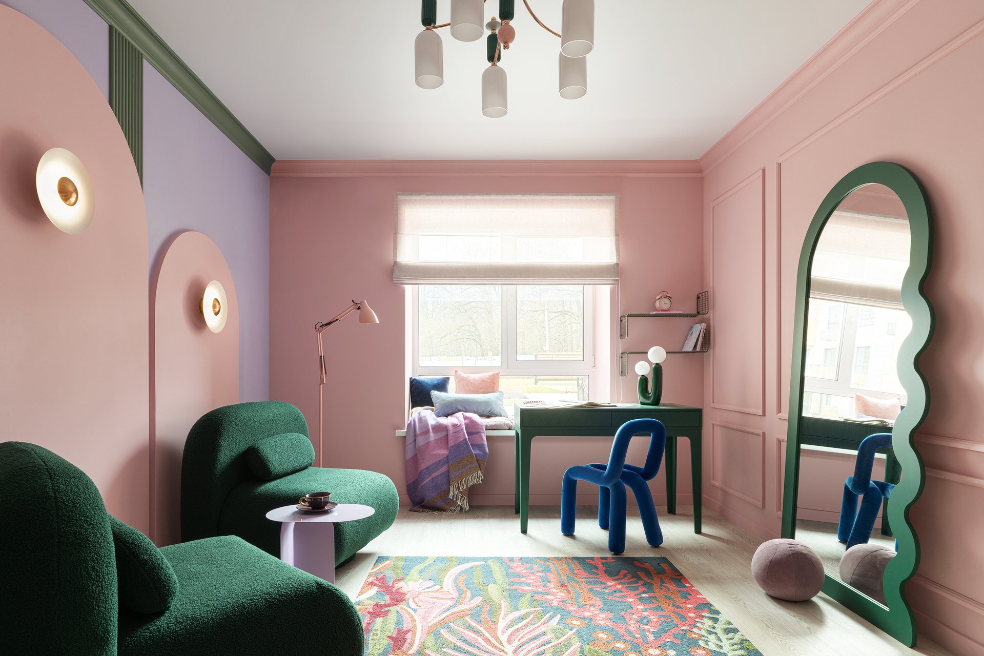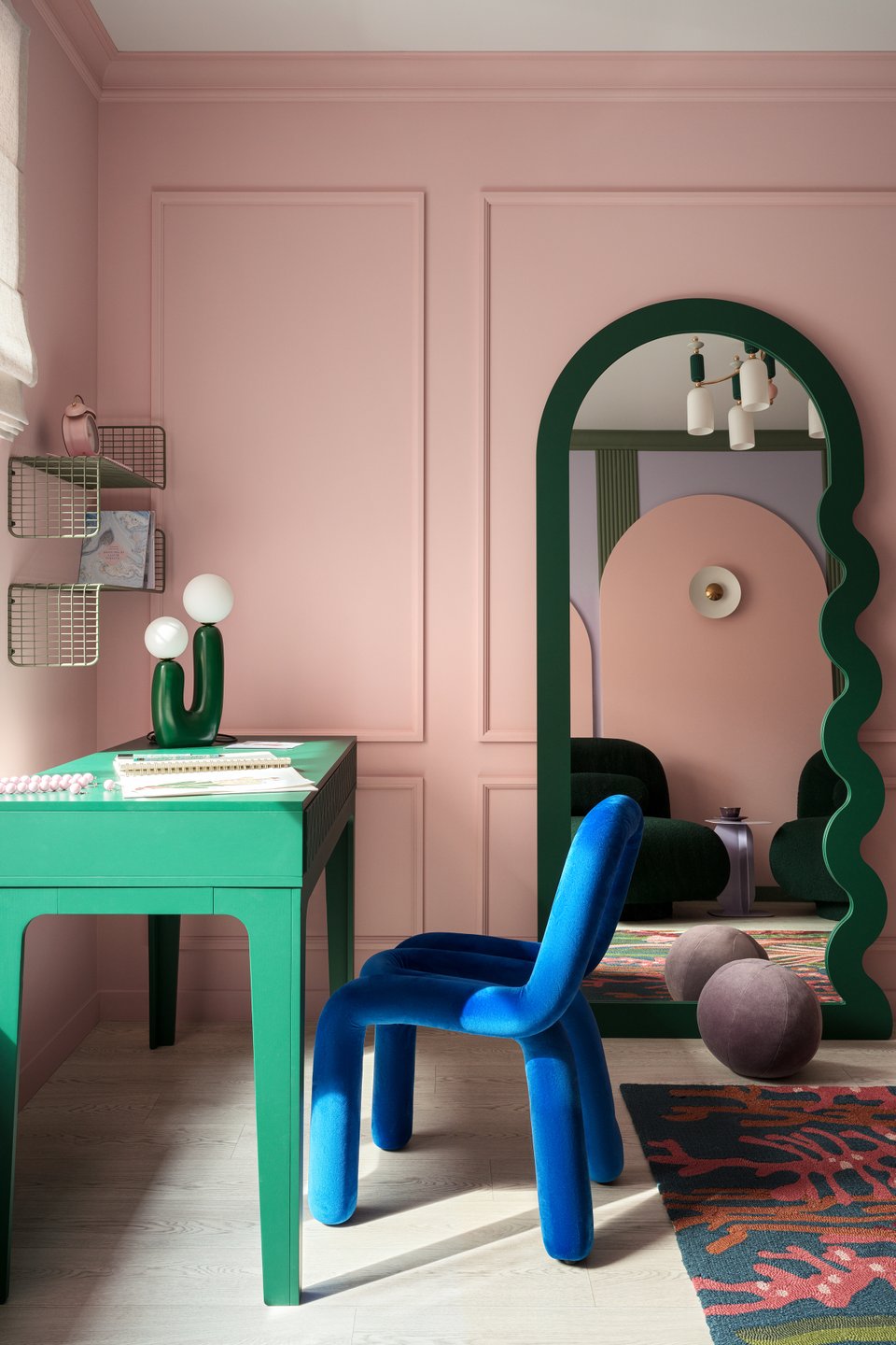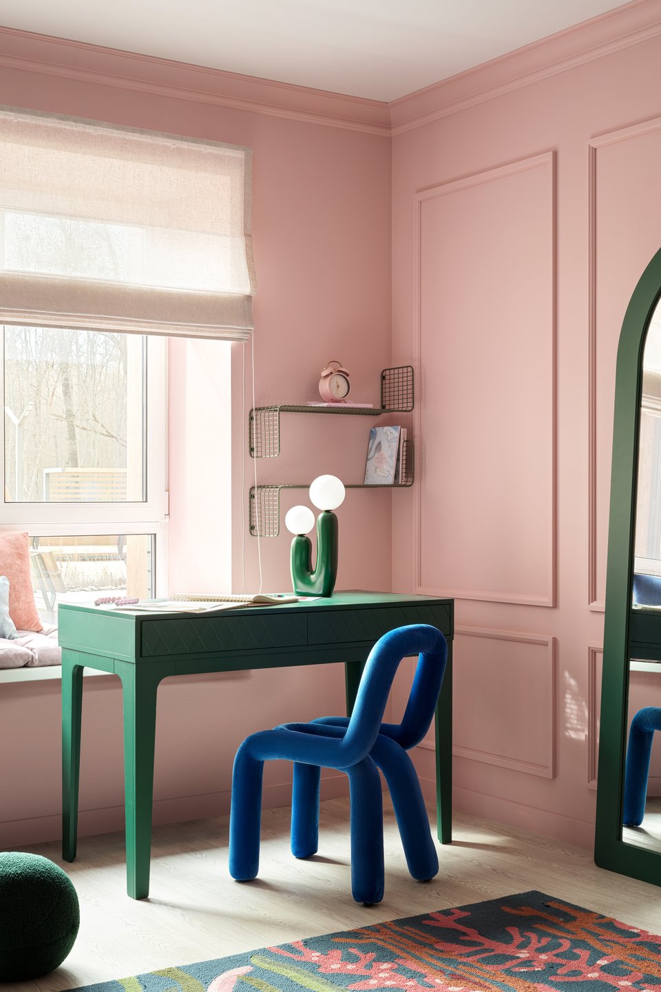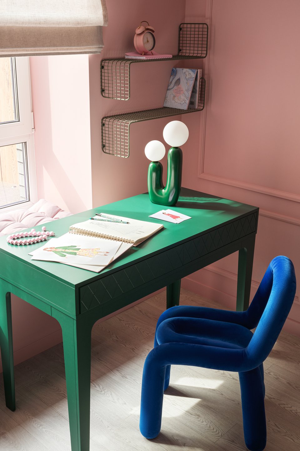 Кабинет получился ярким, трендово-кукольным. По задумке, такой интерьер будет привлекать к блогу заказчицы больше аудитории. Стены выкрасили в нежные оттенки розового и лавандового, задекорировали молдингами и арочными конструкциями. Потолочные карнизы и вертикальные полосы травянисто-зеленого цвета добавляют динамики и визуально вытягивают потолок.