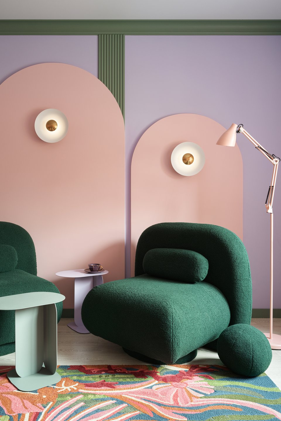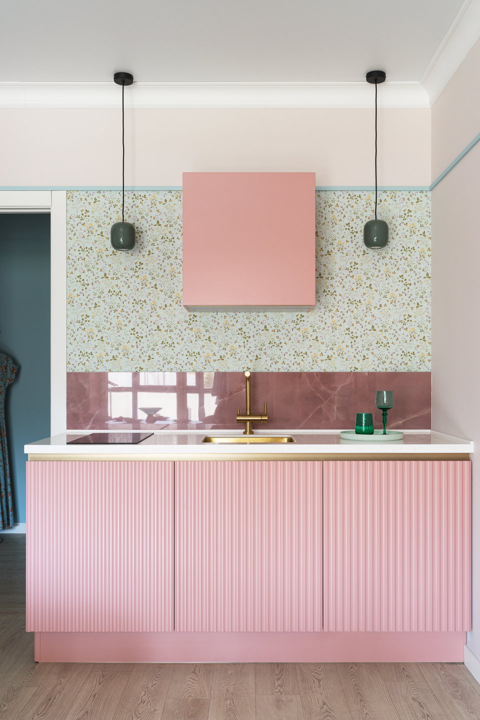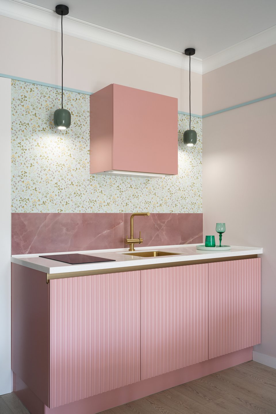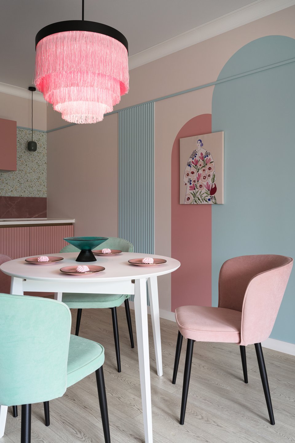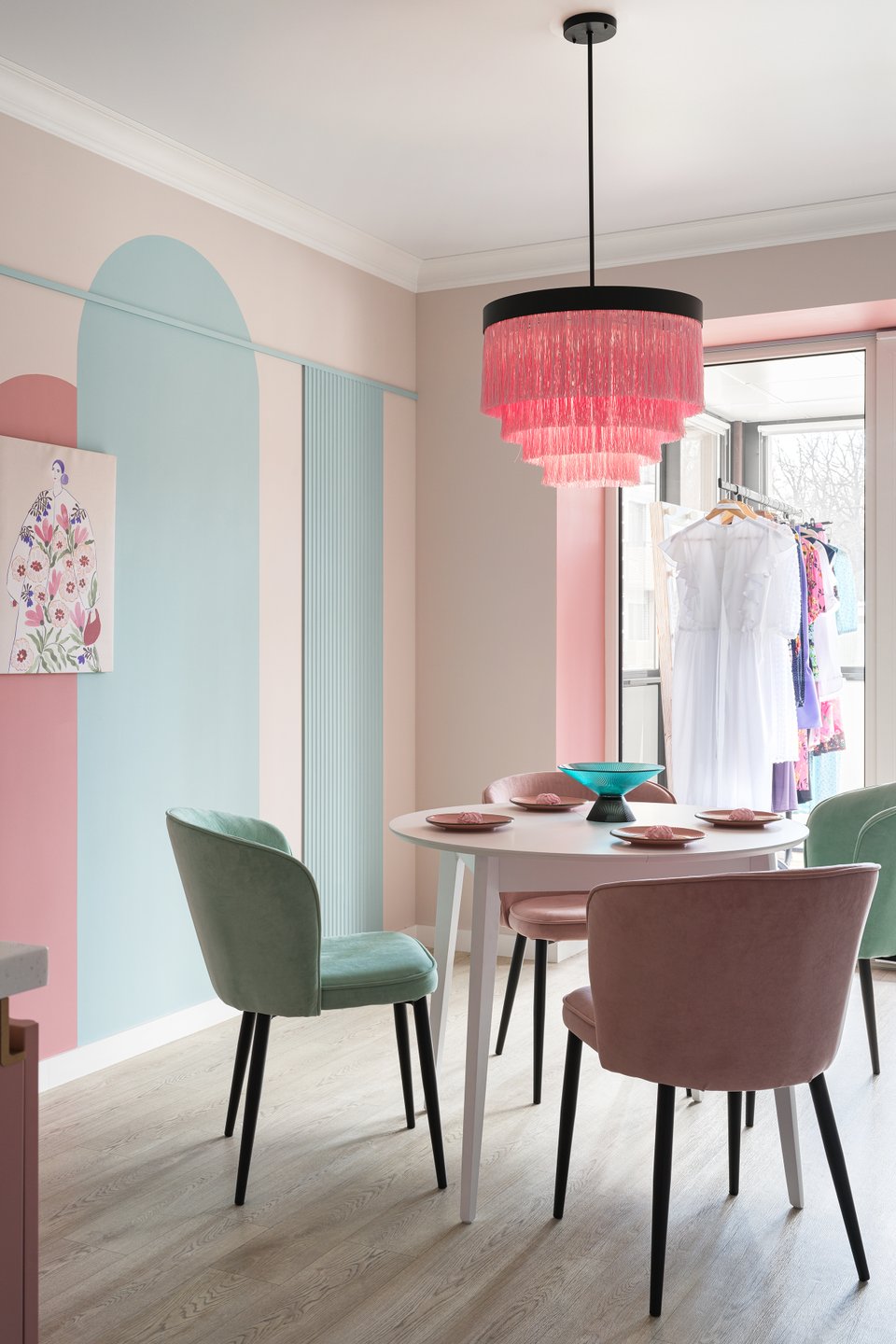 Кухня — яркая и «сладкая», с розовой и мятной мебелью и арочными выкрасами на акцентной стене. Кухонный гарнитур с рифлеными фасадами состоит из трех модулей. Плитка на фартуке поддерживает оттенок мебели. Круглый стол с мягкими стульями — для уютных чаепитий с гостями. Керамические подвесы в зоне кухни похожи на леденцы, абажур из ниток над обеденной зоной символизирует ручную работу, пошив.