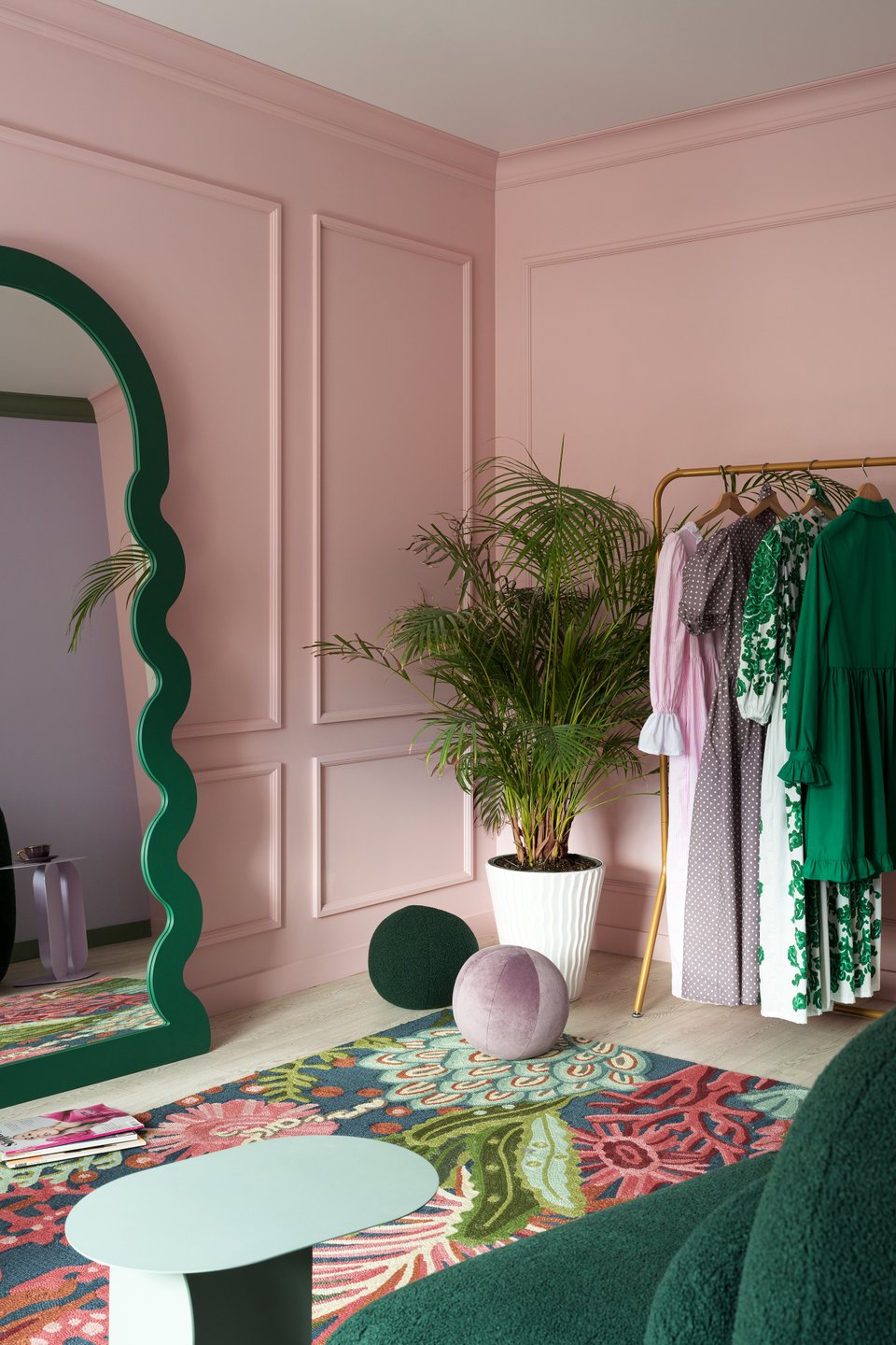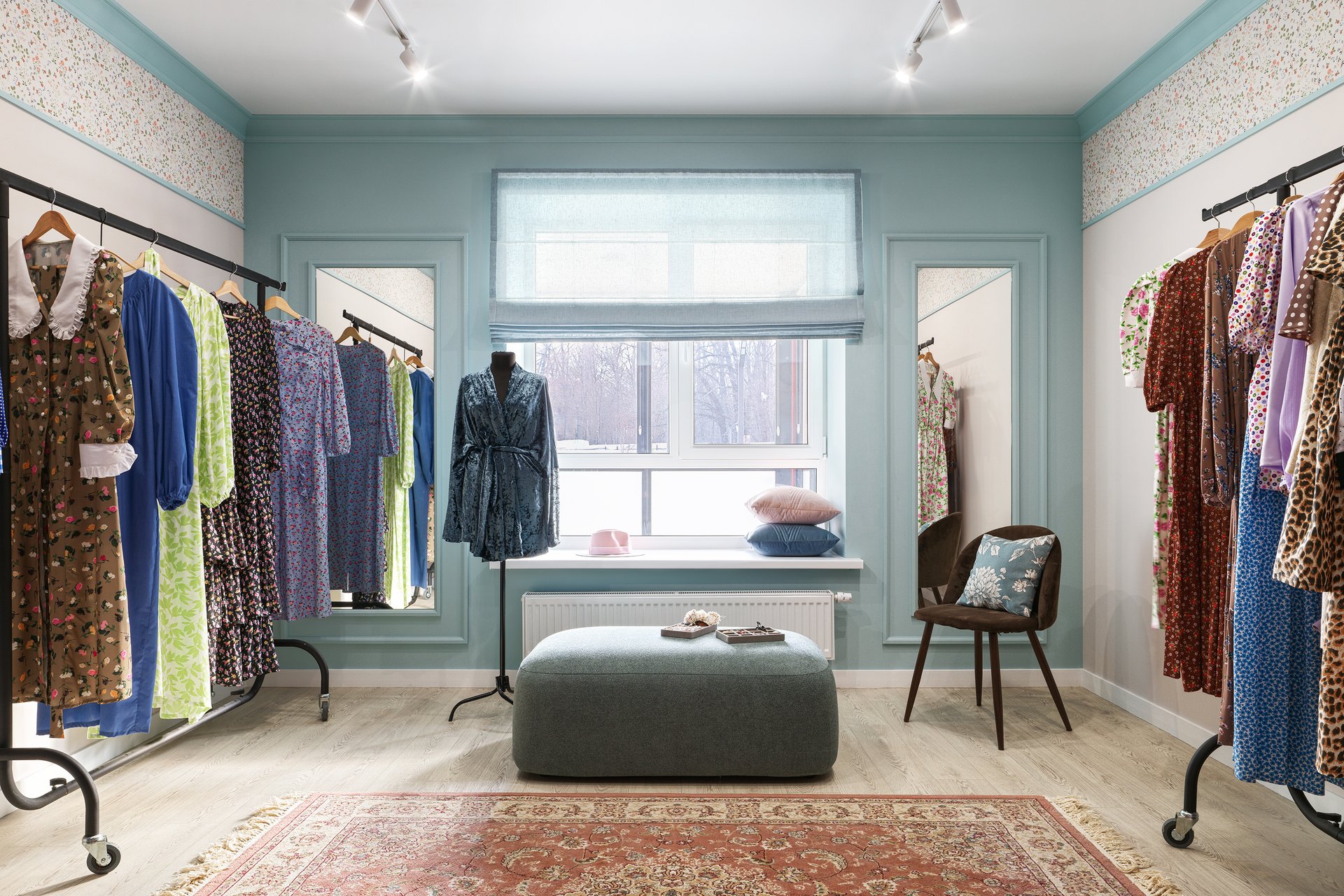 Комната-«домик для платьев» — максимально нежная и женственная, как и коллекции Likemammy. Ретрообои в цветочек, молдинги, небесно-голубая стена и карнизы, большие зеркала — царство красоты и феминности.