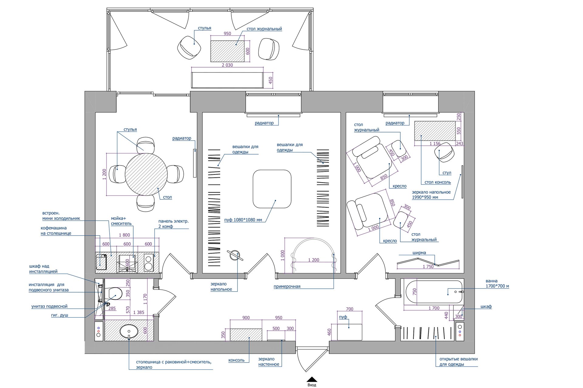 Планировочное решение разрабатывали, исходя из вводных застройщика. На входе посетителей встречает welcome-зона. Одну комнату занимает шоурум с примерочной, во второй находится кабинет — здесь работает владелица. Кухня предназначена для общения с гостями в неформальной обстановке.