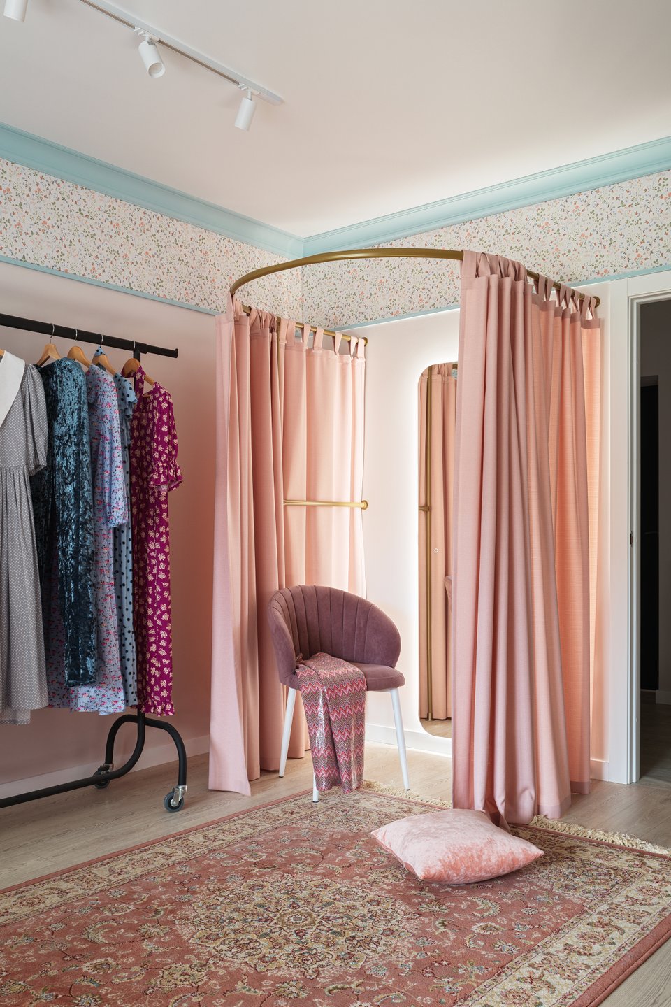 Рейлы с платьями установили вдоль двух стен, примерочную закрыли розовыми шторами. Ковер на полу современный, в винтажном стиле.