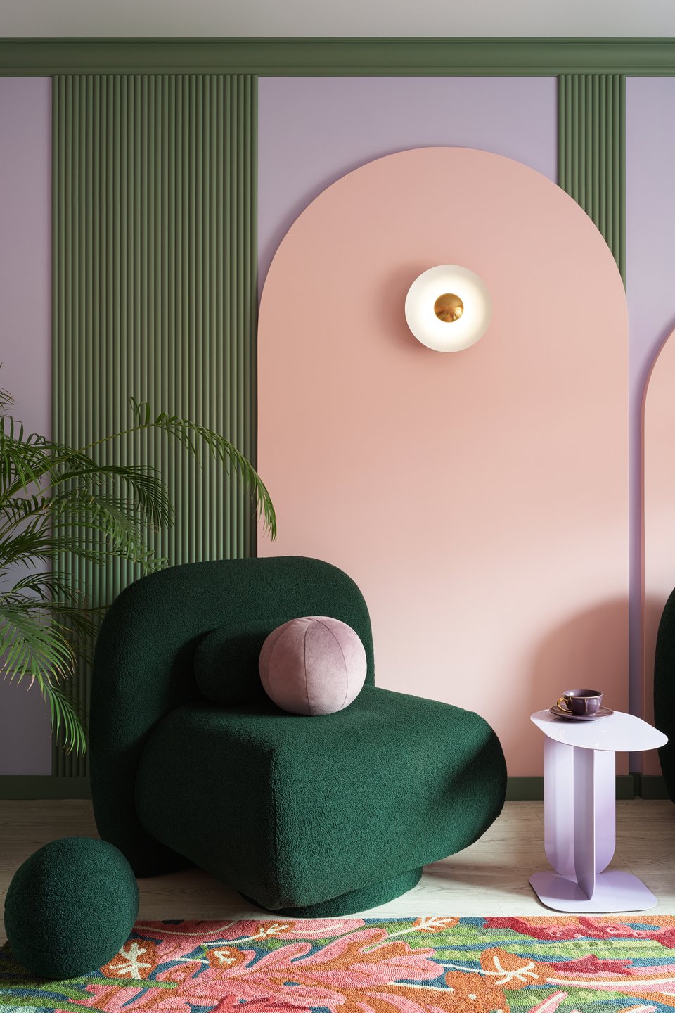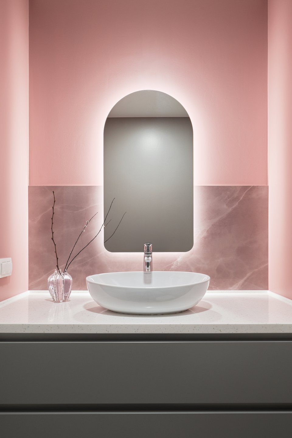 Стену над раковиной в санузле выкрасили той же краской, что и в кухне. Форма зеркала поддерживает тему арок. В качестве базы выбрали нейтральный серый цвет, в сочетании с розовым он станет прекрасной декорацией для съемок.