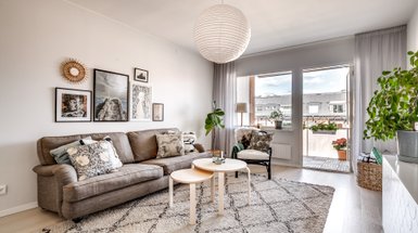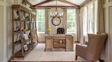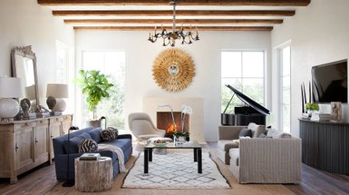 Просторная комната гармонично смотрится с натуральным текстилем и другими природными материалами. Цветовая палитра мягкая, пастельная, без резких контрастов.