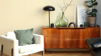 Палитра — бело-бежево-коричневая, с черными акцентами, добавляющими помещению выразительности. Бонсай, каллиграфическое панно, рассеянный свет здесь тоже уместны. Текстиль подбирайте с растительным или геометрическим принтом.