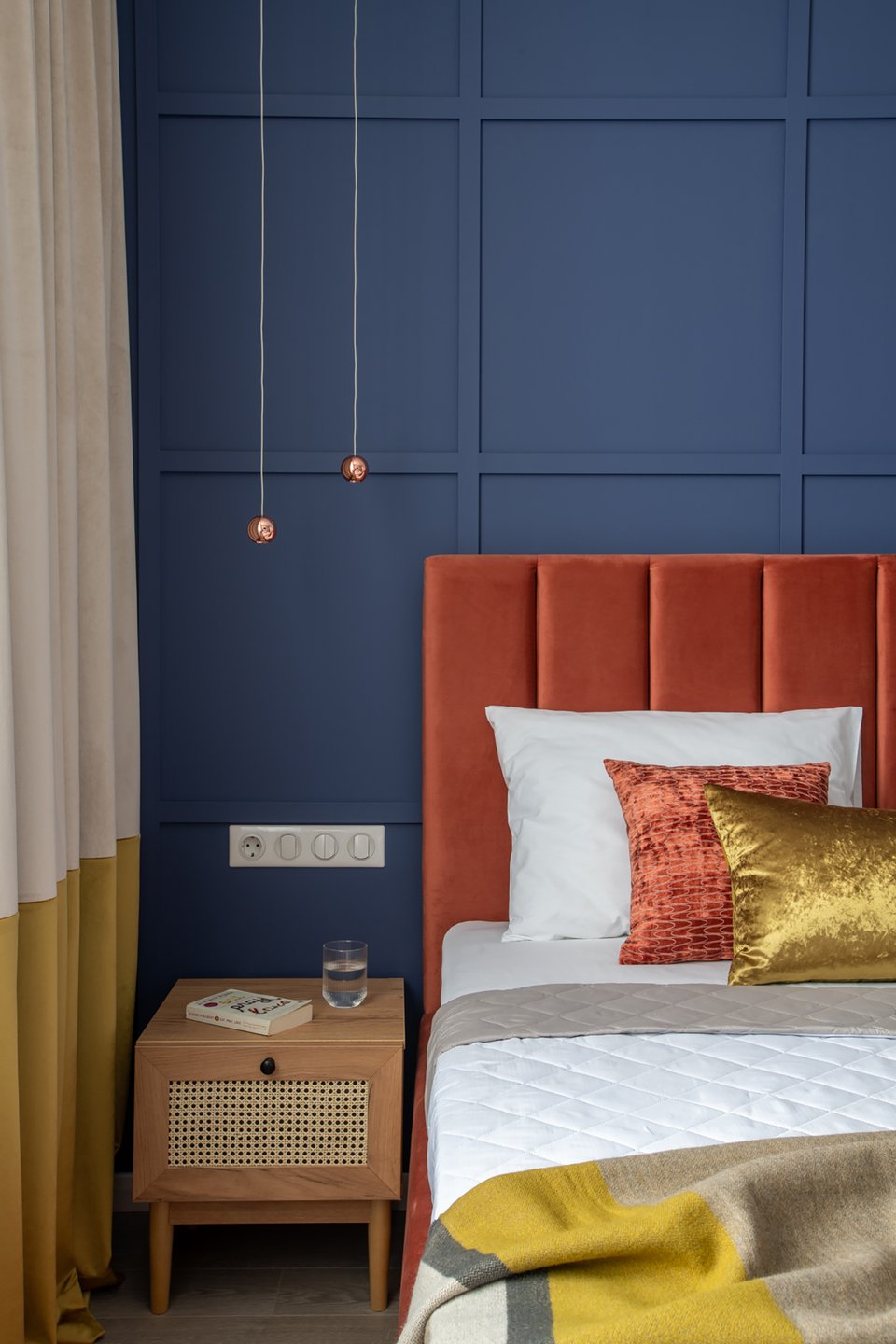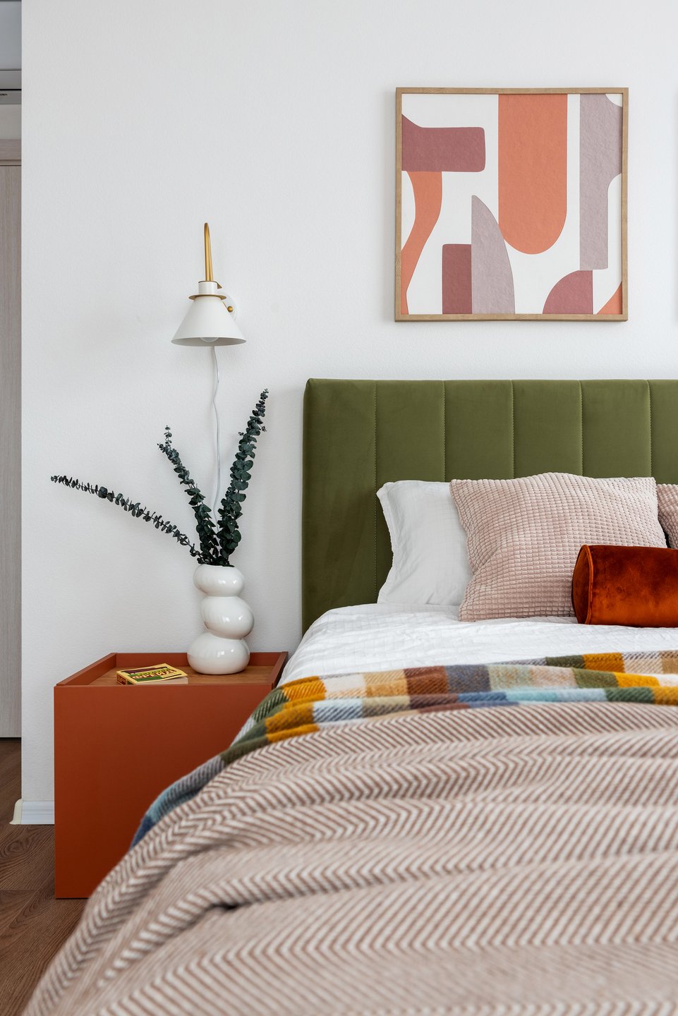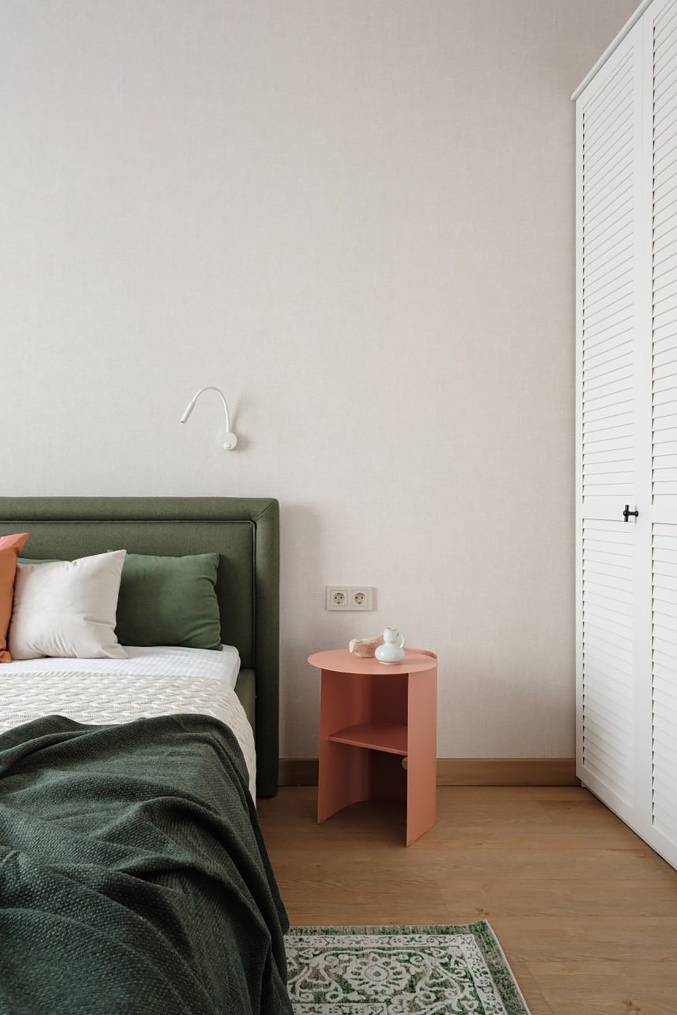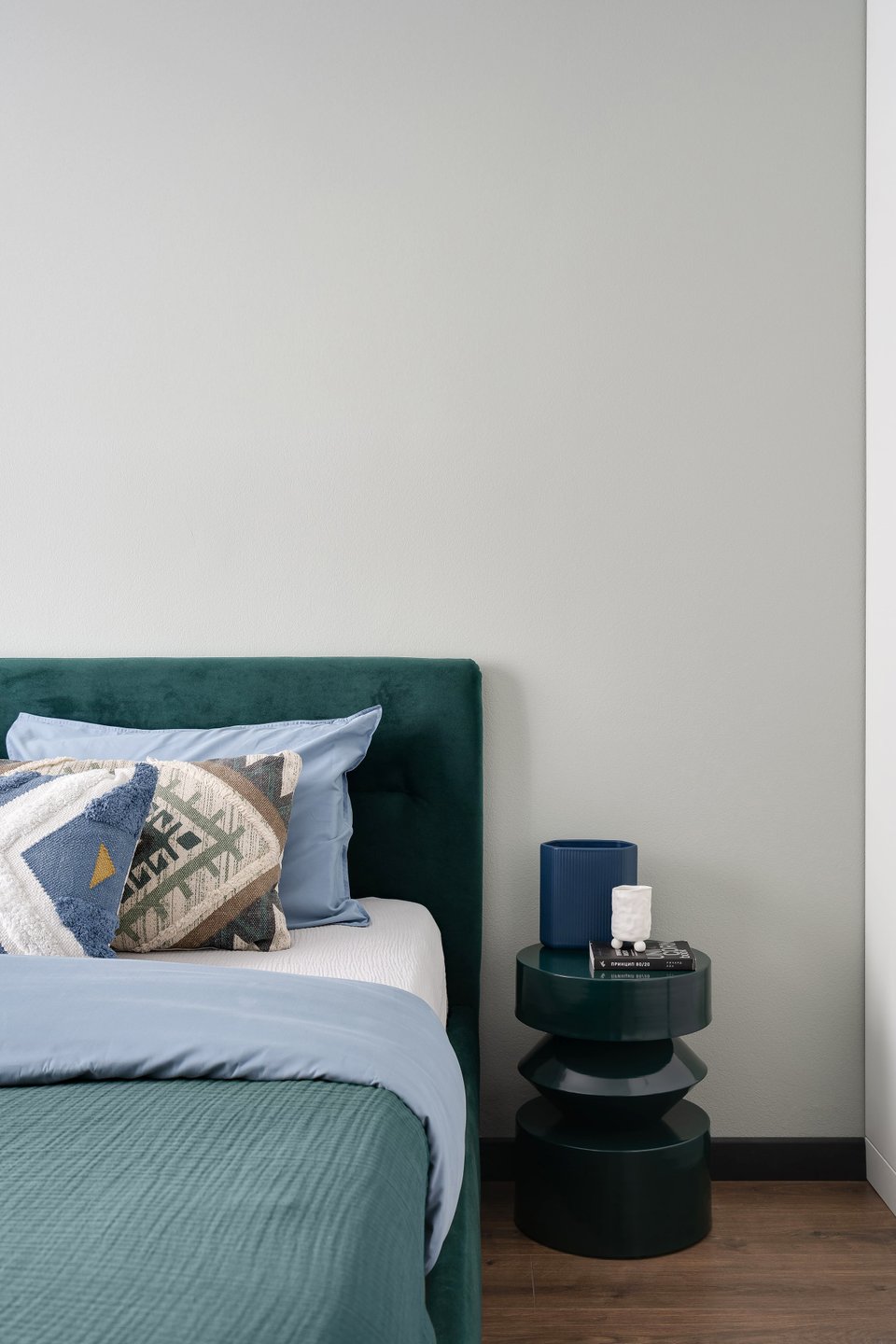 Например, для проекта на фотографии ниже выбрали узкую тумбу высотой до матраса. Ее оттенок перекликается с акцентным фартуком кухни, а форма — с журнальным столиком у дивана.