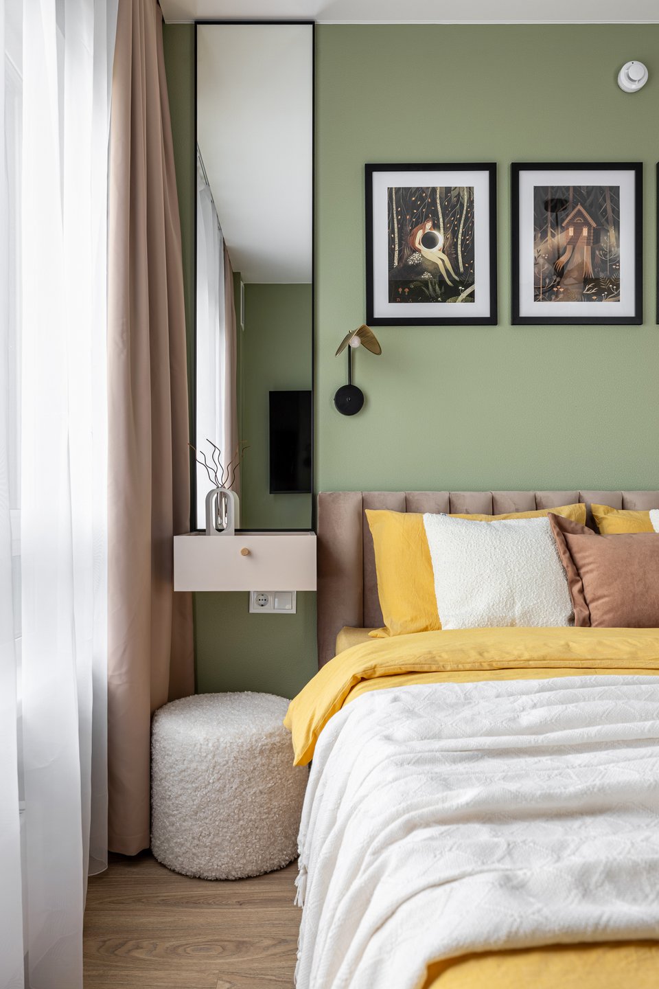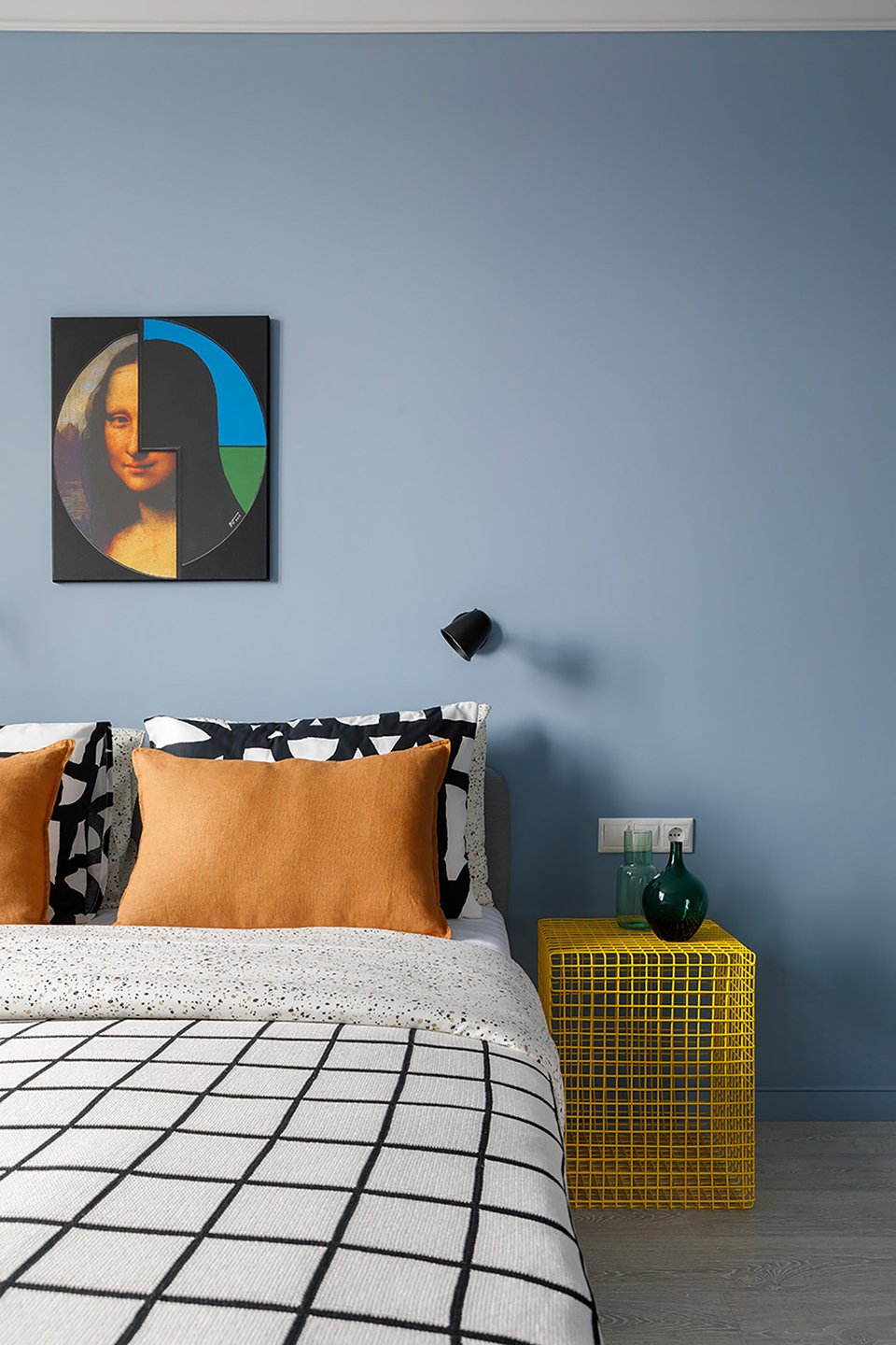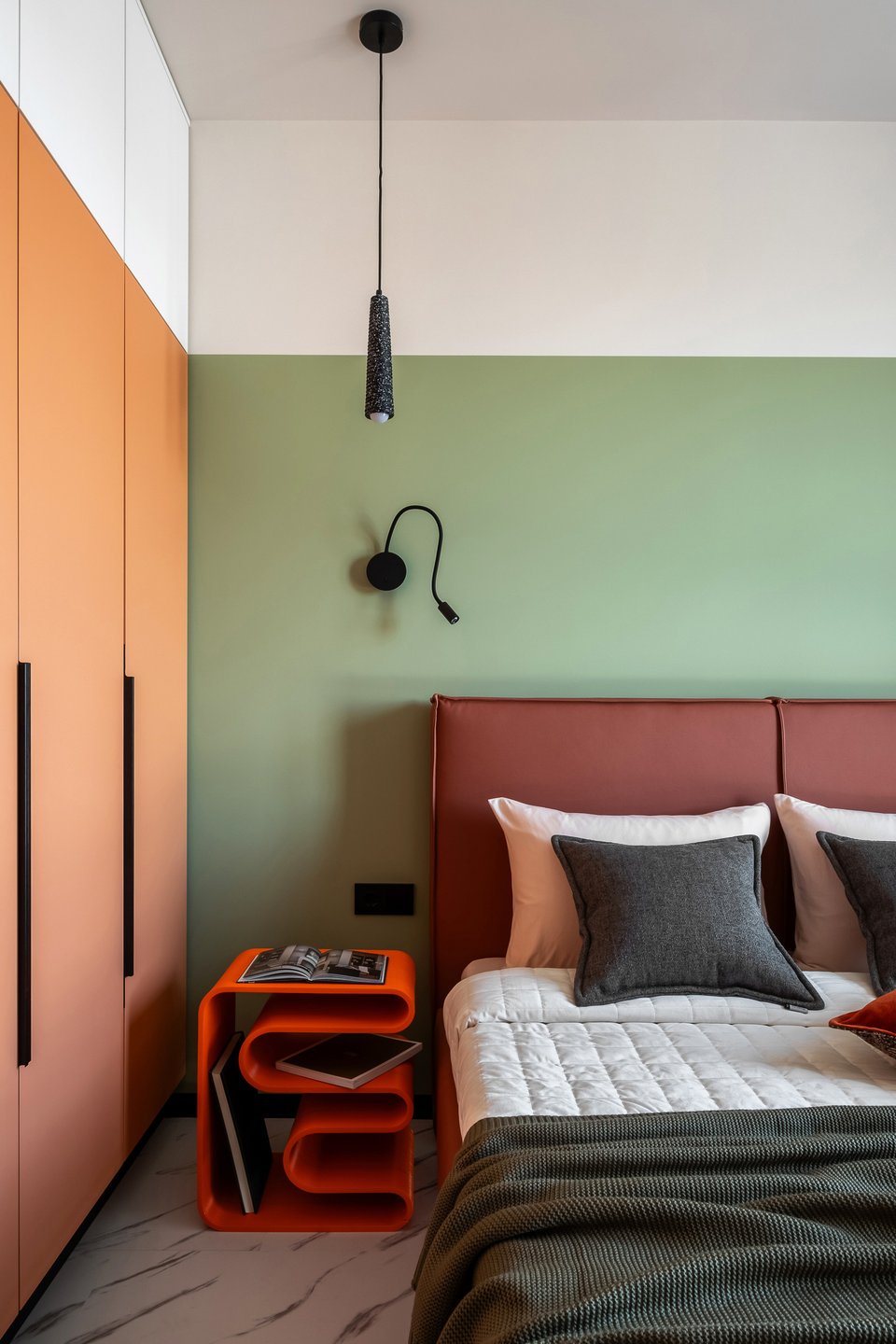 Например, для проекта на фотографии ниже выбрали узкую тумбу высотой до матраса. Ее оттенок перекликается с акцентным фартуком кухни, а форма — с журнальным столиком у дивана.