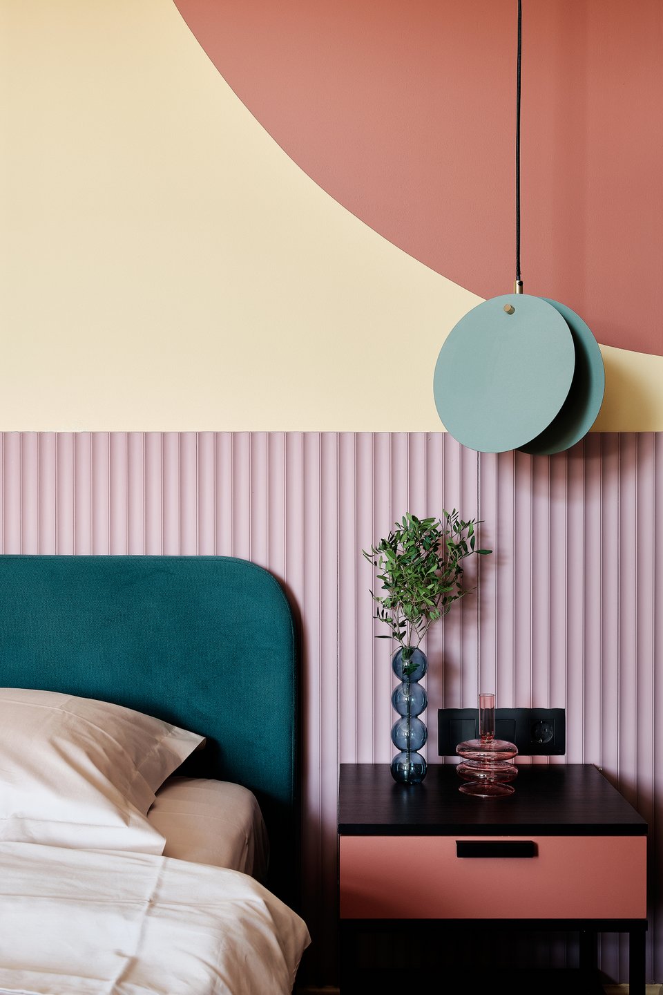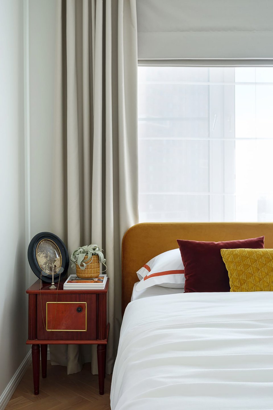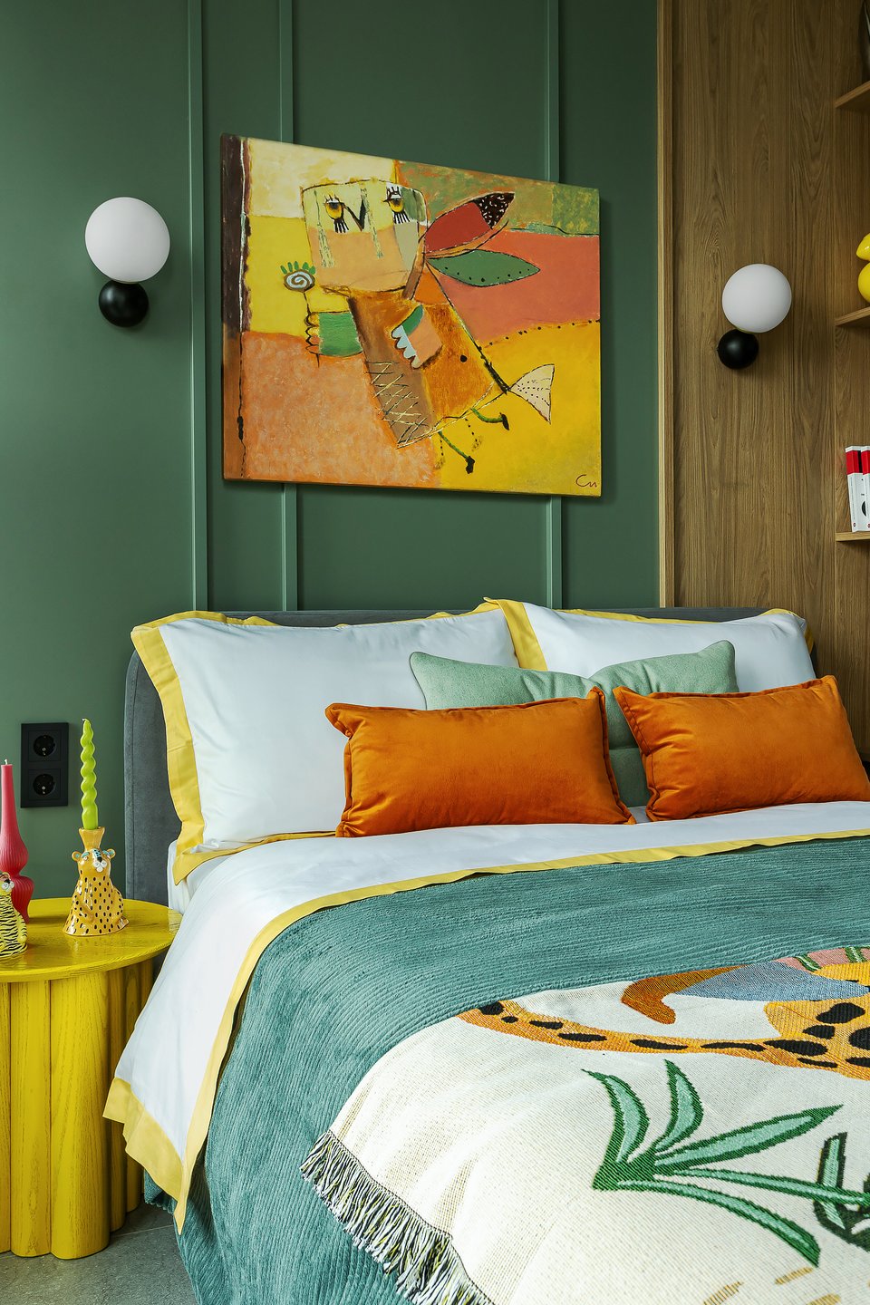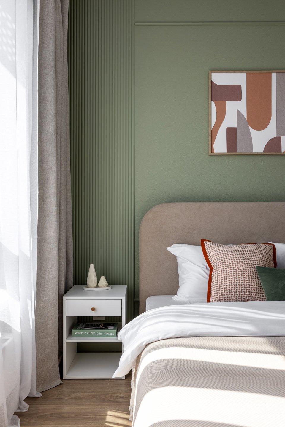 Например, для проекта на фотографии ниже выбрали узкую тумбу высотой до матраса. Ее оттенок перекликается с акцентным фартуком кухни, а форма — с журнальным столиком у дивана.