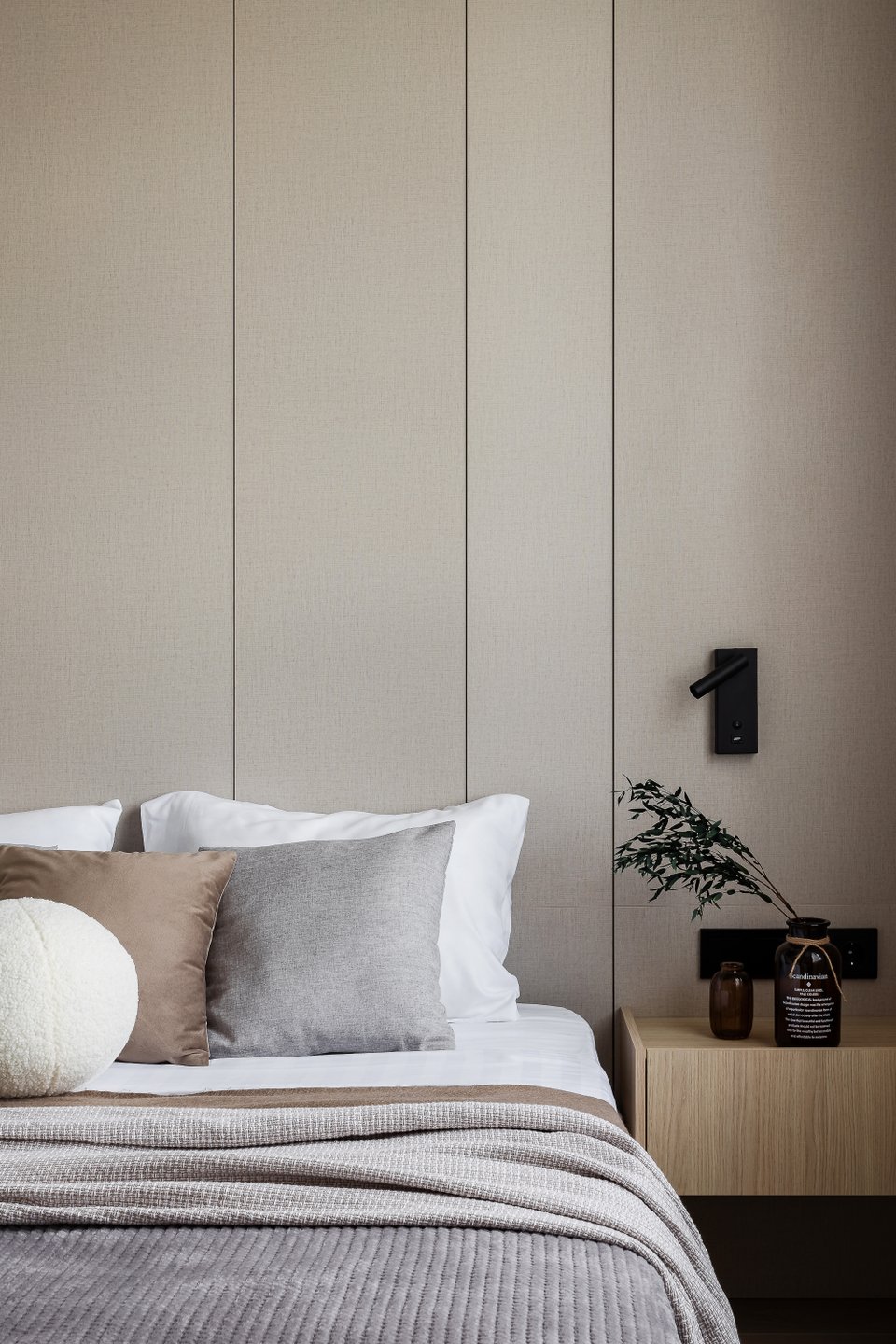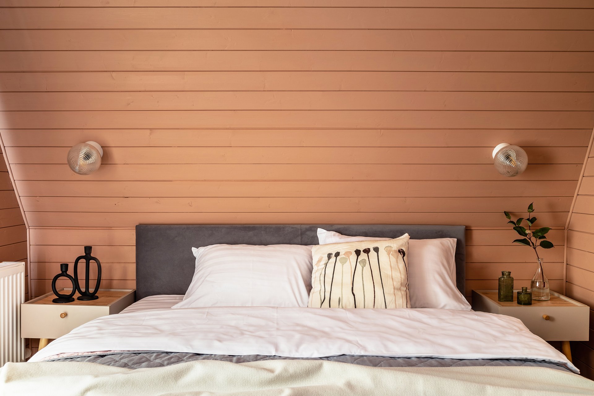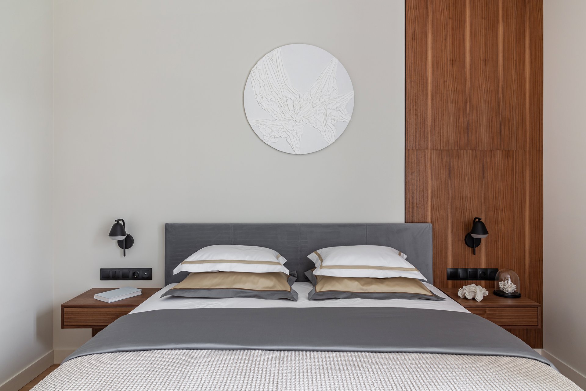 В этом проекте декором служит яркая деревянная панель на стене. Тумбочки подобрали в том же цвете, чтобы добавить пространству живости, но сохранить ощущение простора. Для этой же цели поставили лаконичную, максимально нейтральную кровать.
