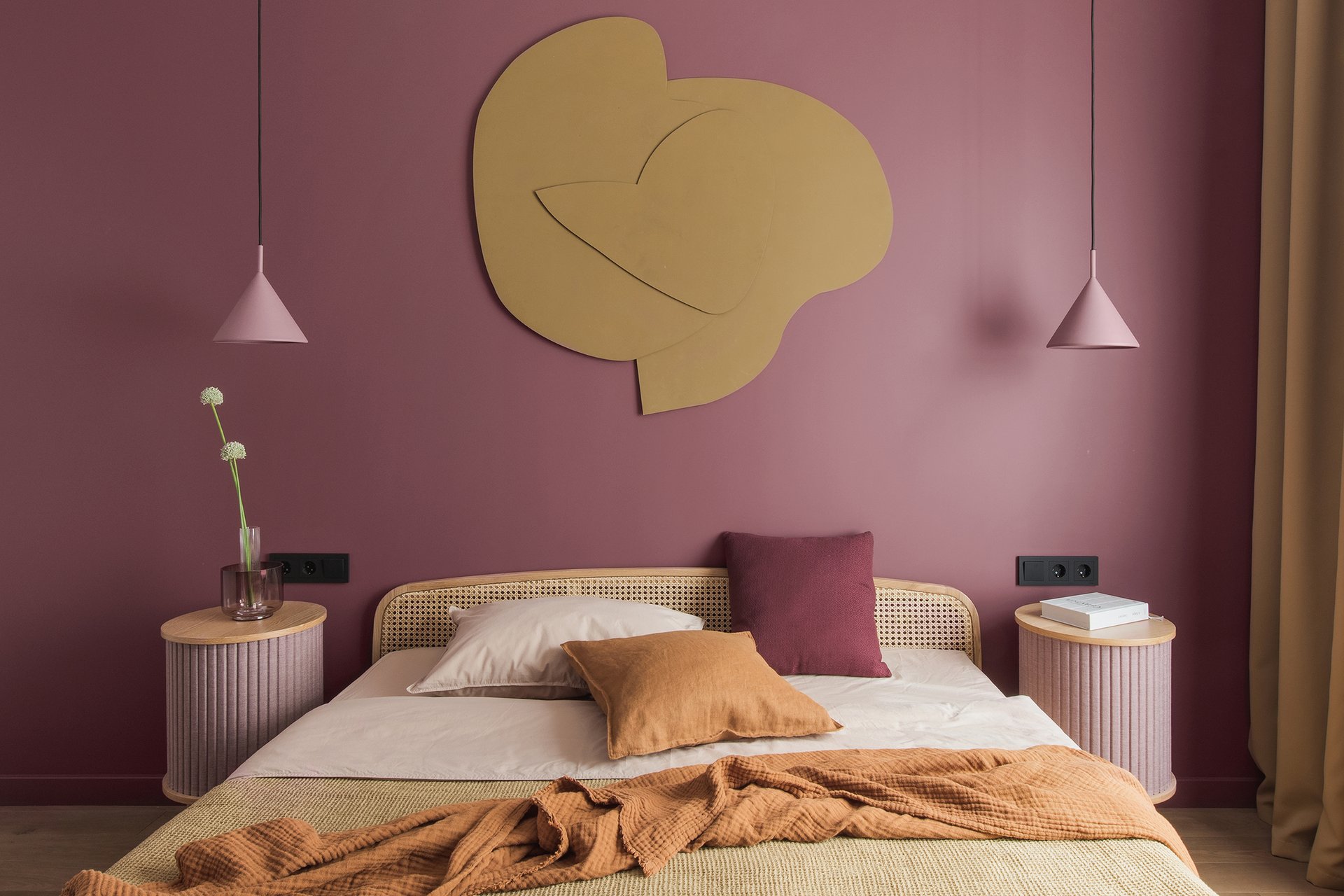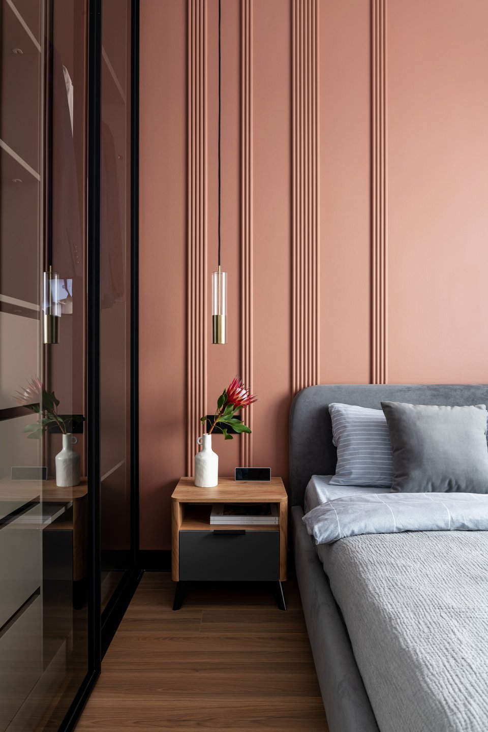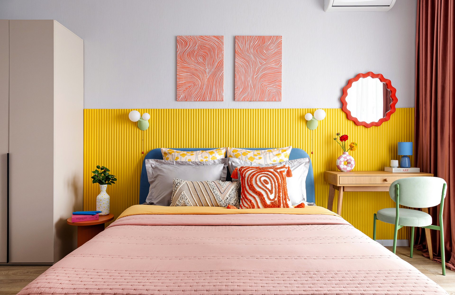 В этом проекте декором служит яркая деревянная панель на стене. Тумбочки подобрали в том же цвете, чтобы добавить пространству живости, но сохранить ощущение простора. Для этой же цели поставили лаконичную, максимально нейтральную кровать.