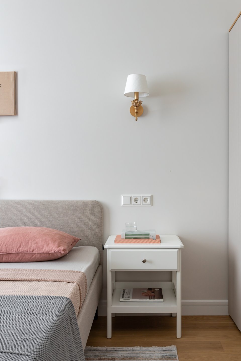- На фото 3: однушка 38 кв.м, ЖК «Кронштадтский». В кадре кровать Лайтси 160 и тумба подвесная Ивейн-9 — все от divan.ru. Дизайнер: Мария Ничипоренко; фотограф: Максим Канакин