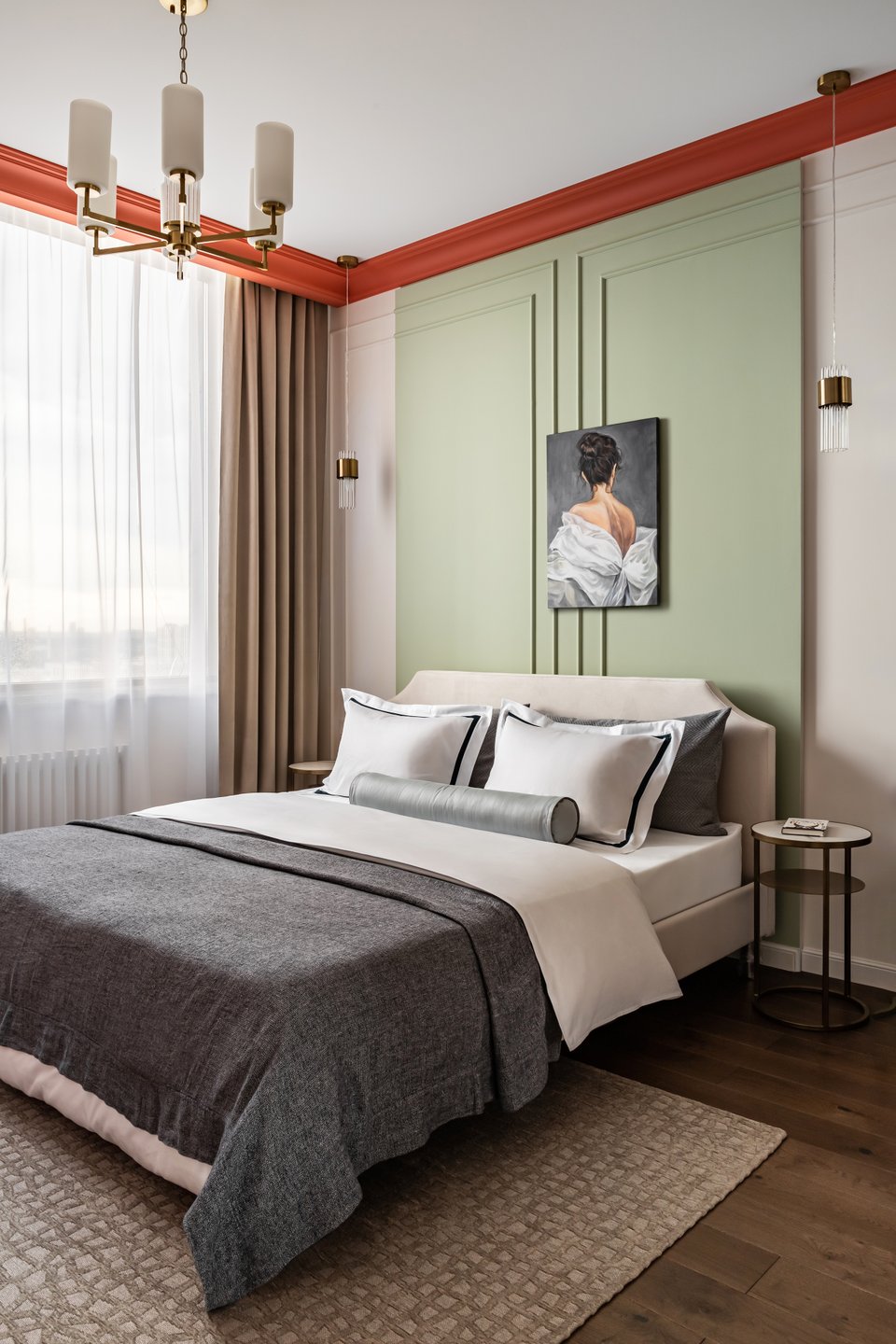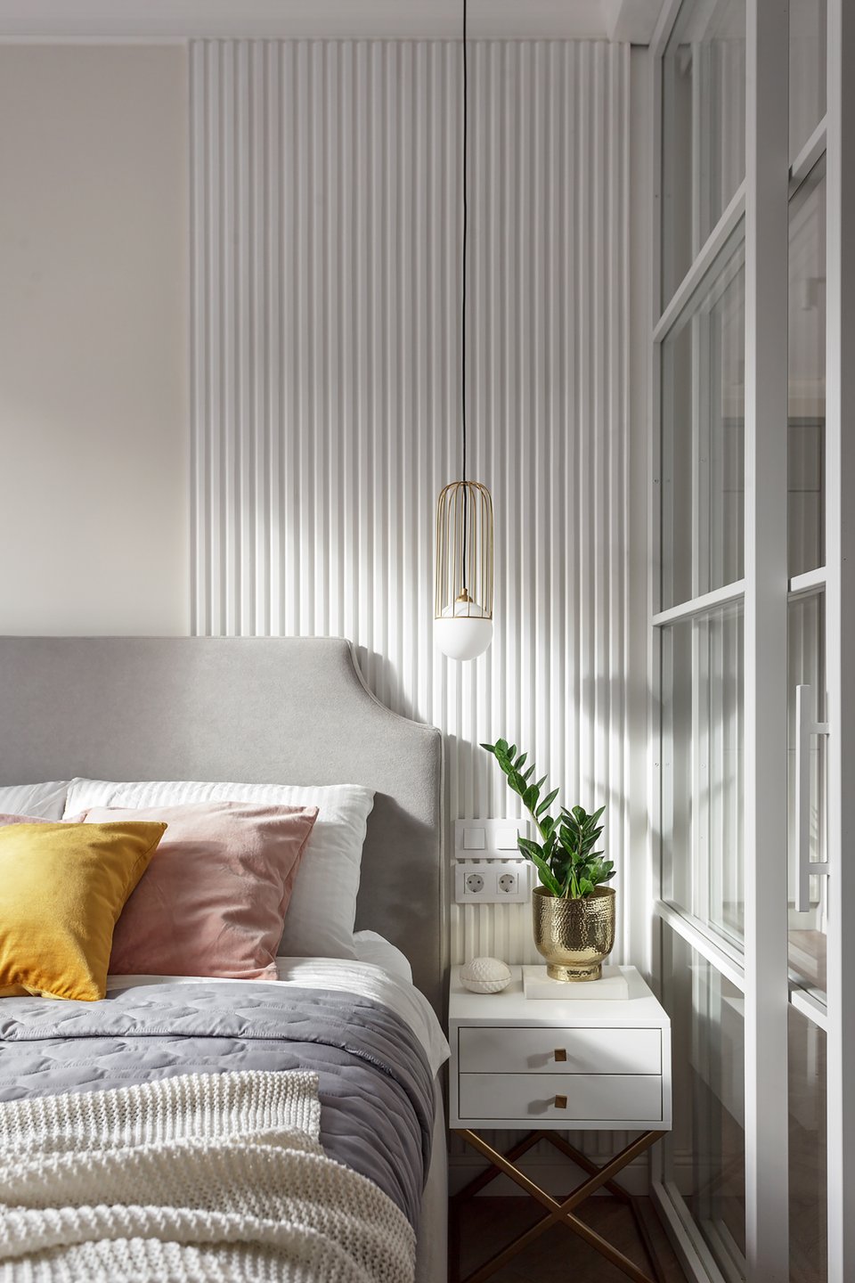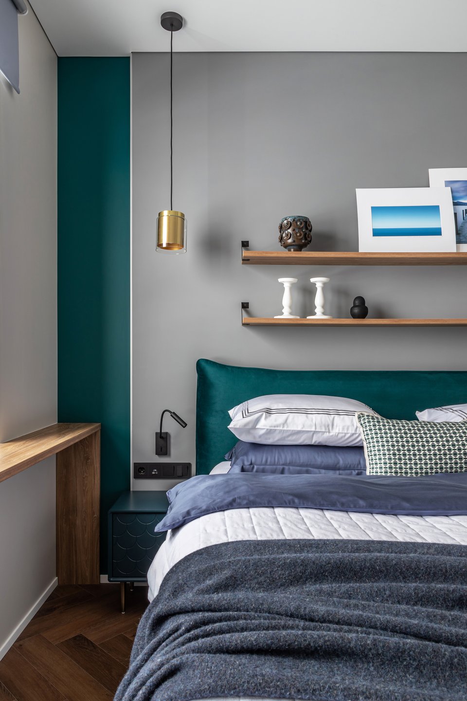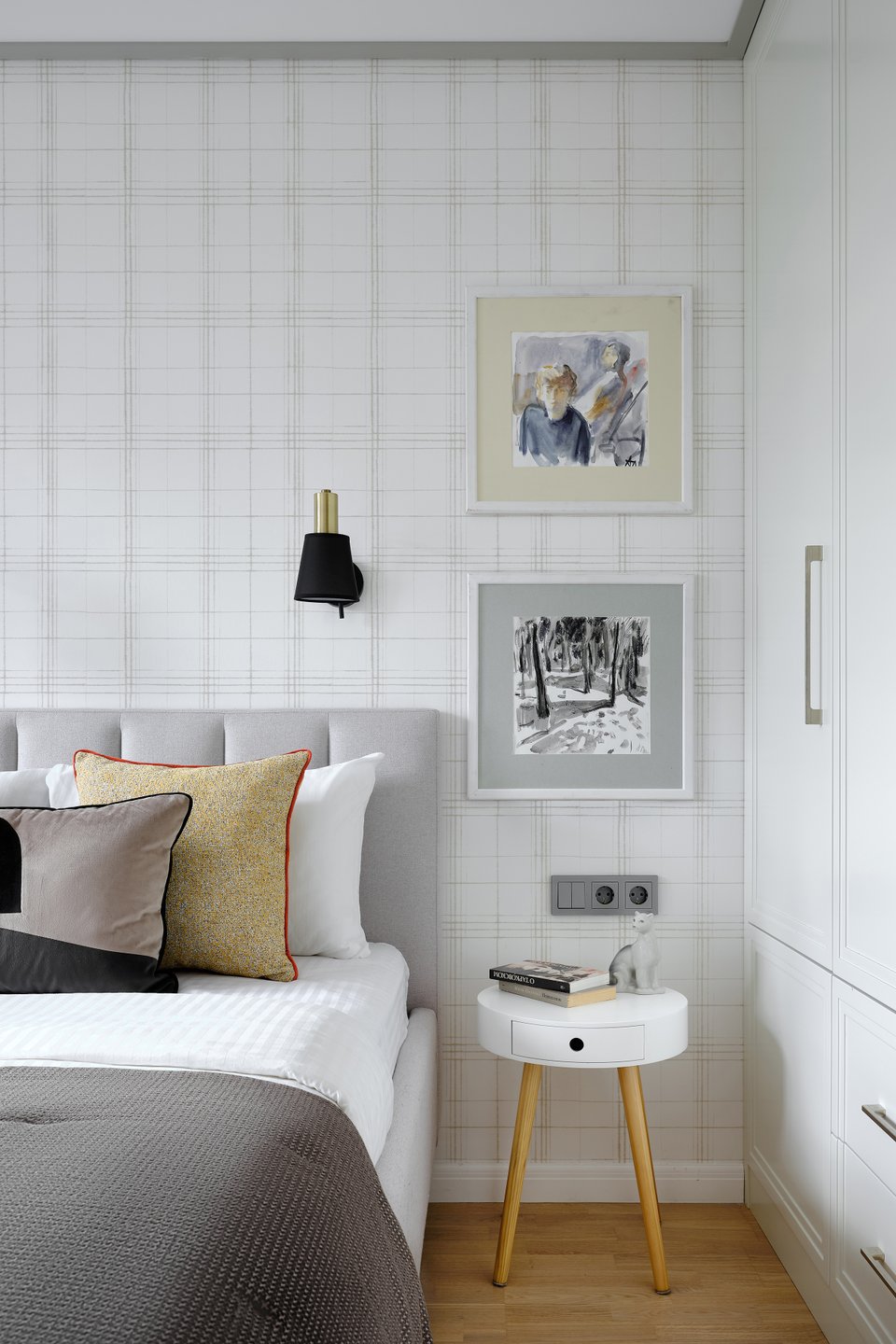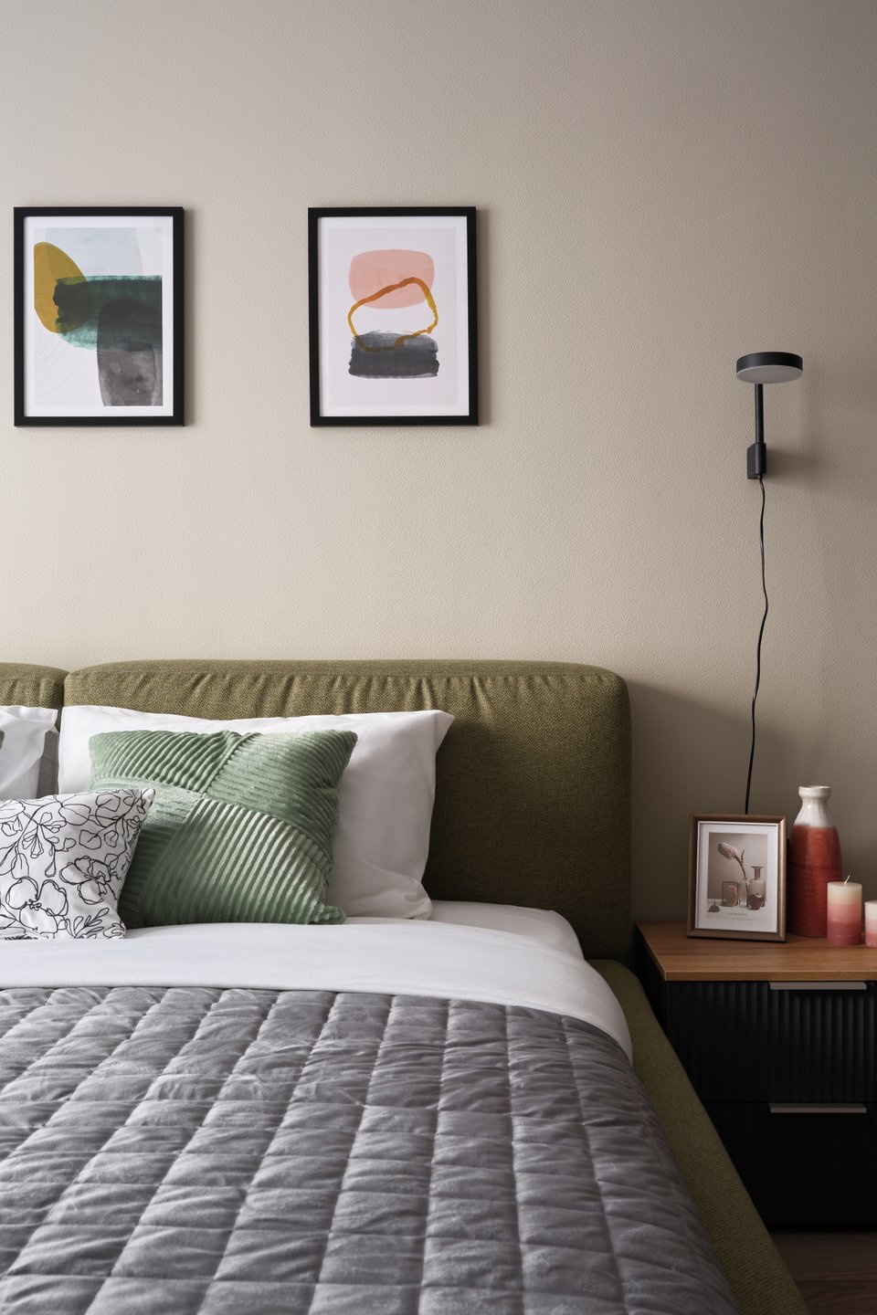 - На фото 1: двушка 60 кв.м, ЖК «Петровский парк». В кадре кровать Слипсон 160 от divan.ru. Дизайнер: Полина Агафонова; стилист: Ирина Темнова; фотограф: Антон Лихтарович