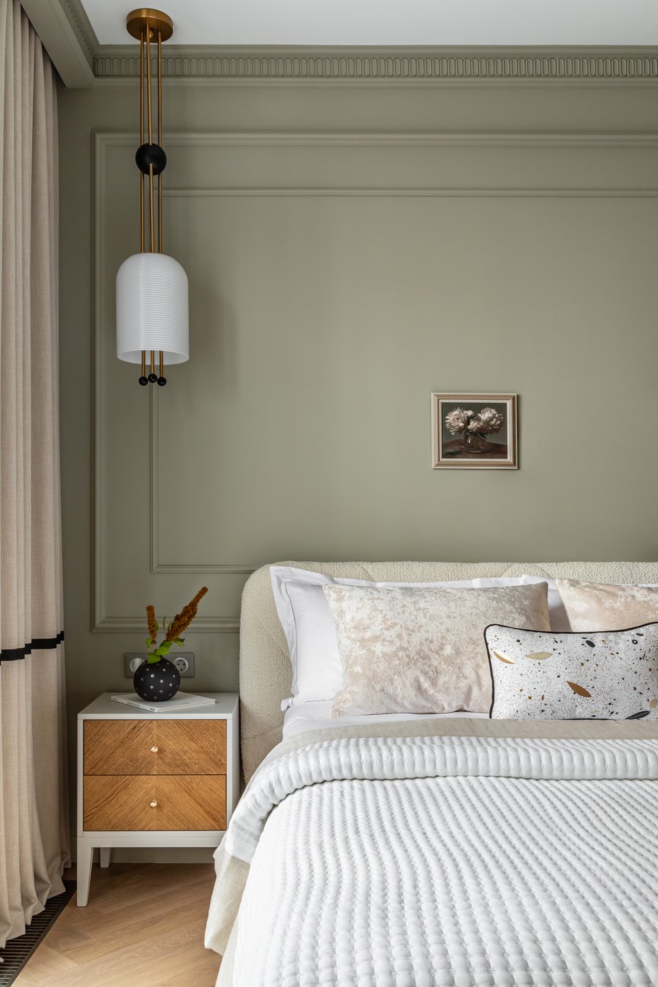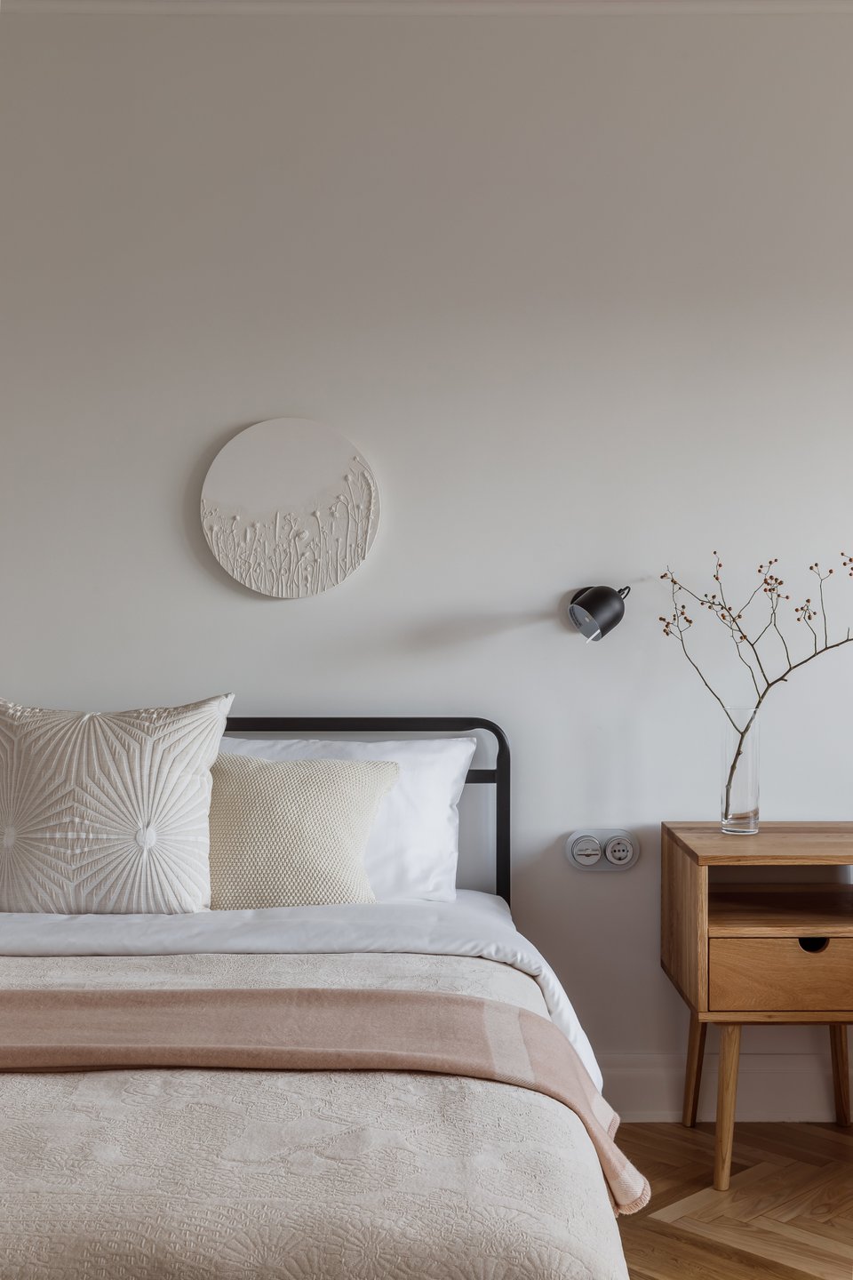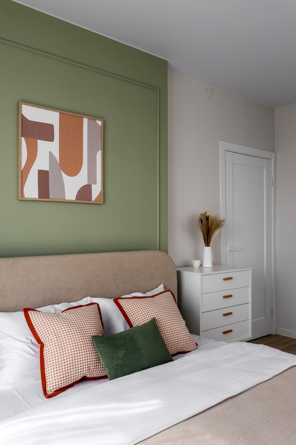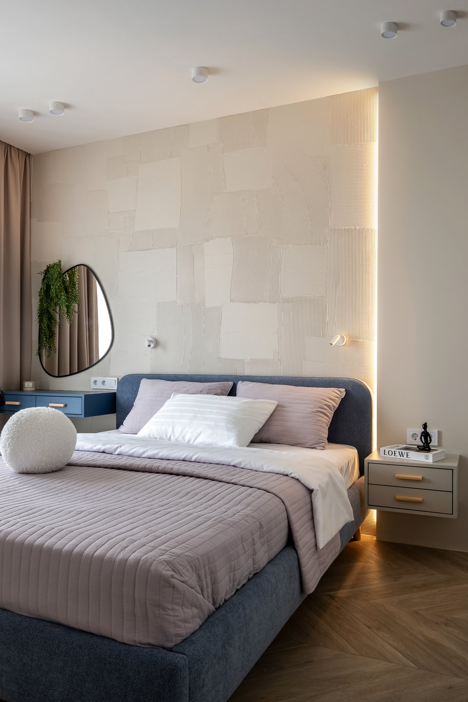 - На фото 1: двушка 60 кв.м, ЖК «Петровский парк». В кадре кровать Слипсон 160 от divan.ru. Дизайнер: Полина Агафонова; стилист: Ирина Темнова; фотограф: Антон Лихтарович