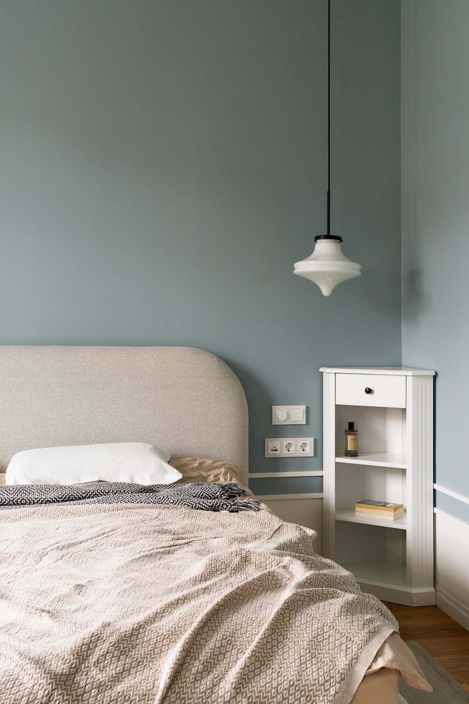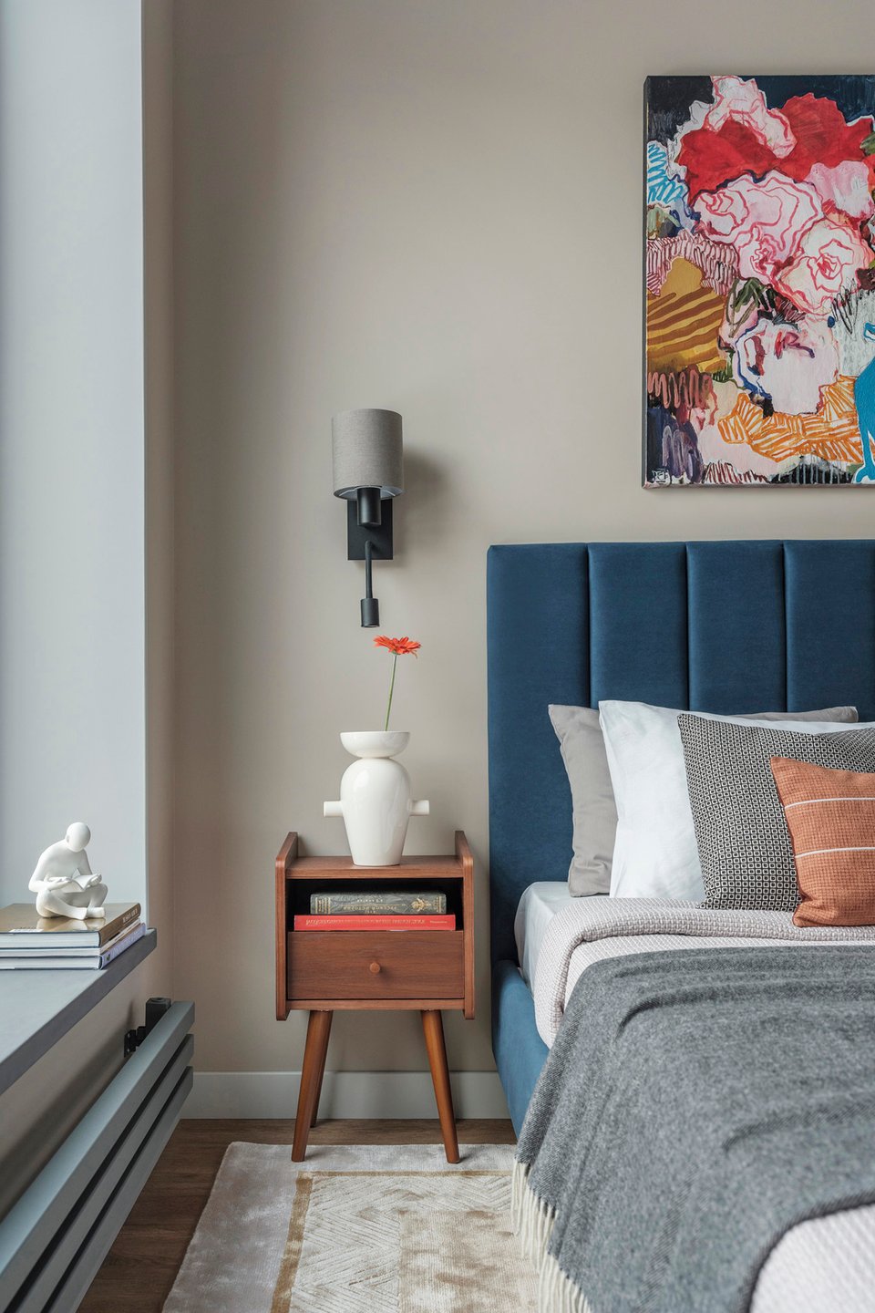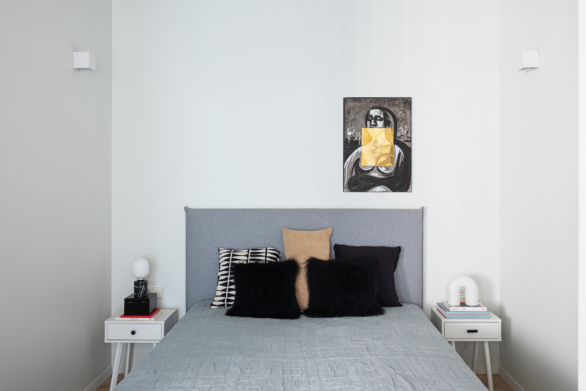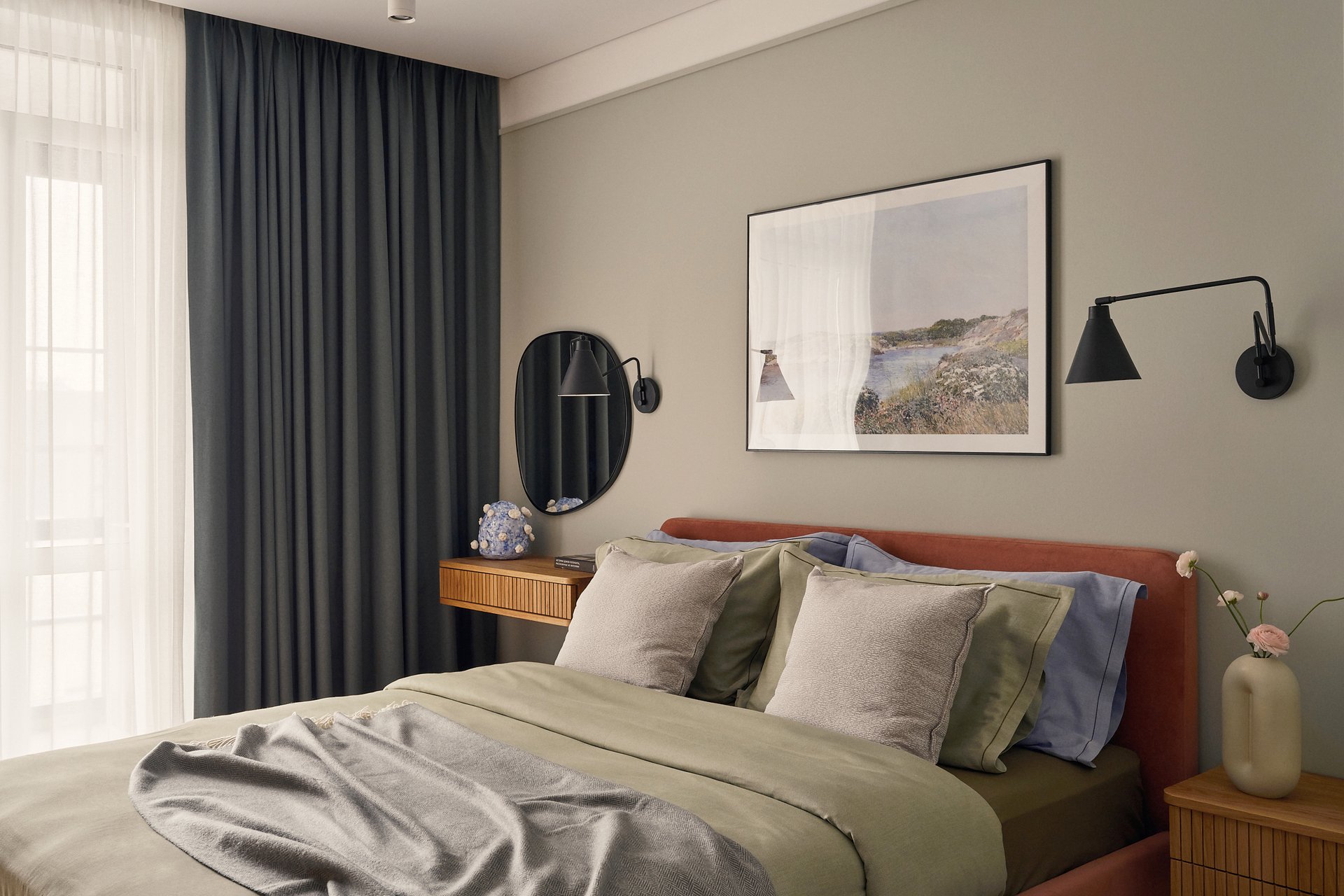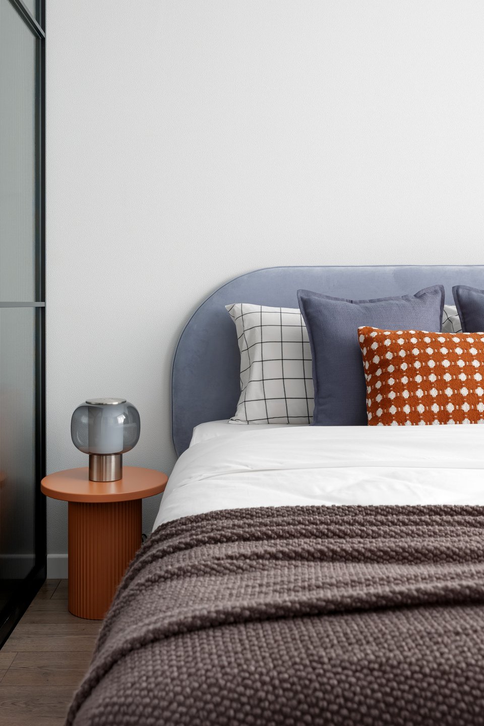 - На фото 1: двушка 60 кв.м, ЖК «Петровский парк». В кадре кровать Слипсон 160 от divan.ru. Дизайнер: Полина Агафонова; стилист: Ирина Темнова; фотограф: Антон Лихтарович