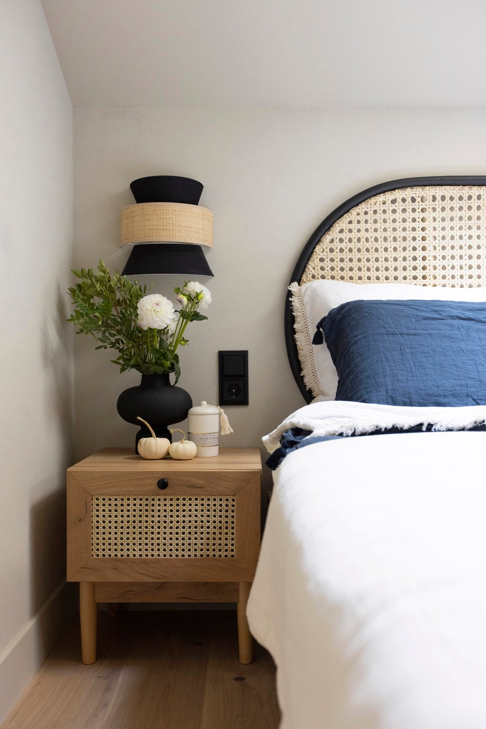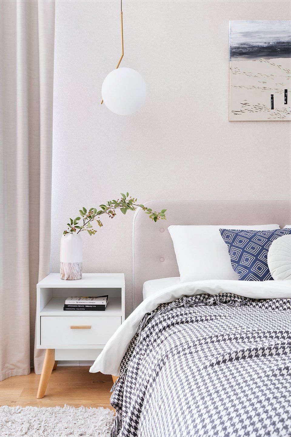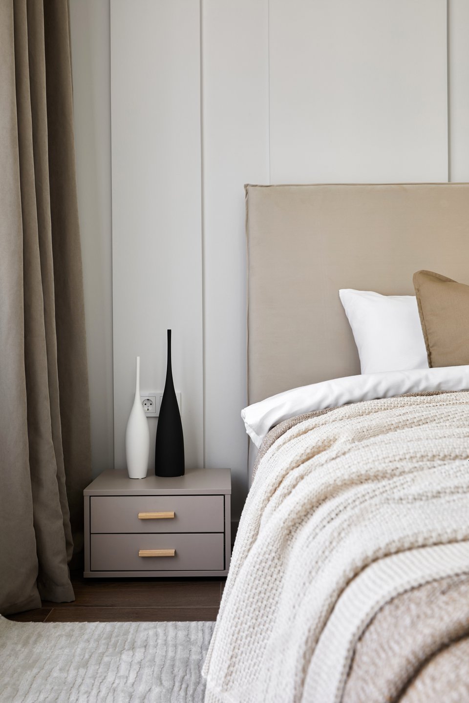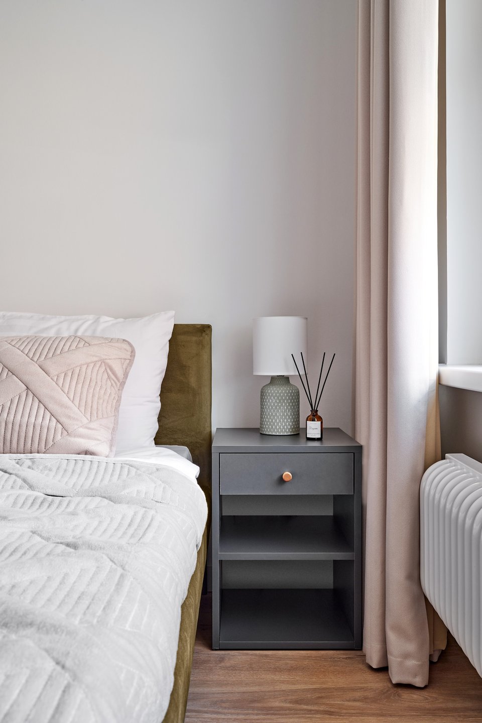 Стандартная ширина прикроватной тумбочки в спальне позволяет разместить на столешнице лампу, несколько предметов и при этом оставляет пространство между краем кровати и тумбой для прохода.
