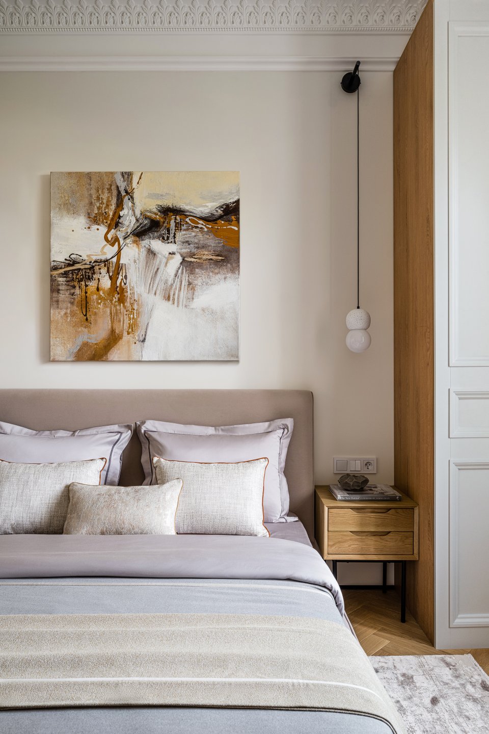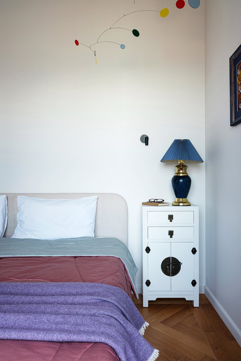 - На фото 4: «сталинка» 83 кв.м в г. Москве. В кадре кровать Кевия 160. Дизайнер: Мария Гуляева; фотограф: Марина Сурмай