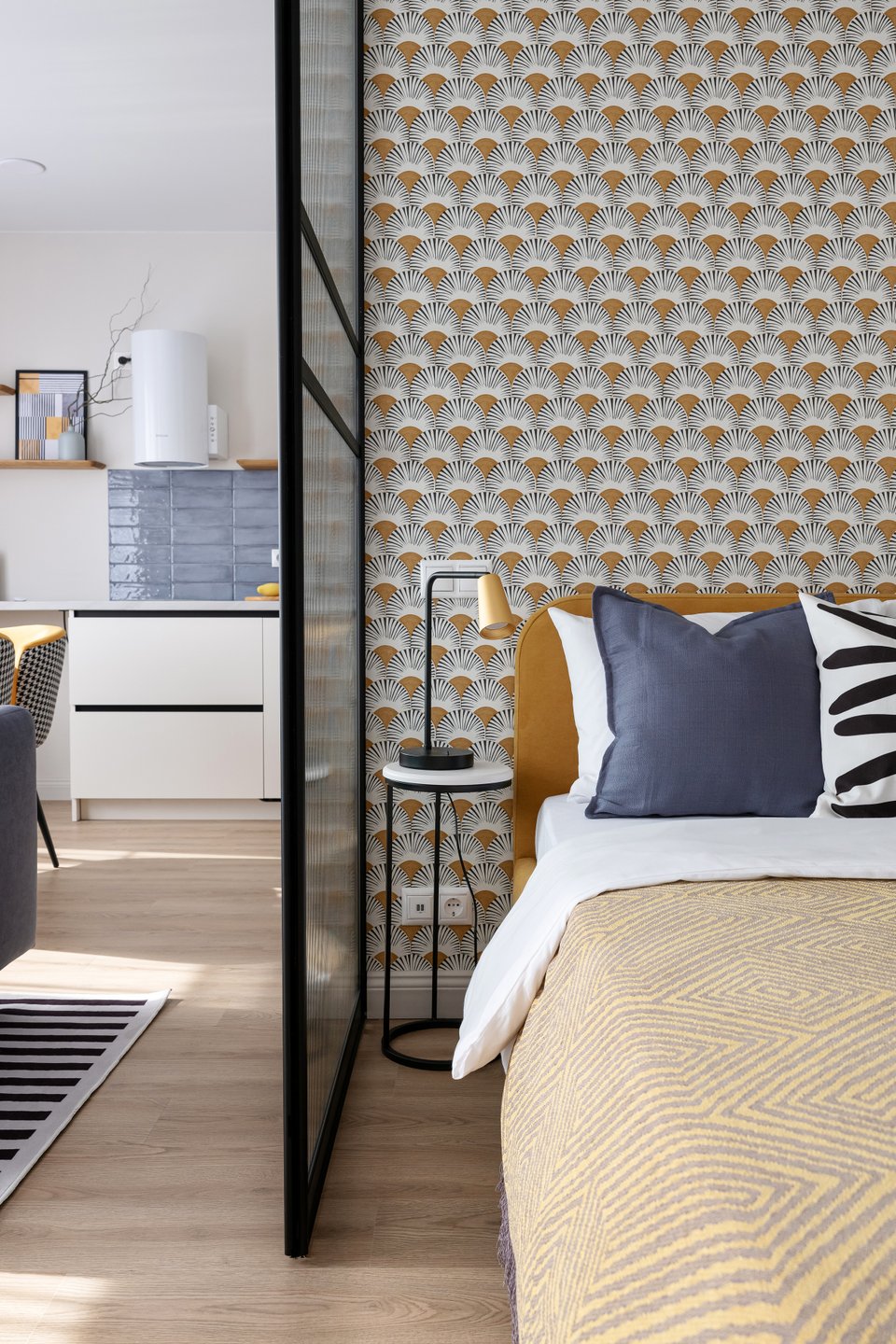 На фото: однушка 39 кв.м, ЖК «Level Причальный». В кадре кровать Эби 140 от divan.ru. Дизайнеры: Юнна Лукинских и Наталья Пеле, студия Yuloo Studio; фотограф: Роман Алексеев